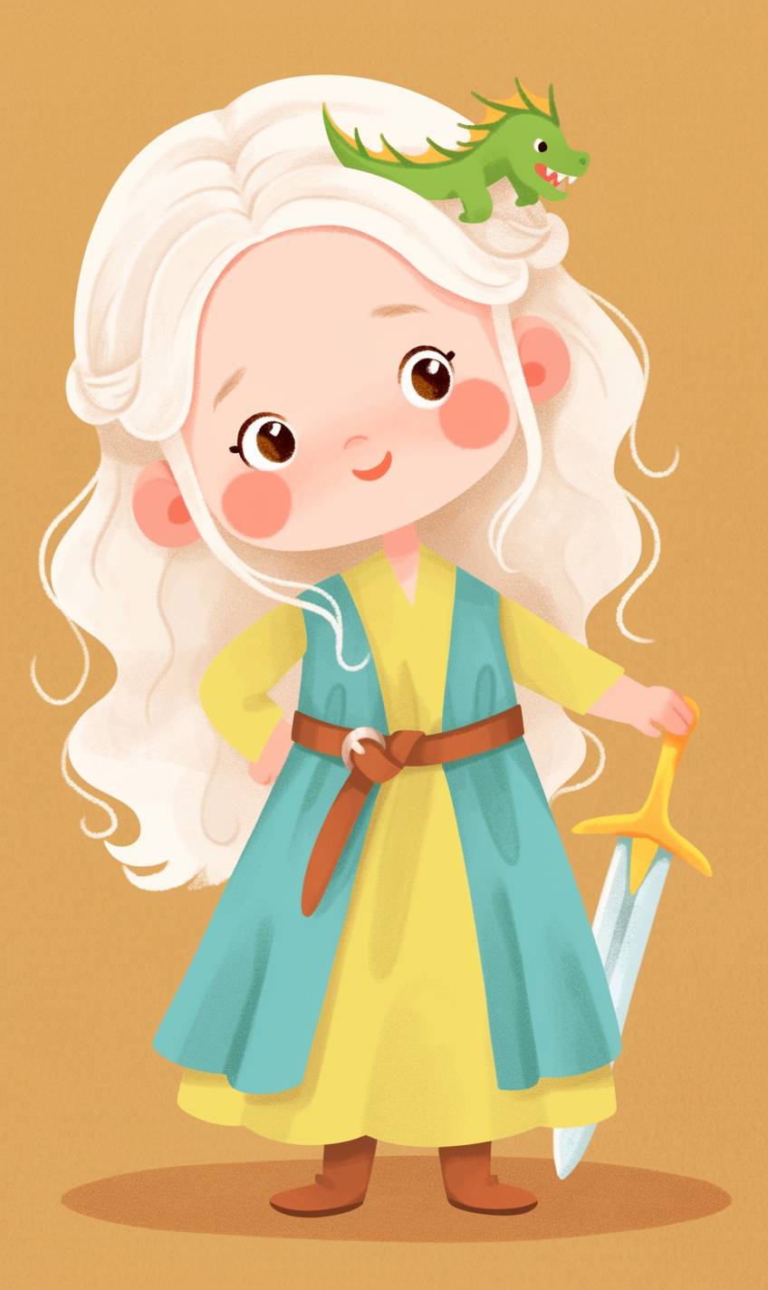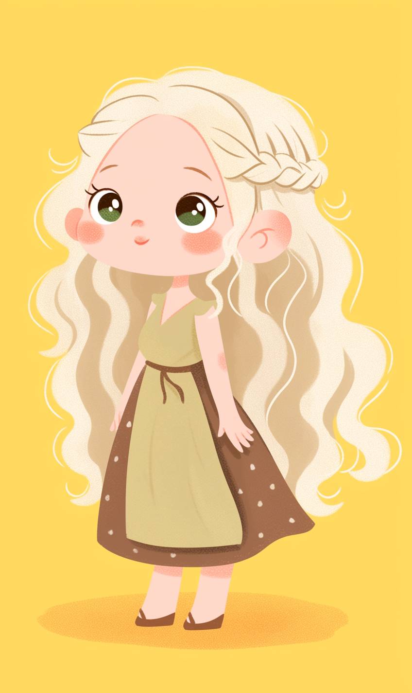 Eine einfache Zeichnung von Daenerys Targaryen im Stil von Allie Brosh mit einfachen Linien, flachen Farben und einer Strichfigur, minimalistisch, einfacher Hintergrund.