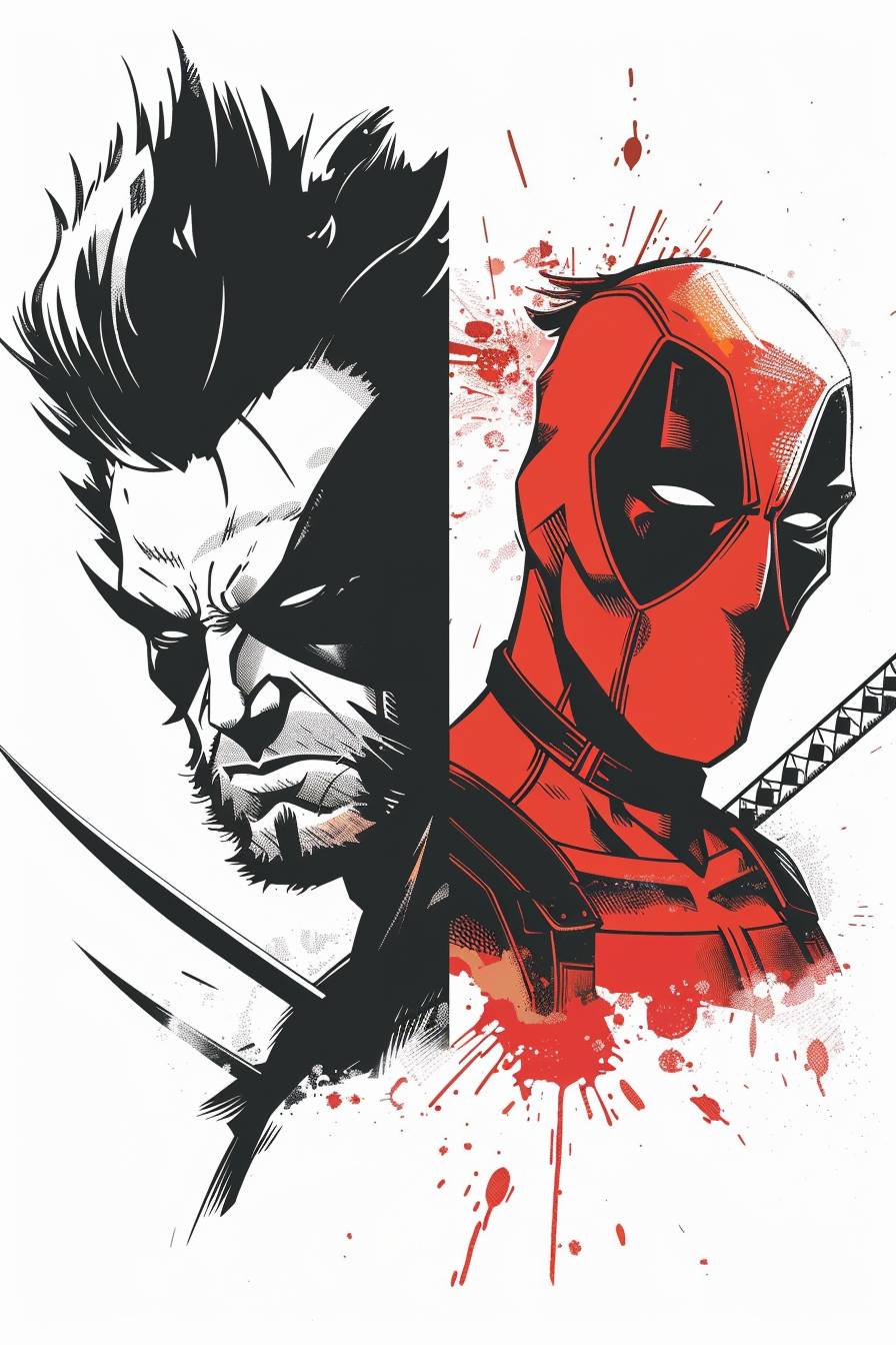 Comic-Illustration von zwei Marvel-Anime-Charakteren, einer von ihnen ist Wolverine, gespielt von Hugh Jackman ohne Maske, der andere ist Deadpool, 80er Comic-Stil, einfache Linien, amerikanische Comics, 2D, flache Illustration, sehr zeitgemäß.