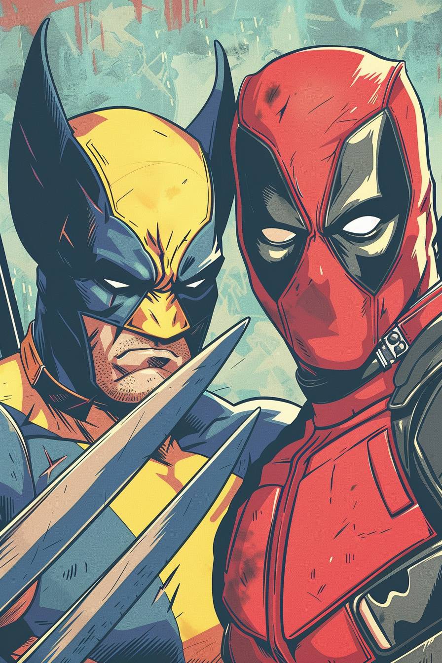 Comic book illustration of two Marvel anime characters, one of them is Wolverine played by Hugh Jackman without a mask, the other is Deadpool, 80's comic book style, simple lines, American comics, 2d, flat illustration, very contemporary --ar 2:3 --v 6.0