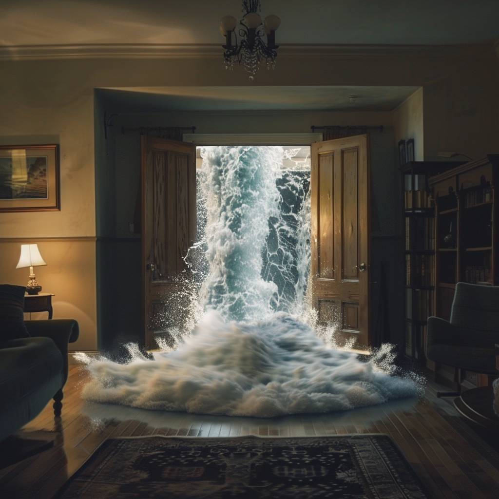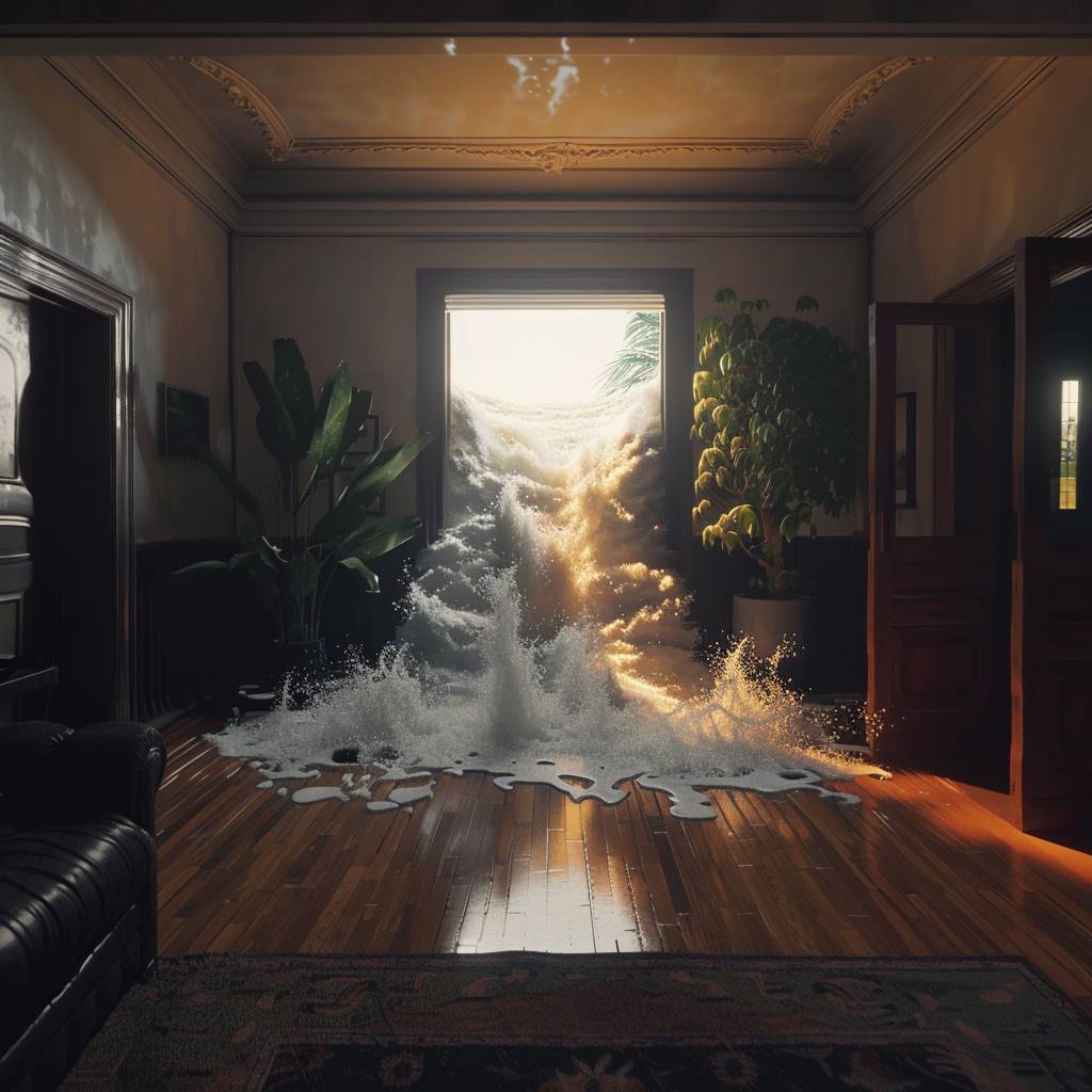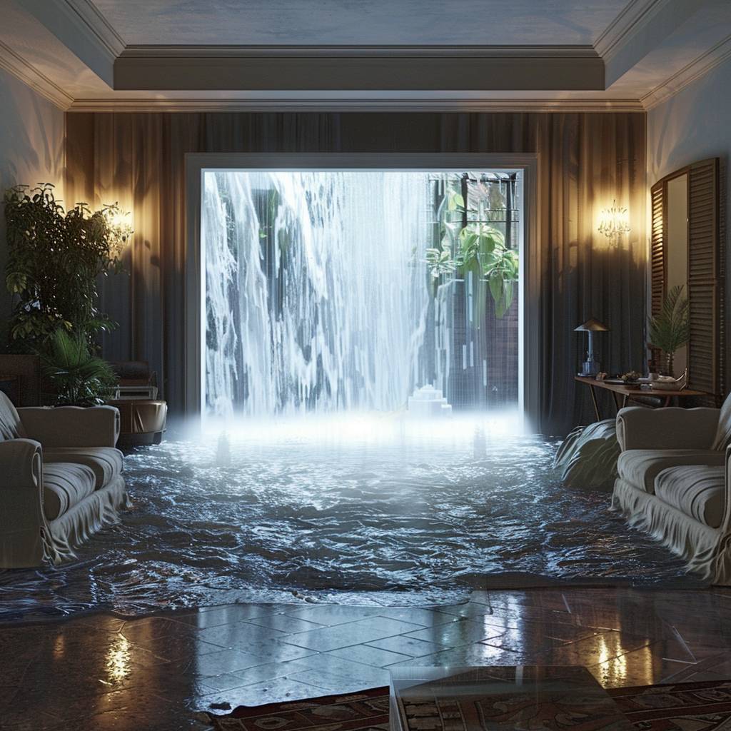 A first-person POV shot rapidly flies through open doors to reveal a surreal waterfall cascading in the middle of the living room. --v 6.0