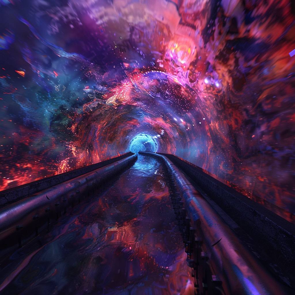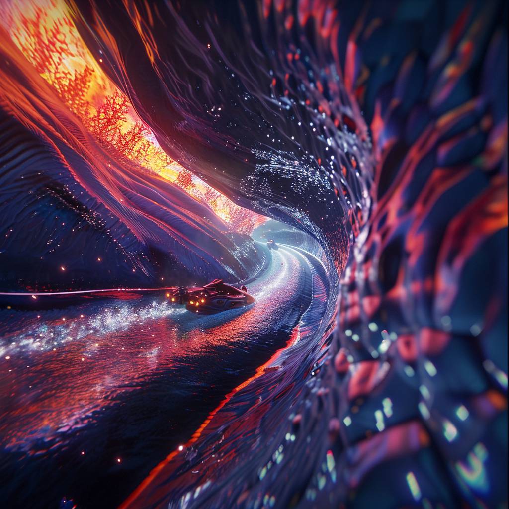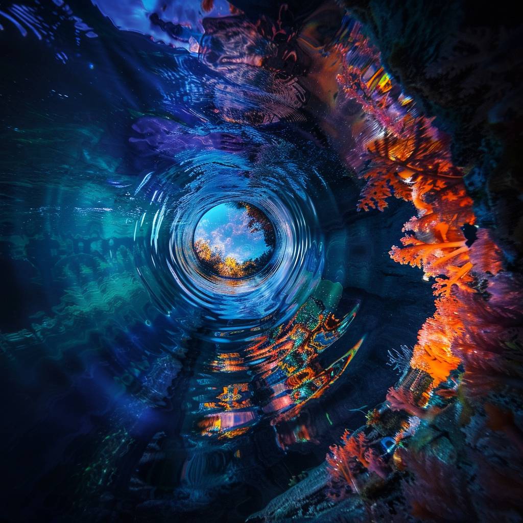Eine FPV-Aufnahme, die durch einen Tunnel in einen lebhaften Unterwasserraum zoomt.