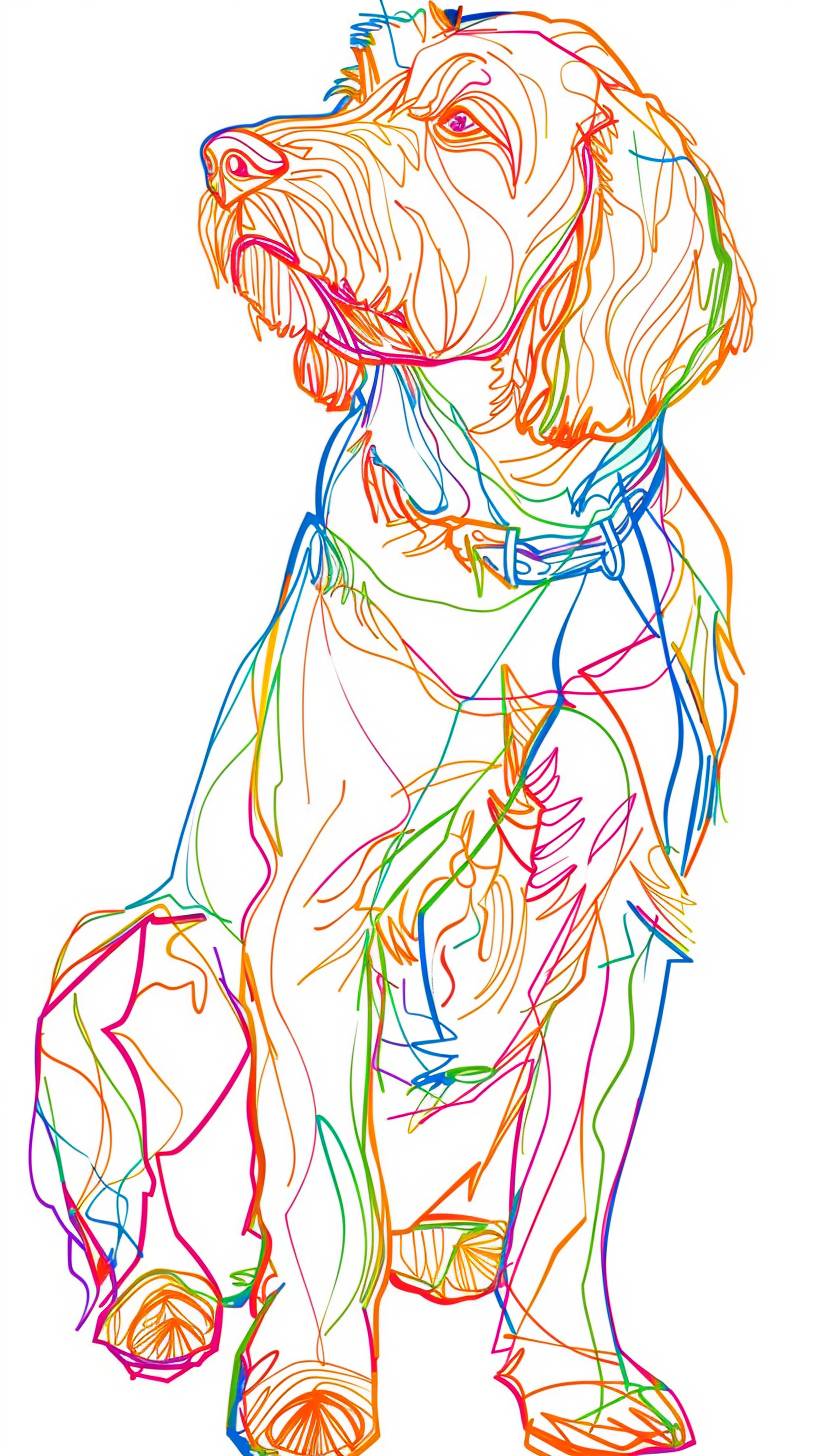 A drawing of a Goldendoodle dog showing the full body, in one-line drawing, figure outline only, single line, simple, in the style of one-line, single line drawing, black line on white background, colorful, no background, clean lines, minimalistic, simple, Picasso one line drawing war and peace style --ar 9:16 --v 6.0