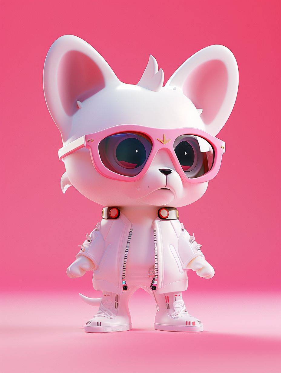 3D C4D NFT Blender, Chibi, Pop Mart, anthropomorphism, character ip, puppy wearing sunglasses is very cool, puppy has a sense of technology and intelligence, dressing should not be very complicated, no background, award-winning works --ar 3:4 --style raw