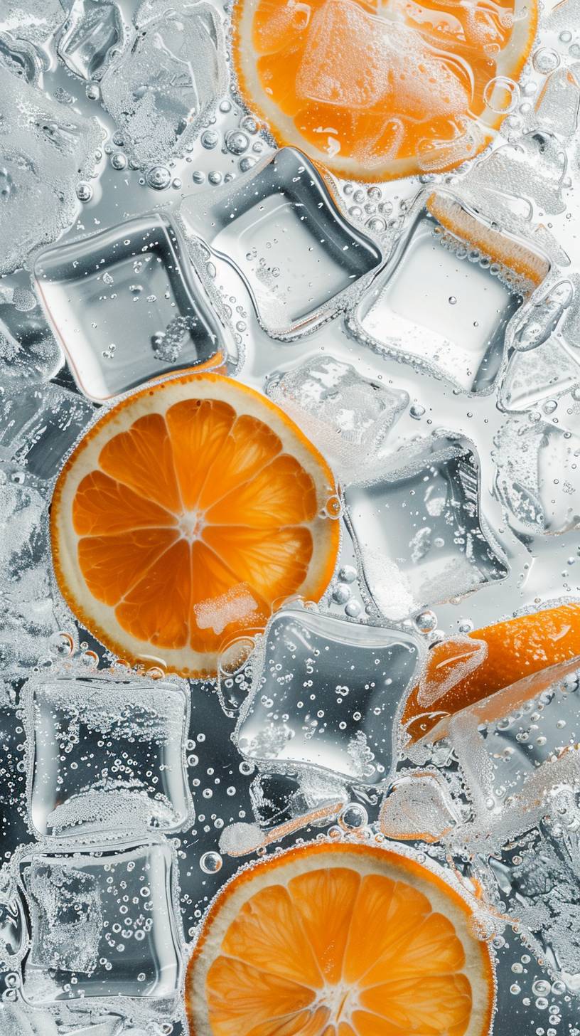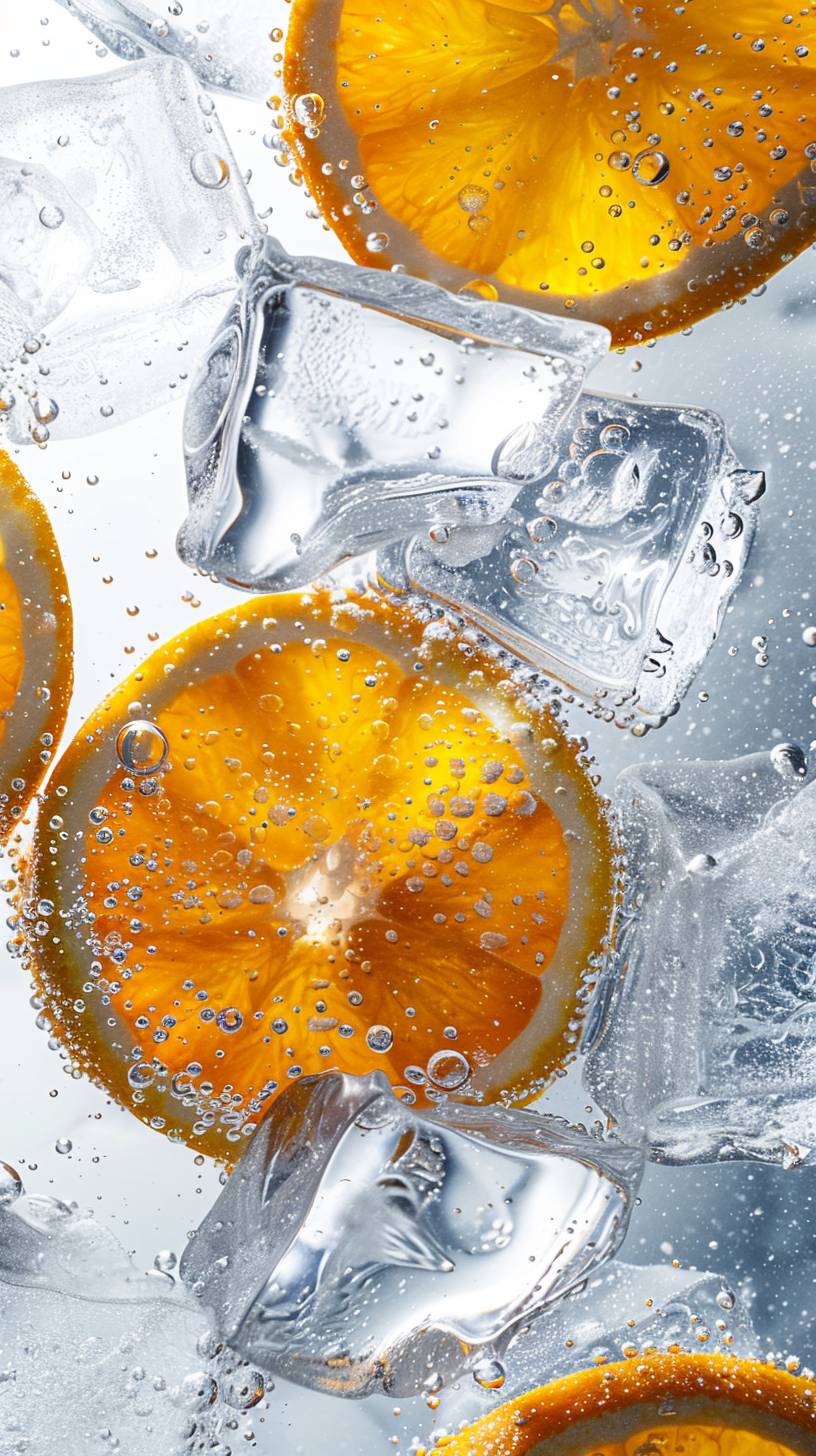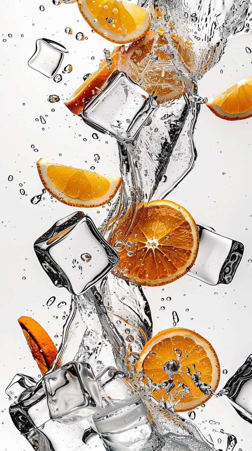 Photo of a mix of sparkling water, ice cubes and oranges on a white background, shot in high resolution and studio close-up lighting, in a style similar to Canon EOS, Ultra HD phone wallpaper --ar 9:16 --stylize 50 --v 6.0