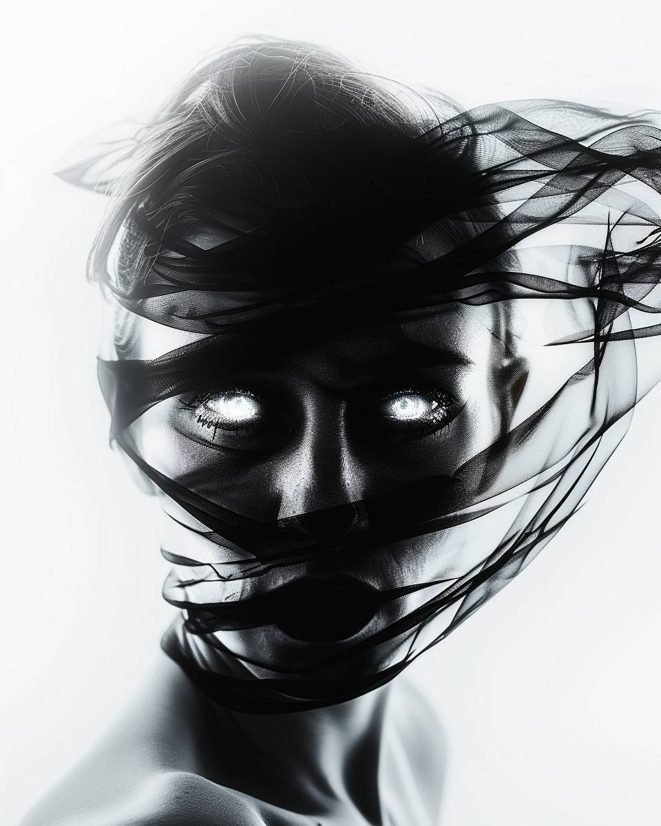 Erstellen Sie ein Porträt, das das Wesen der Angst im spektralen Surrealismus-Stil erfasst, und verwenden Sie Schatten-Schwarz und gespenstisches Weiß, um spektrale Lichtphänomene darzustellen. Setzen Sie Doppelbelichtungstechniken ein und erkunden Sie kreative, unkonventionelle Winkel, um die tiefe, geschichtete Natur der Angst auf eine ätherische und lebendige Weise auszudrücken.