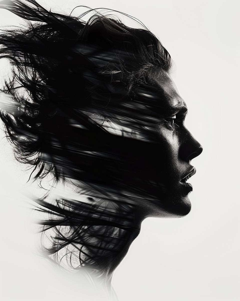 Create a portrait capturing the essence of fear in the Spectral Surrealist style, using a shadow black and ghostly white to depict spectral light phenomena. Employ double exposure techniques and explore creative, unconventional angles to express the deep, layered nature of fear in an ethereal and vivid manner --no frame,crop --ar 4:5 --style raw --personalize a59ln1m --v 6.0