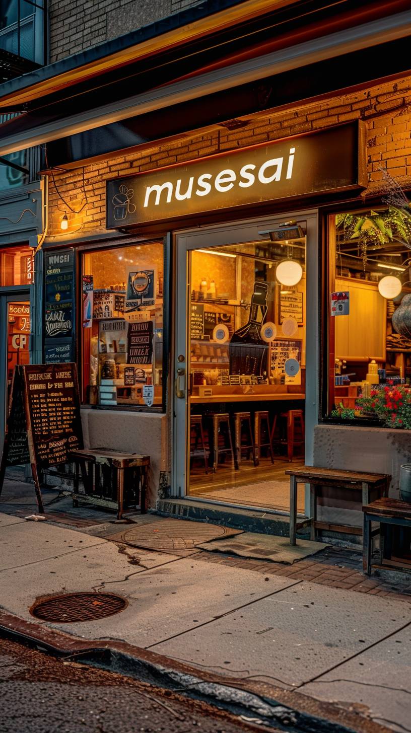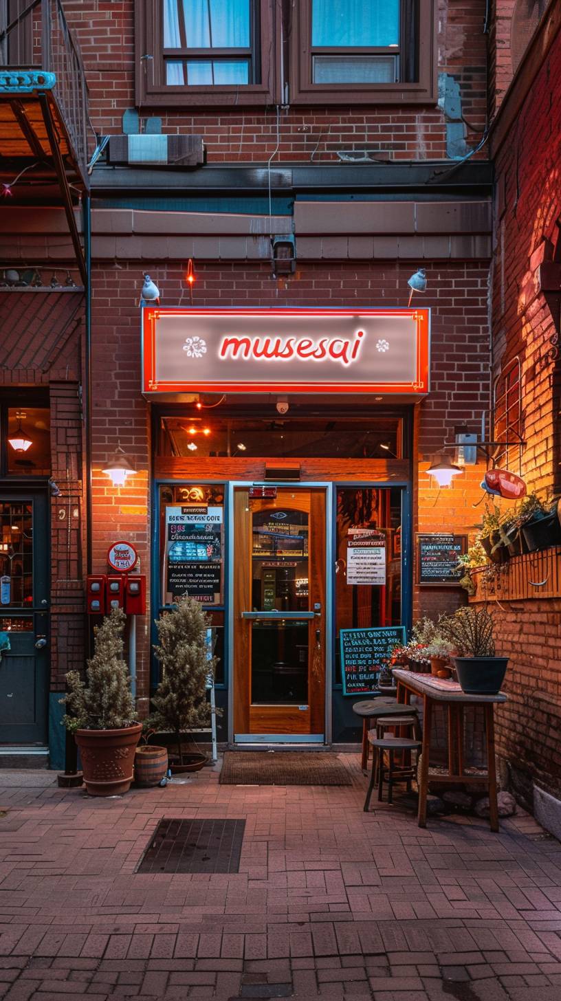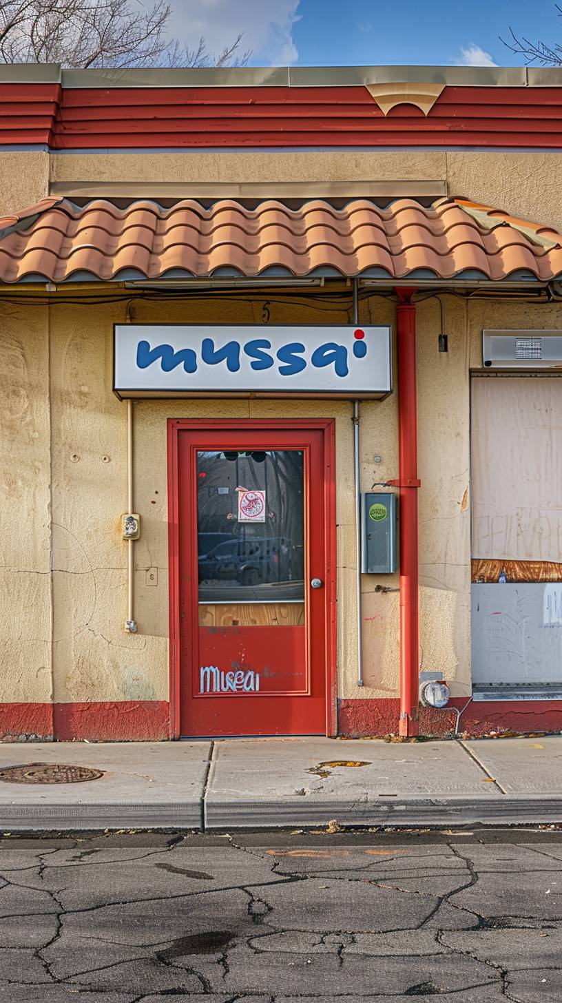 An image of the exterior of a small burrito shop in Denver in 1993, with a simple sign reading "musesai" above the door.photorealistic, 8k, natural lighting, HDR, shot on IMAX laser, --ar 9:16 --v 6.0
