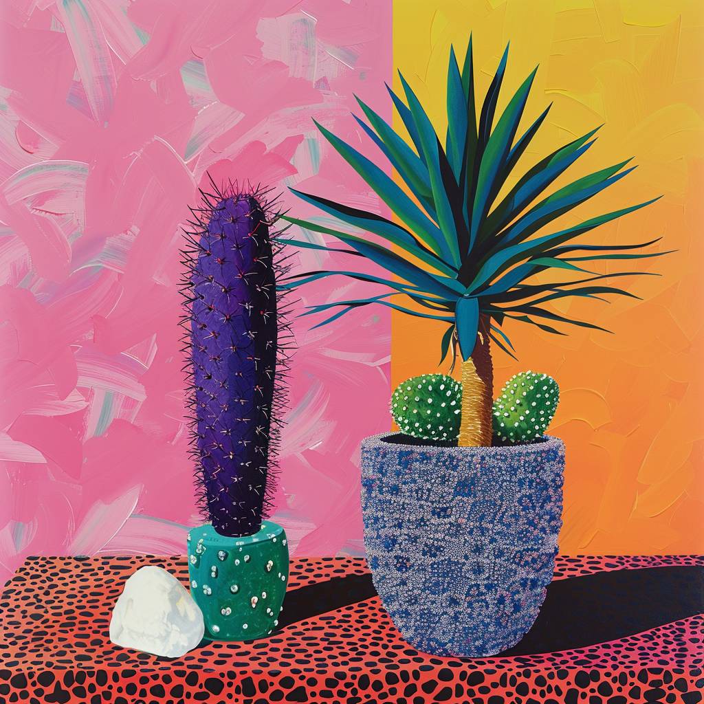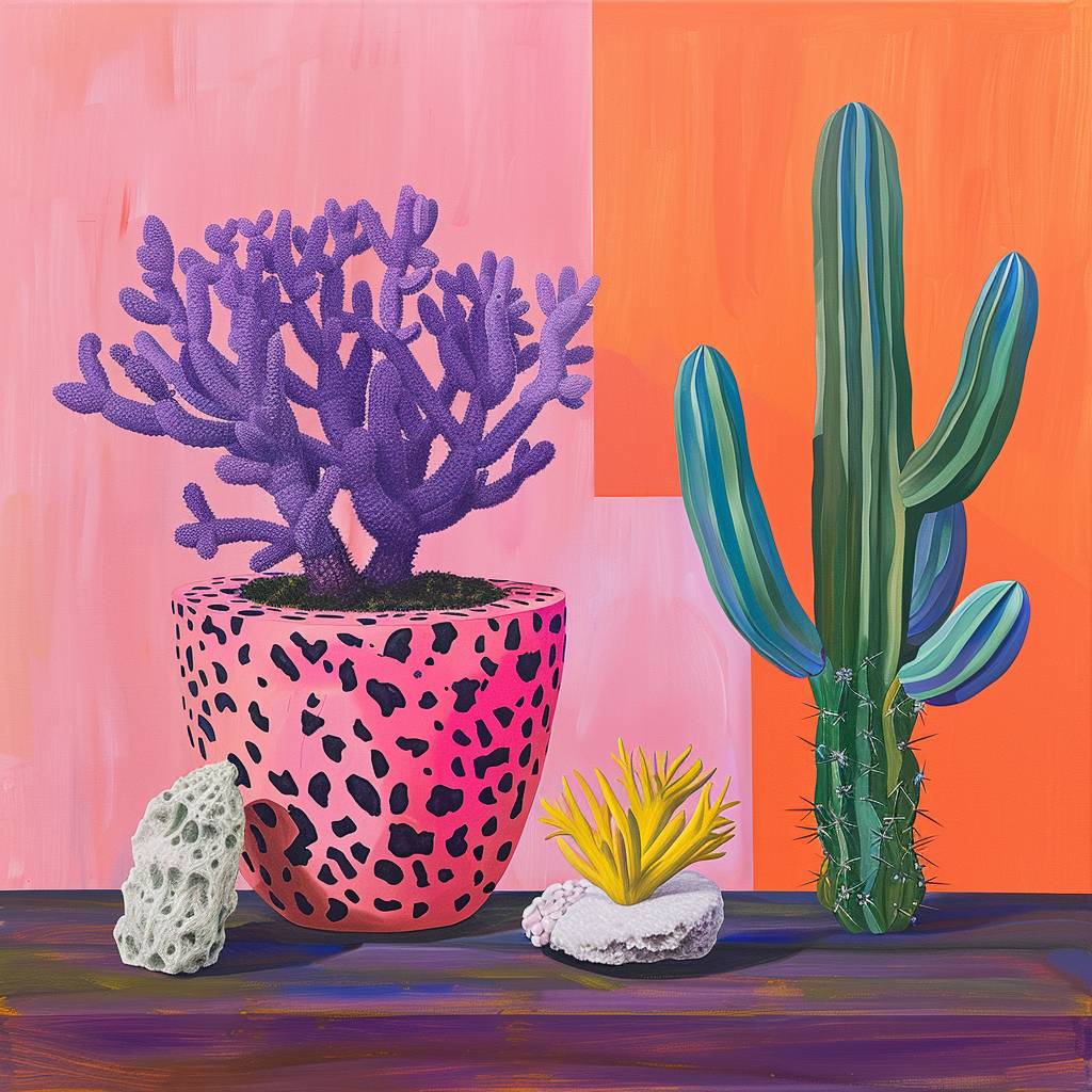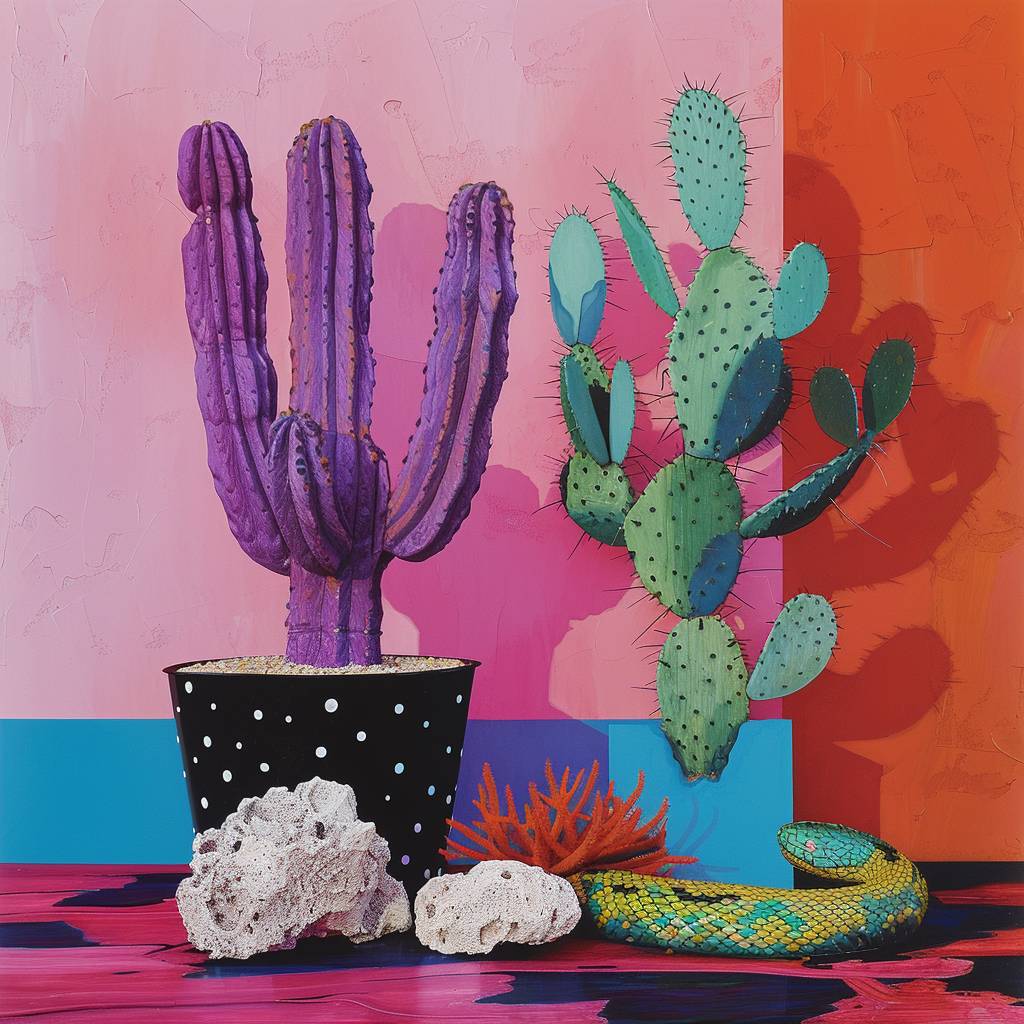 Eine lila Kaktuspflanze vor einem pinken Hintergrund, mit einigen weißen Steinen auf dem Tisch daneben, im Stil von David Hockney, helle Farbpalette, eine Palme steht in einem großen Topf mit schwarzen Punkten, bunter Hintergrund, eine kleine Skulptur aus Plastikmaterial, die Korallenfelsen und Muscheln ähnelt, kräftige Farben, ein Gemälde mit einem braunen Holzboden an seiner Basis, eine lebendige grüne, schlangenförmige tropische Pflanze steht neben den blau-grünen Blättern einer anderen grünen Zierblume, im Stil des Künstlers David Hockney, helle Farben, hoher Kontrast.