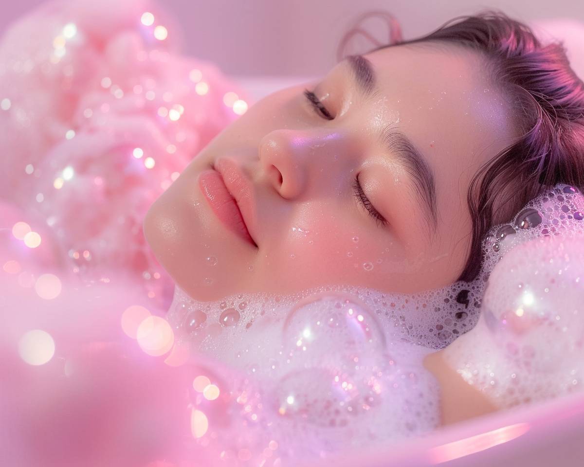 a beautiful white ivory bathtub filled with pink soap bubbles foam, woman head resting on the edge of the bathtub, peaceful expression, interior scene, iridescent hues --style raw --ar 5:4 --v 6.0