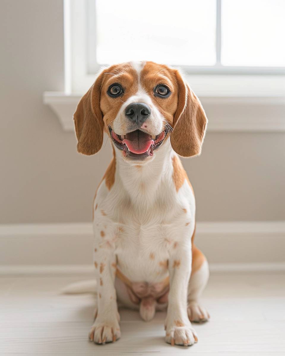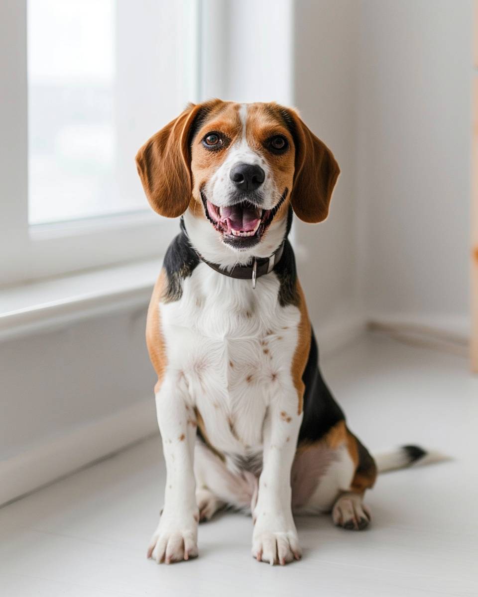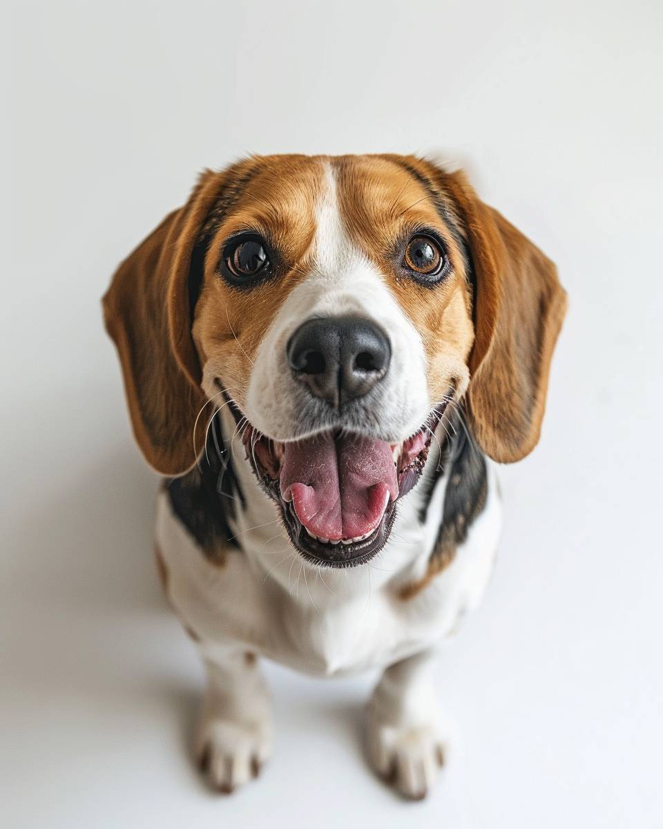 Sony Alpha a7R IV portrait photography style, photo of a happy beagle, sitting on floor, white background, 24mm f11 --ar 4:5 --style raw --v 6.0