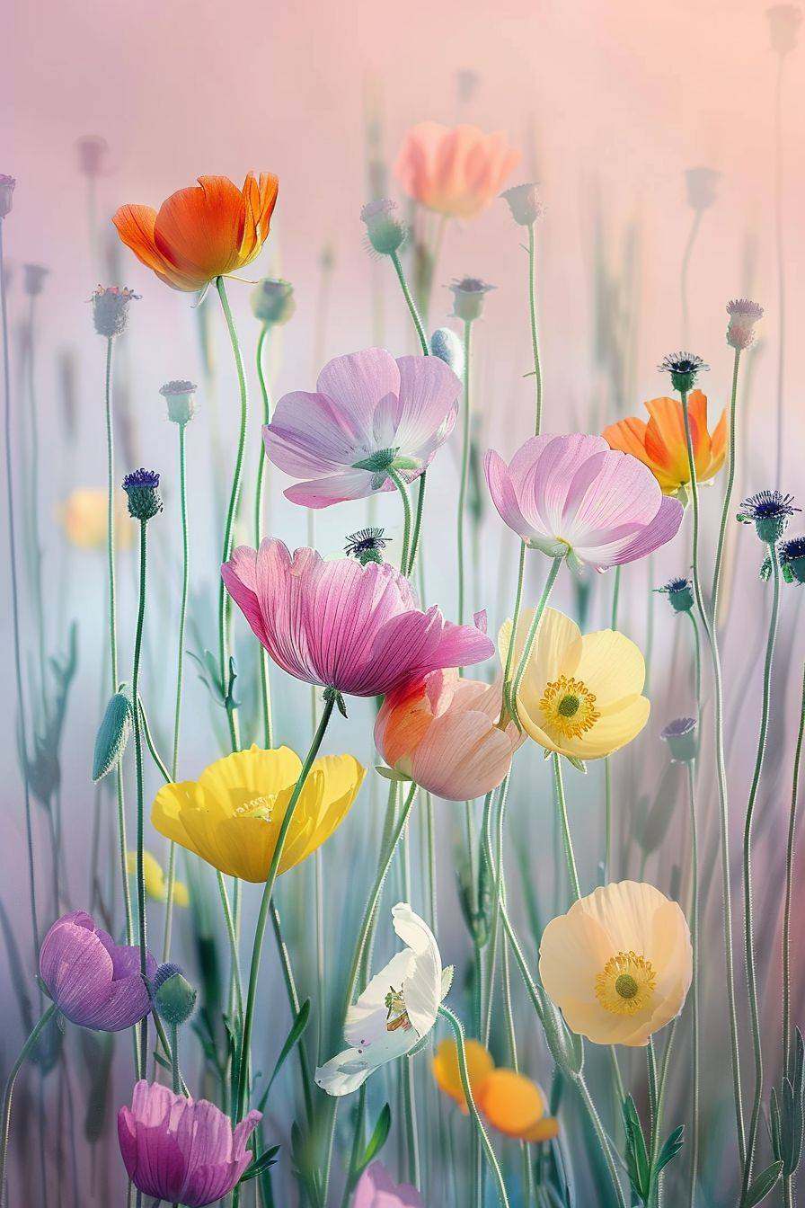 Im sanften Licht eines Sommermorgen blühen bunte Blumen auf der Wiese und schaffen pastellfarbene Traumlandschaften.