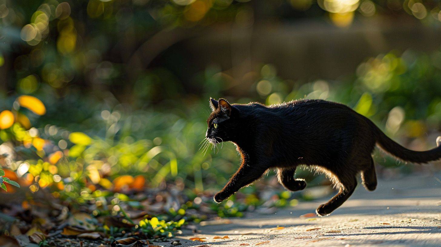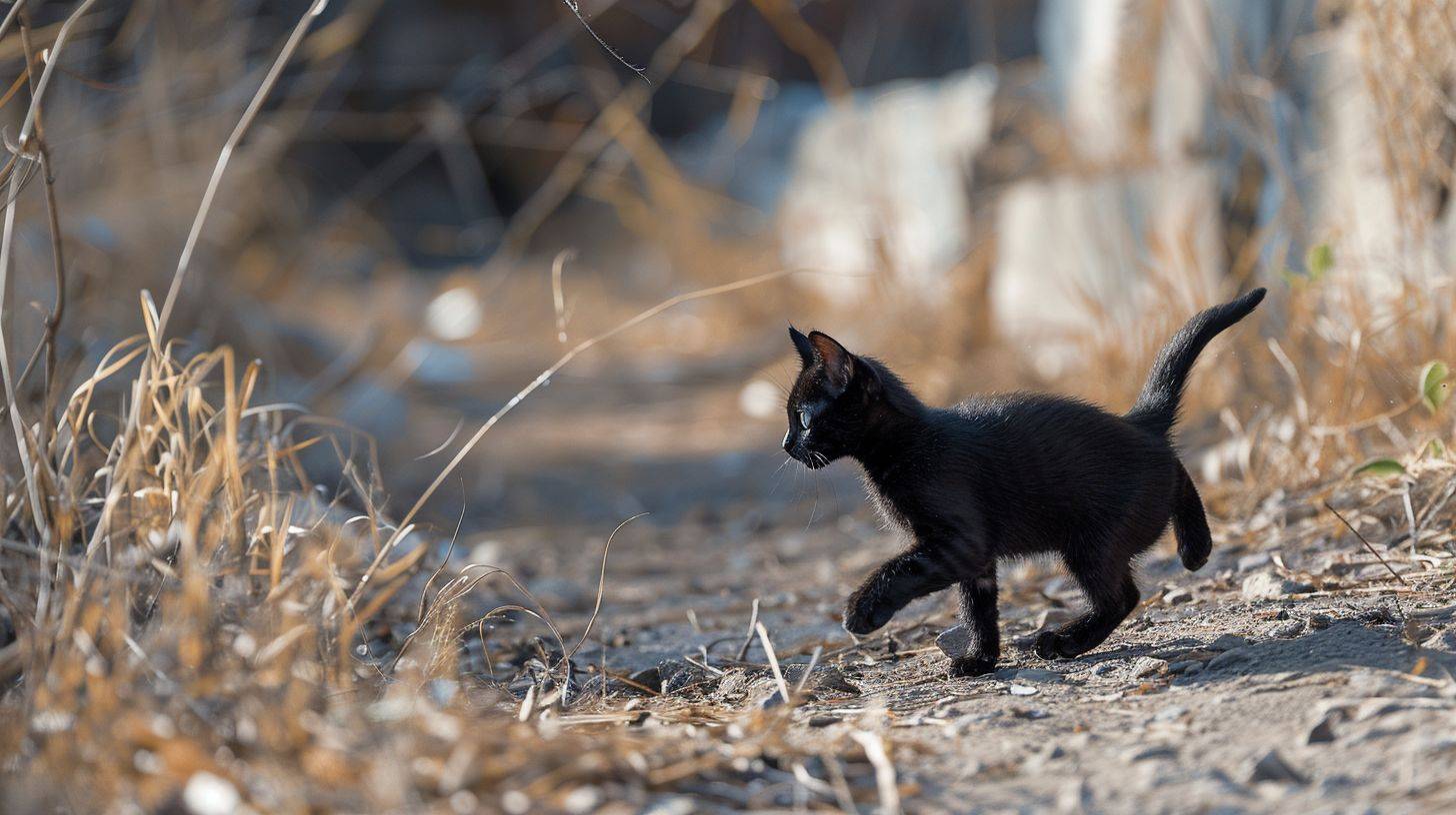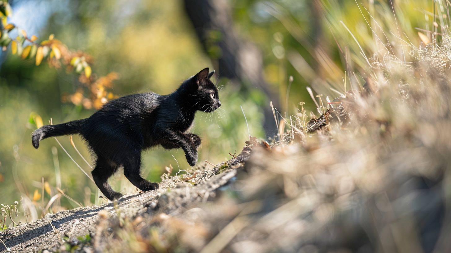 A little black cat runs to the left on a clean embankment,side view, flat angle,Surrealism,Nikon D850, Nikkor AF-S 24-70mm f/7.0E ED VR,high detailed--style raw --ar 16:9