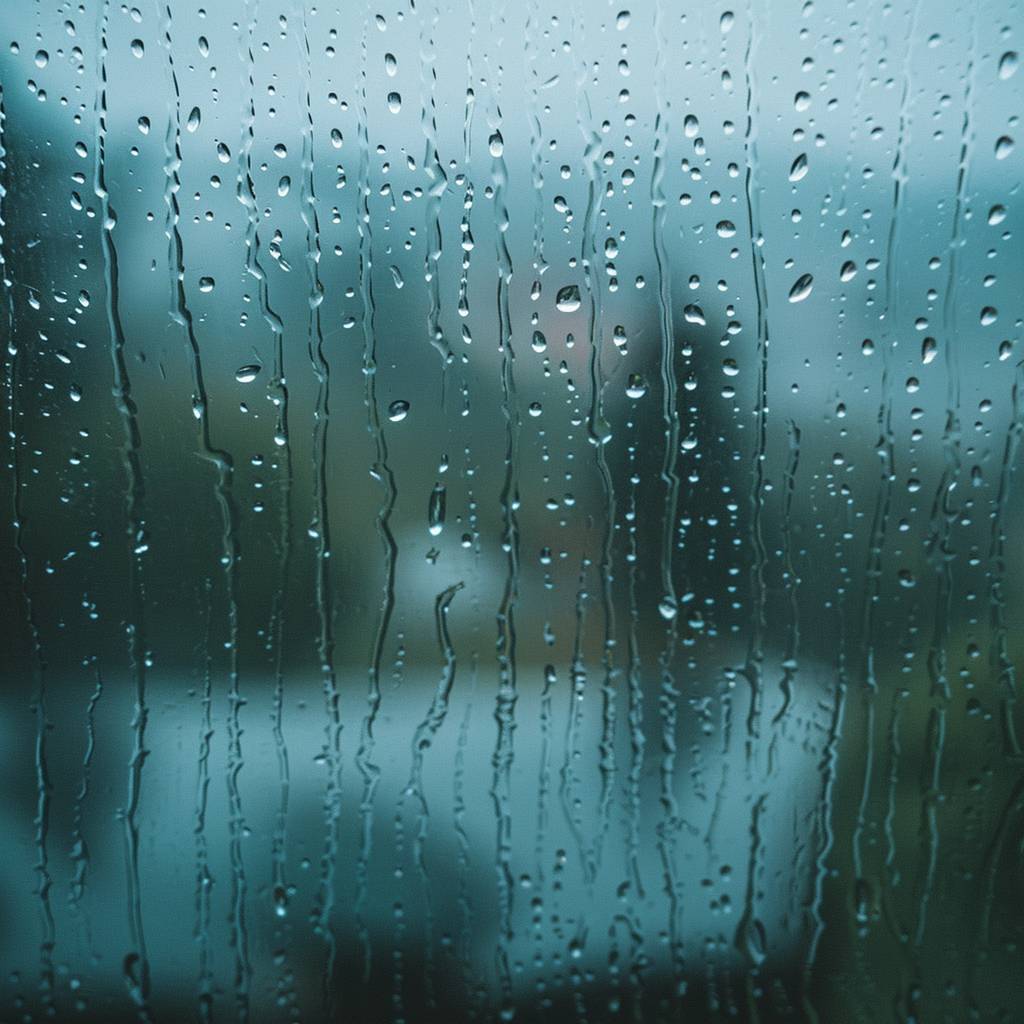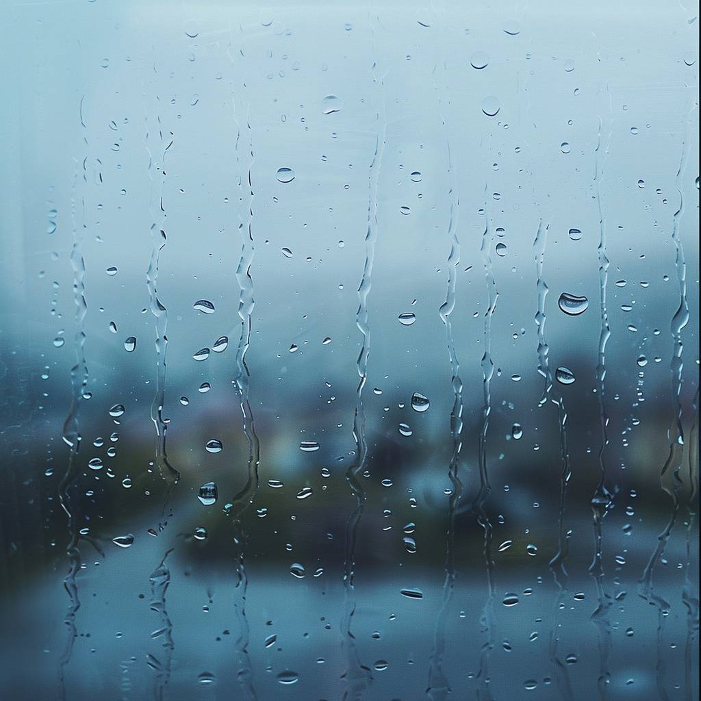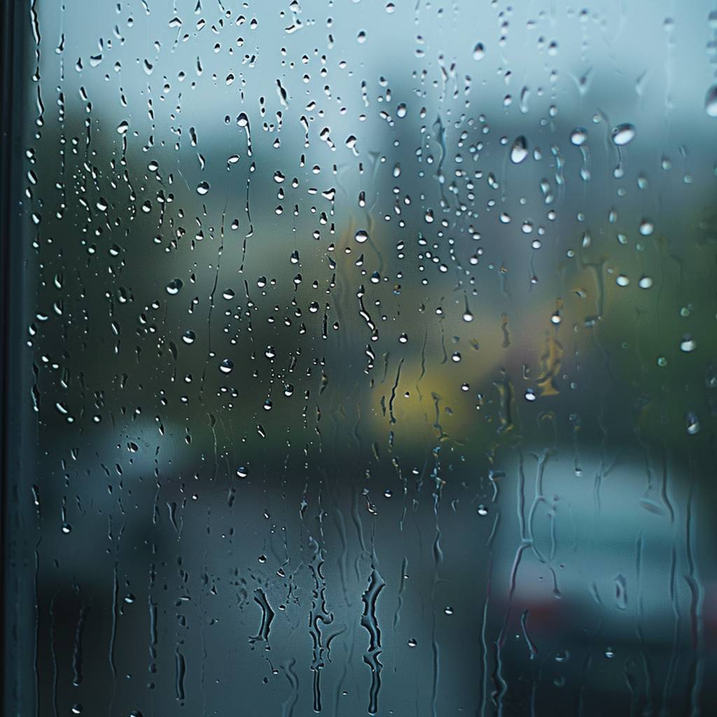 Ein fotorealistisches Bild eines Glasfensters an einem regnerischen, nebligen Tag, das Fenster mit Wassertropfen bedeckt, eine einfache [Thema] -Form in der Mitte gezeichnet, die natürlich zu tropfen scheint, mit einer verschwommenen regnerischen Landschaft im Hintergrund.