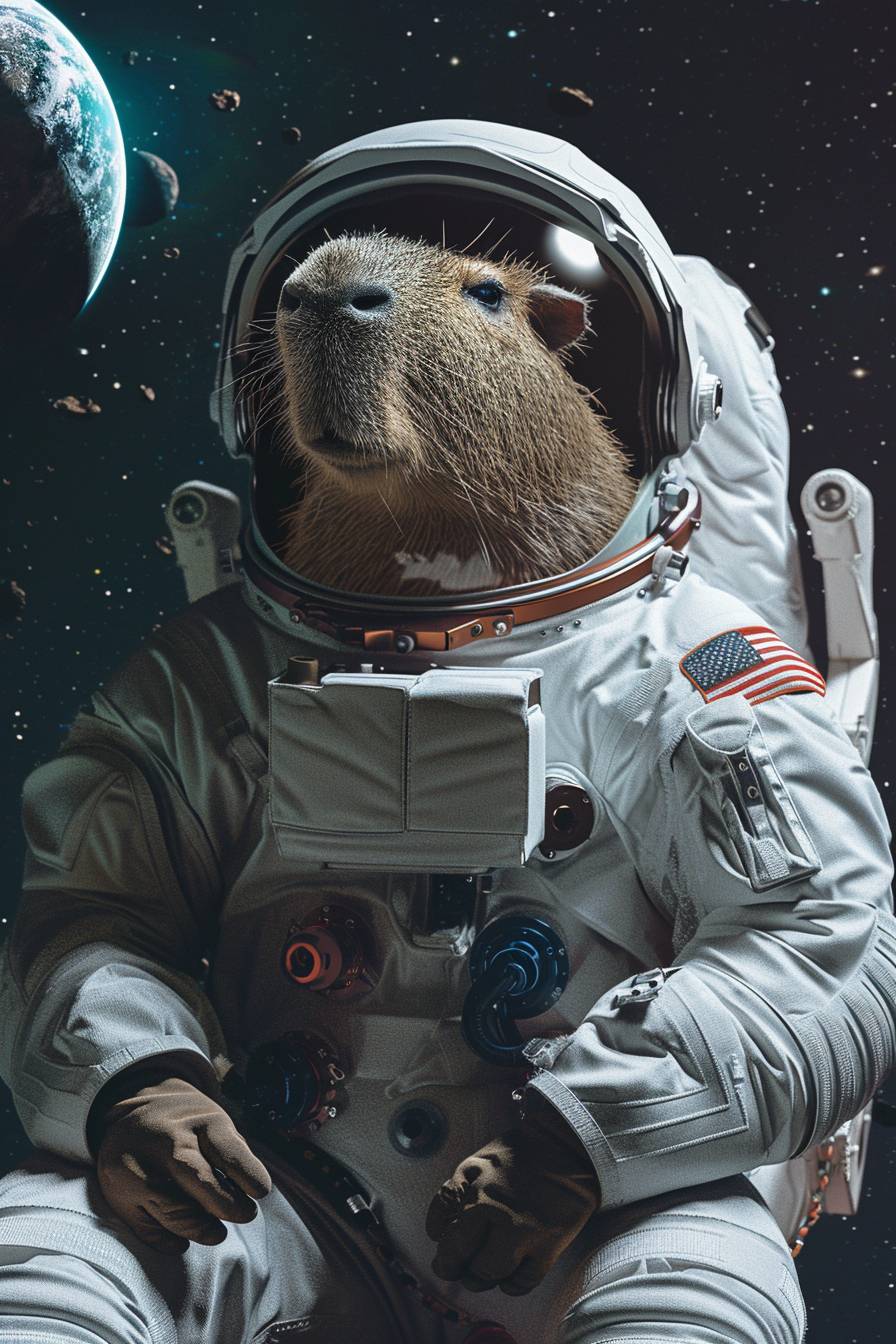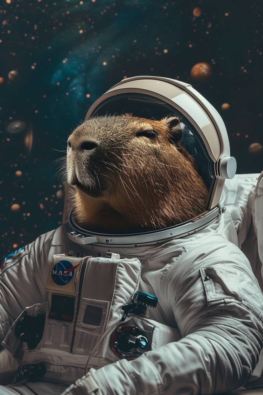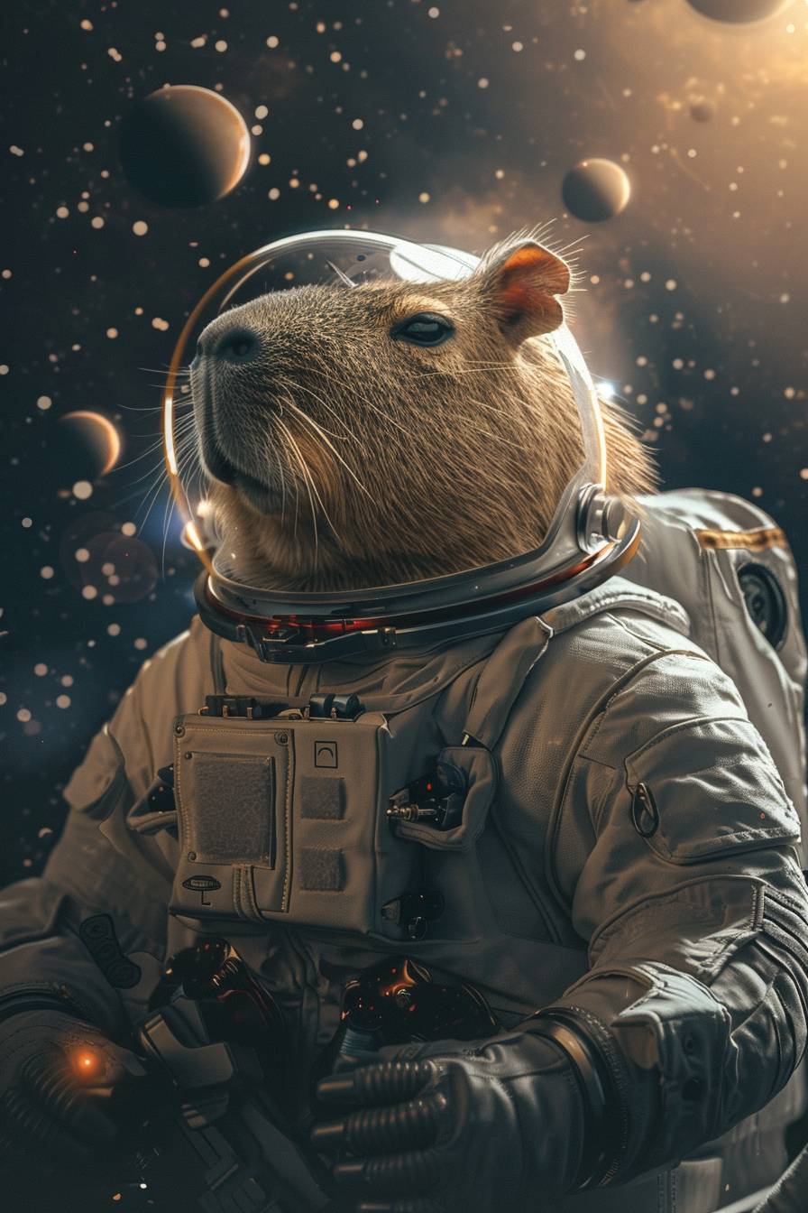 Sophisticated Capybara in the costume of an astronaut, scientist, wearing astronaut costume with astronaut helmet, floating outerspace --ar 2:3 --v 6.0