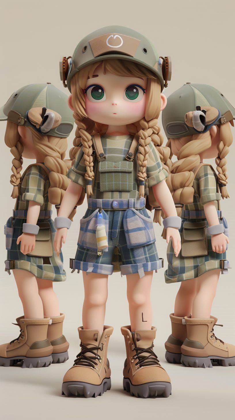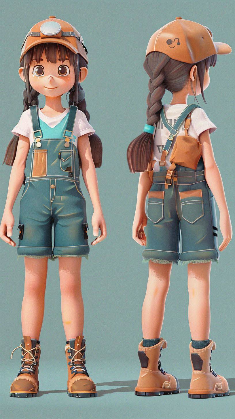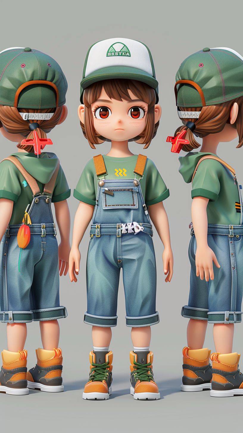 A girl with a blind box style; Full body, camping outfit, T-shirt, overalls, fisherman hat, casual sports shoes, a cartoon image of three views generated, namely front interview view, side view, and back view; Maintain consistency and uniformity, Cyberpunk, Chibi; Clean background, natural light, 8K, best quality, super detail, 3D, C4D, Blender, OC rendering, ultra high definition, 3D rendering --ar 9:16