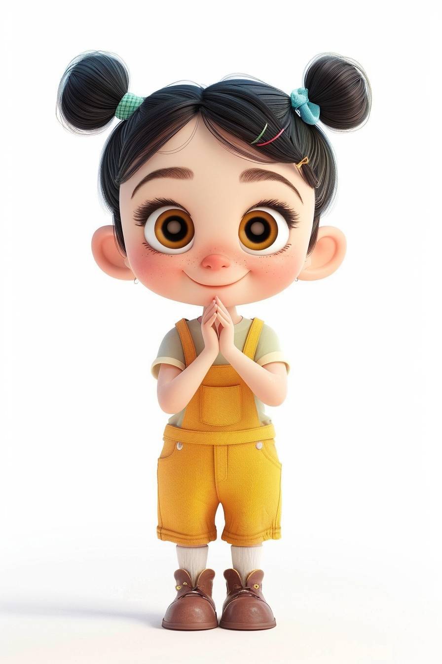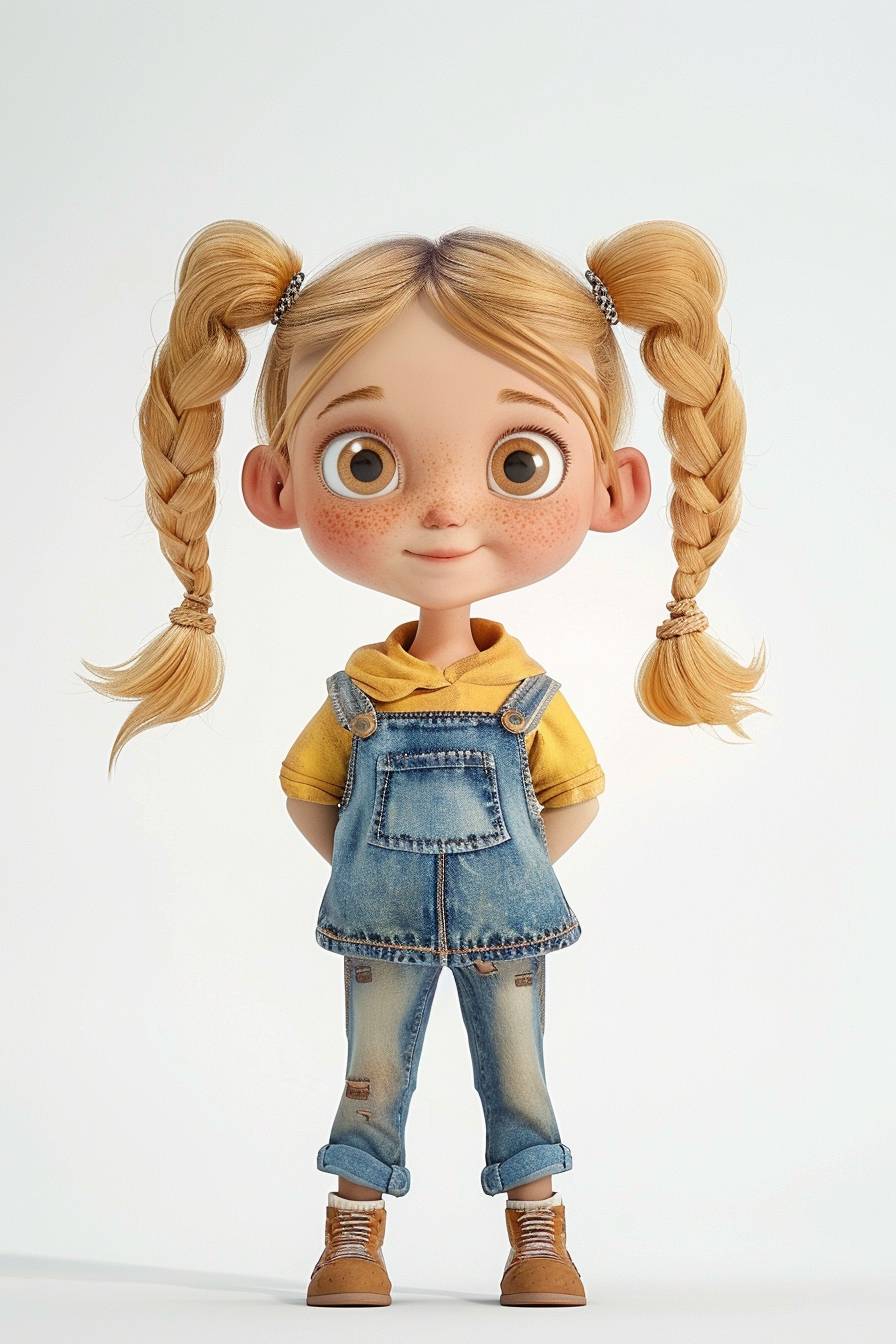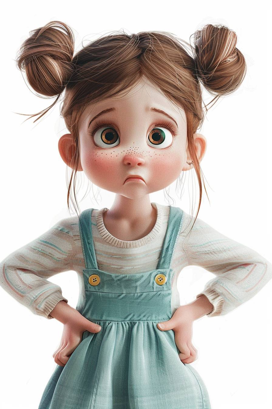 A cute little girl in pigtails purses her mouth and carries her hands behind her back, looking playful at the camera. She is a cartoon character in a simple costume with a white background --ar 2:3 --v 6.0