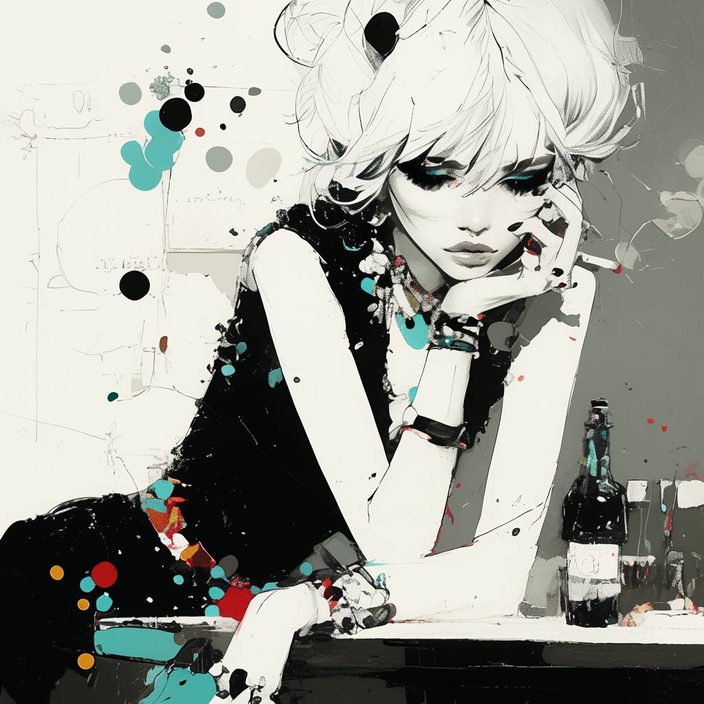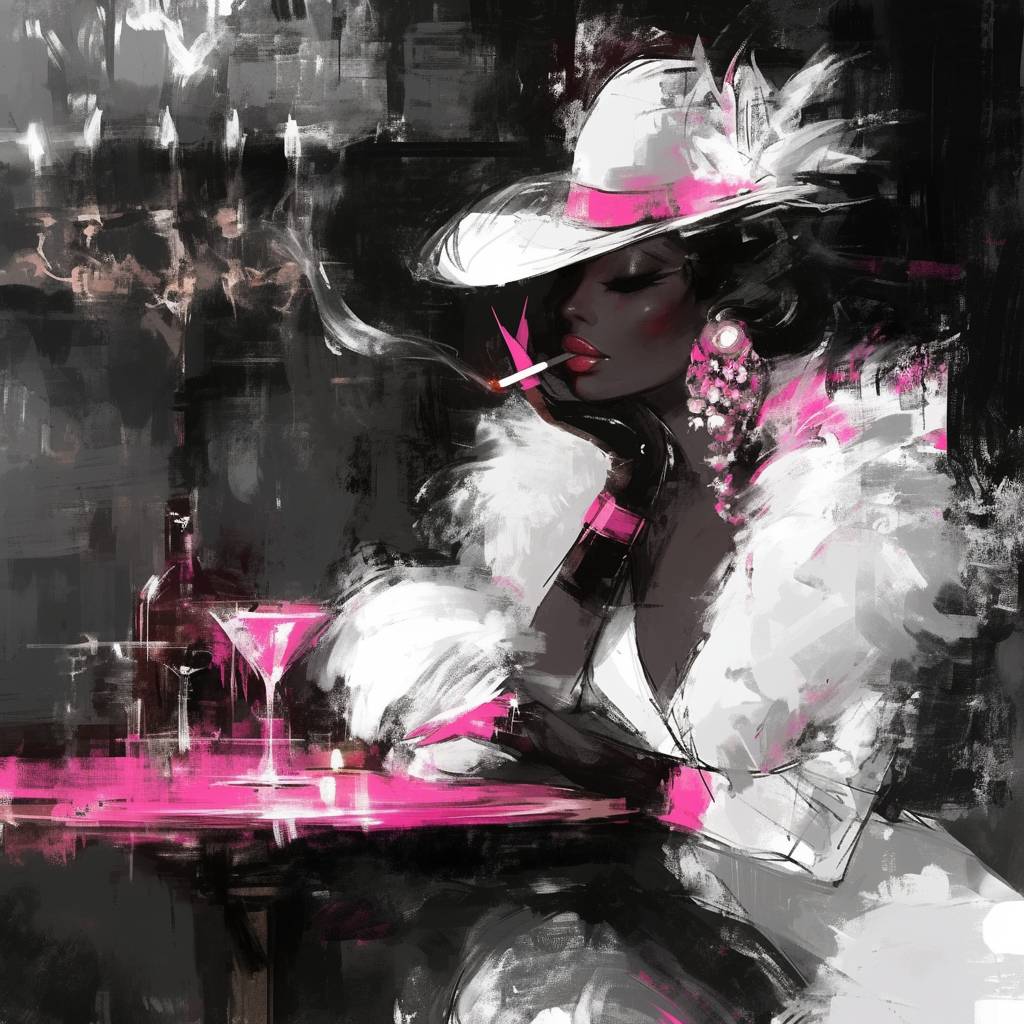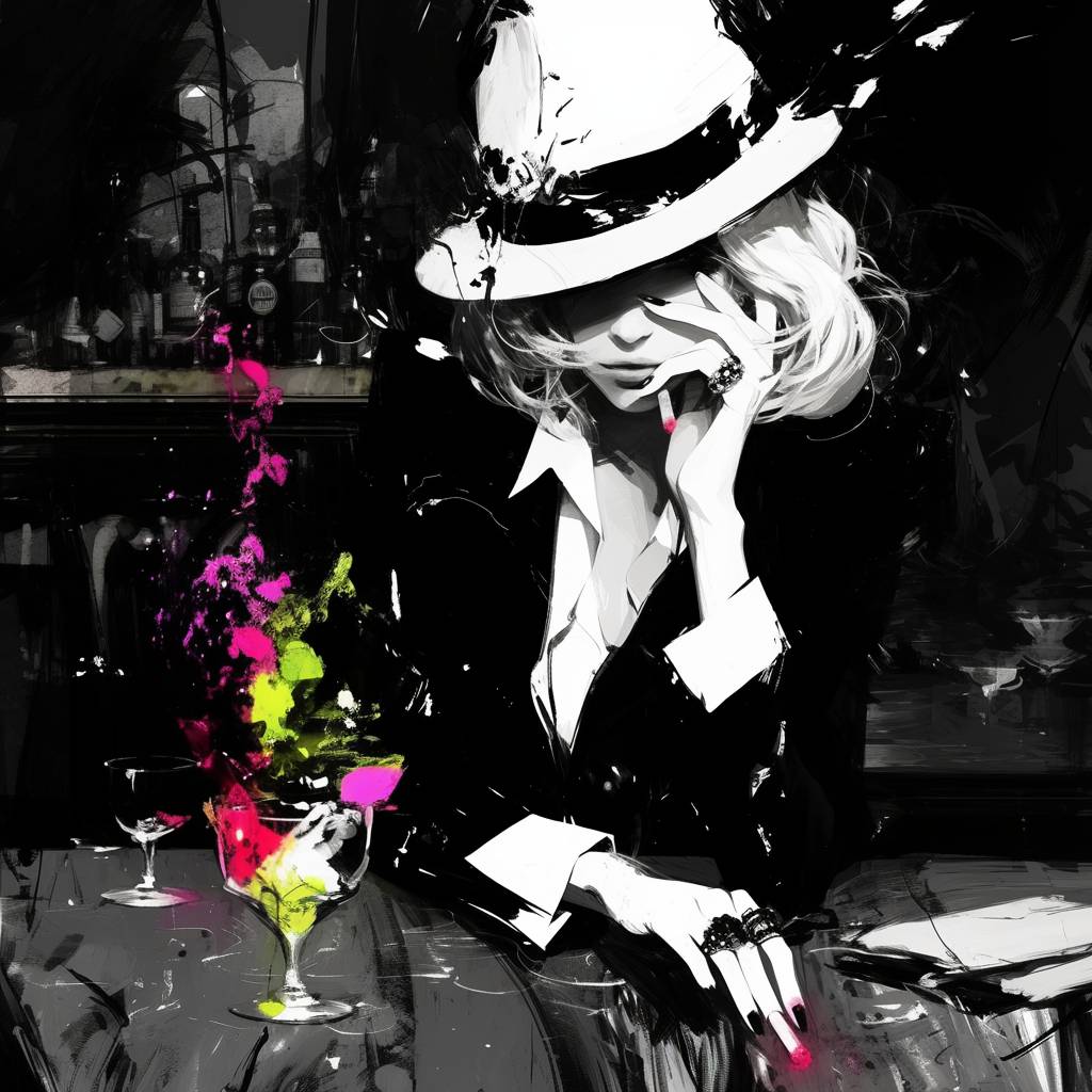 Schwarz-weiße Modemacherin raucht in einer Bar mit einem Farbtupfer