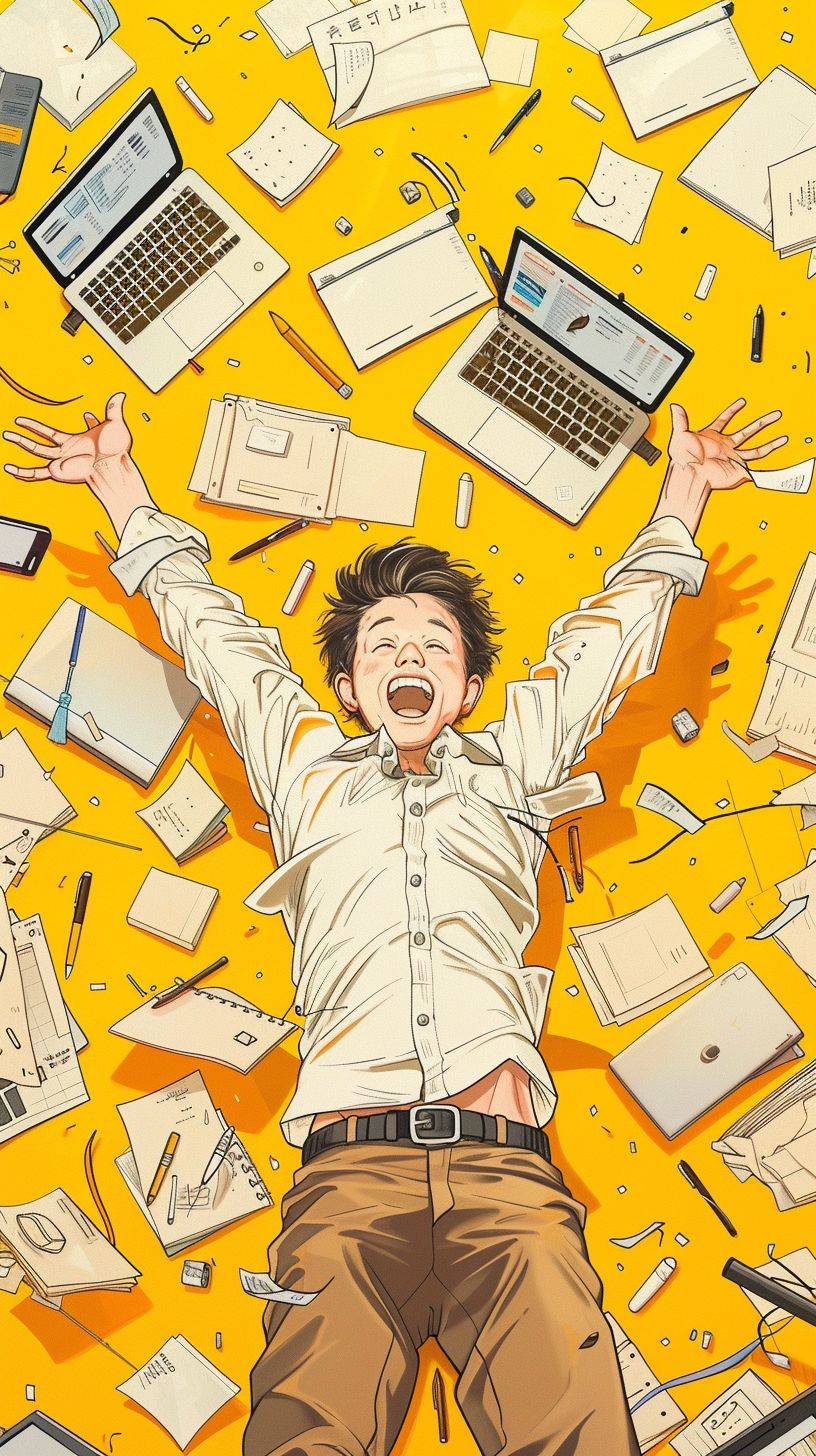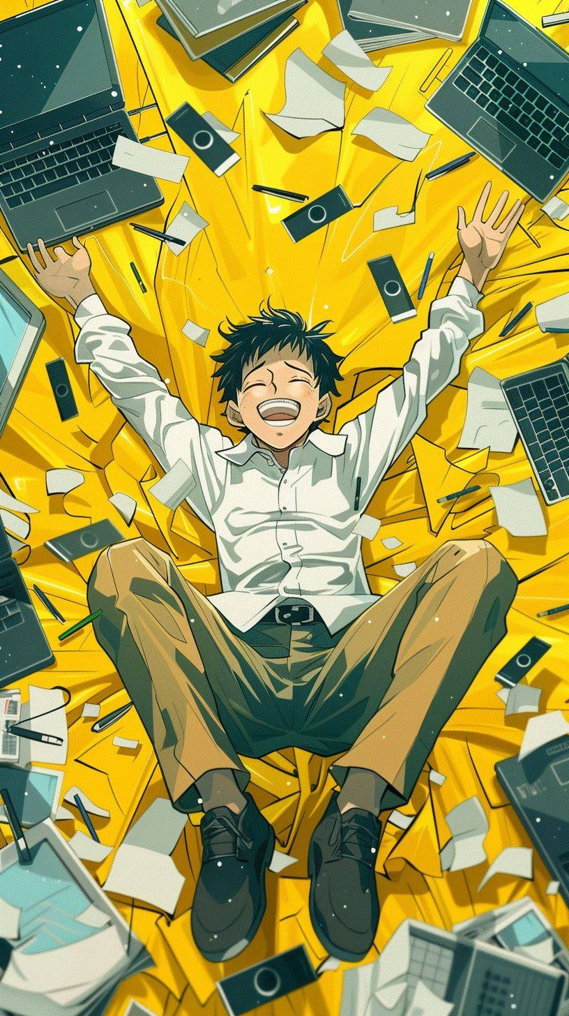 Illustrative style, visually striking, a young Oriental office boy laughs as he rushes towards the camera, surrounded by scattered laptops, pens, folders, files, and other office supplies. Fine lines are drawn, surrounded by fine lines. The middle part of the picture is a jumping yellow color, and the upper third of the picture is left blank, creating a strong contrast, dynamic, and energetic atmosphere,in clothes --ar 9:16