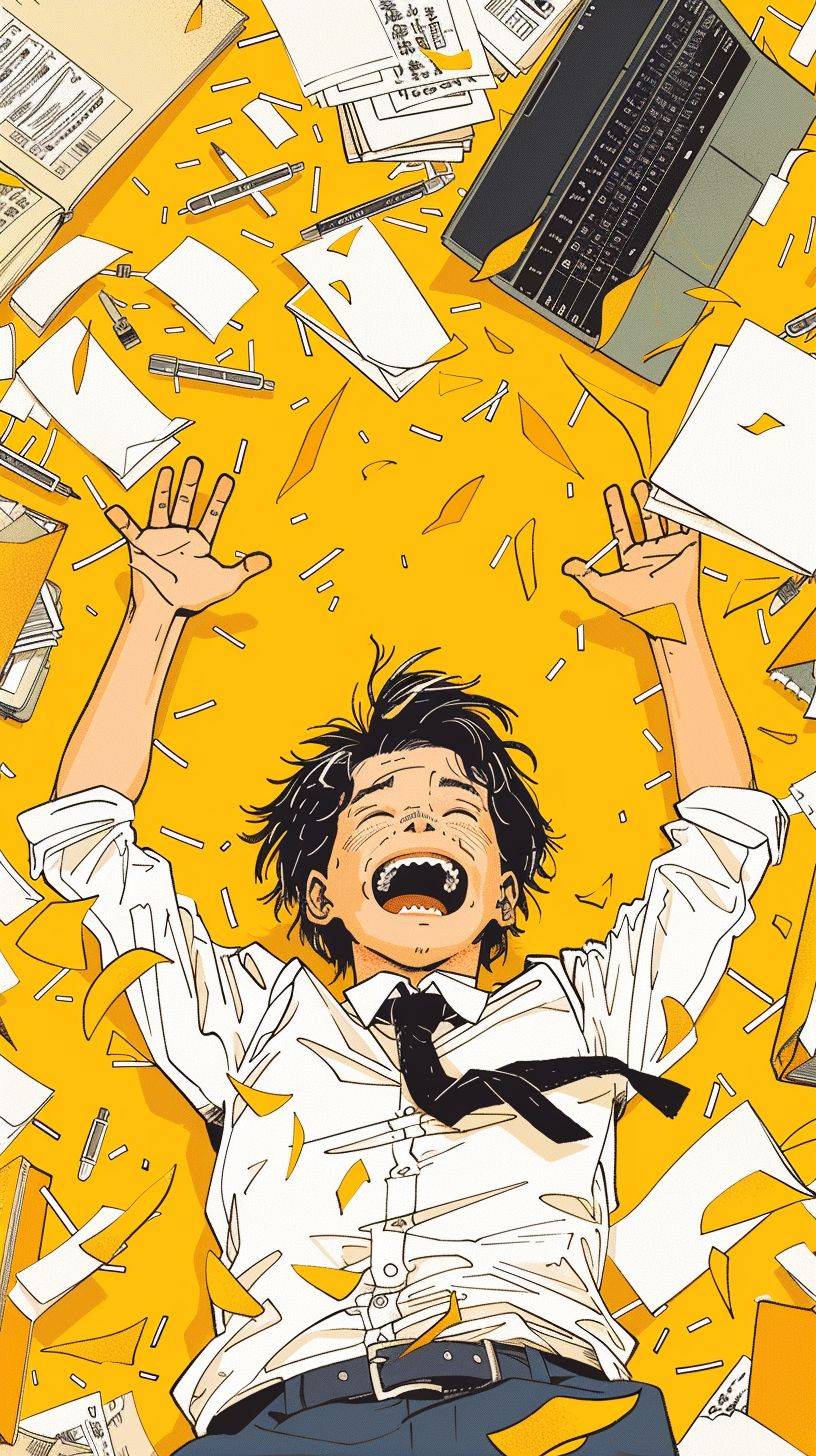 Illustrativer Stil, visuell auffällig, ein junger orientalischer Büroangestellter lacht, während er auf die Kamera zustürzt, umgeben von verstreuten Laptops, Stiften, Ordnern, Dateien und anderen Büromaterialien. Feine Linien sind gezeichnet, umgeben von feinen Linien. Der mittlere Teil des Bildes ist in einem fröhlichen Gelb gehalten, und das obere Drittel des Bildes bleibt leer und schafft einen starken Kontrast, eine dynamische und energetische Atmosphäre.