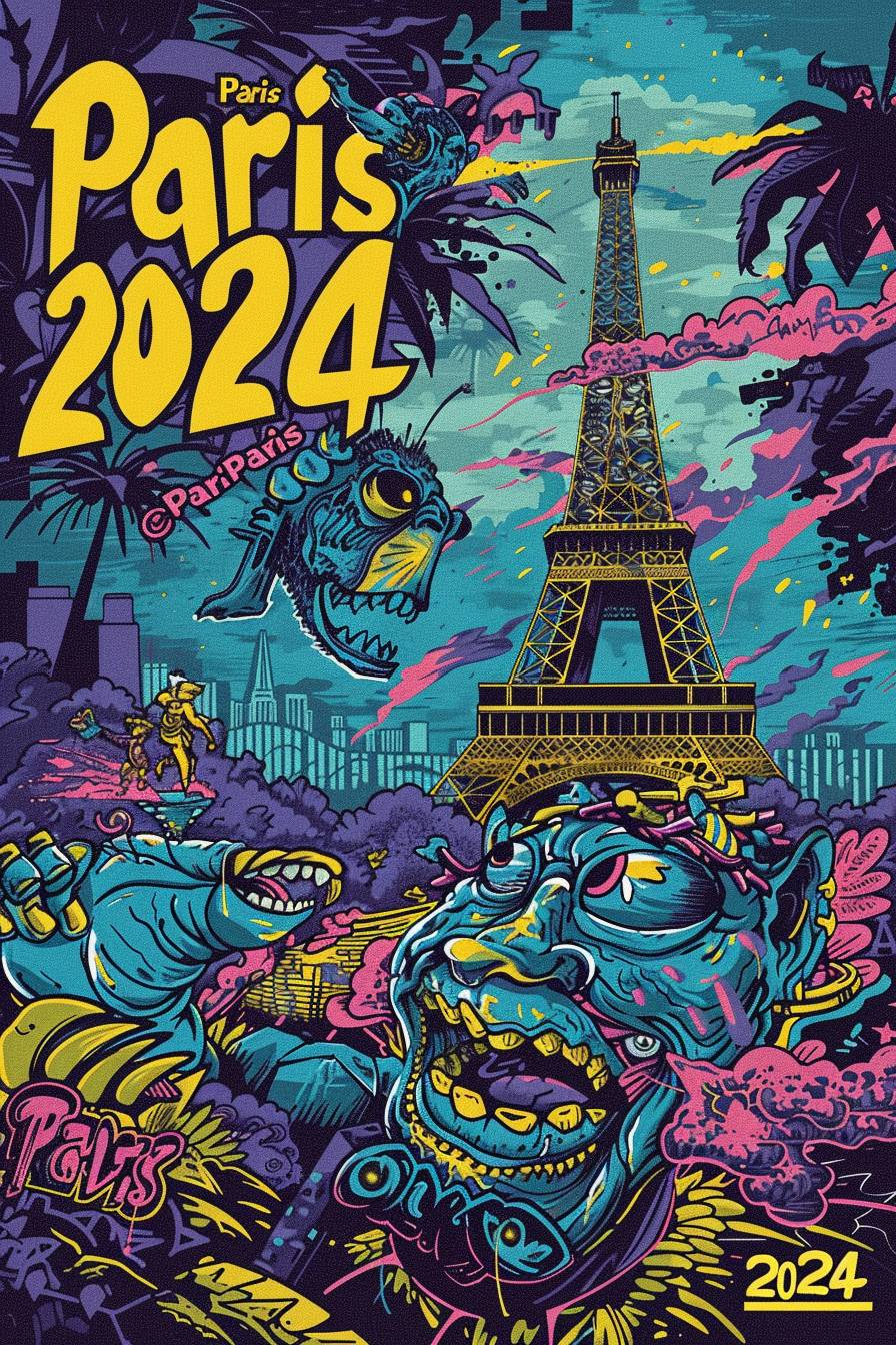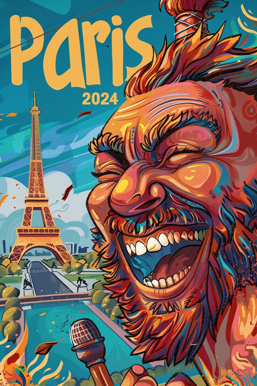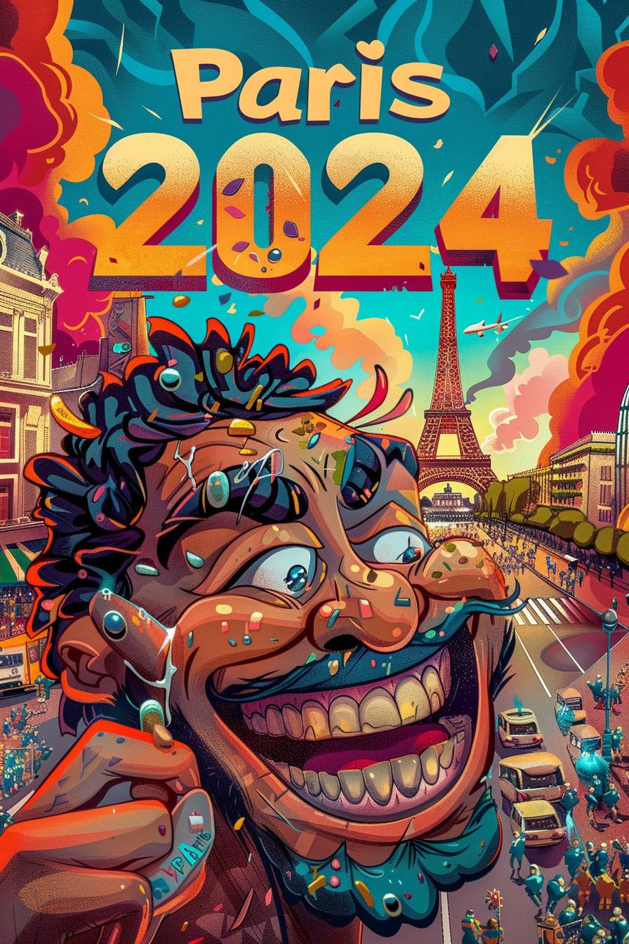 exaggerated caricature poster, [SUBJECT] in the olympics, Eiffel tower in the background, the words "Paris 2024", joyful chaos, a modern take on classic mythology, vibrant illustration, --ar 2:3 --v 6.0