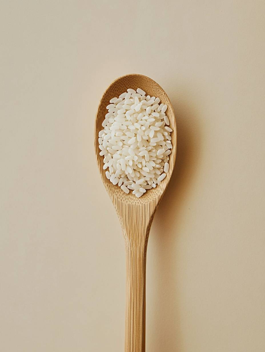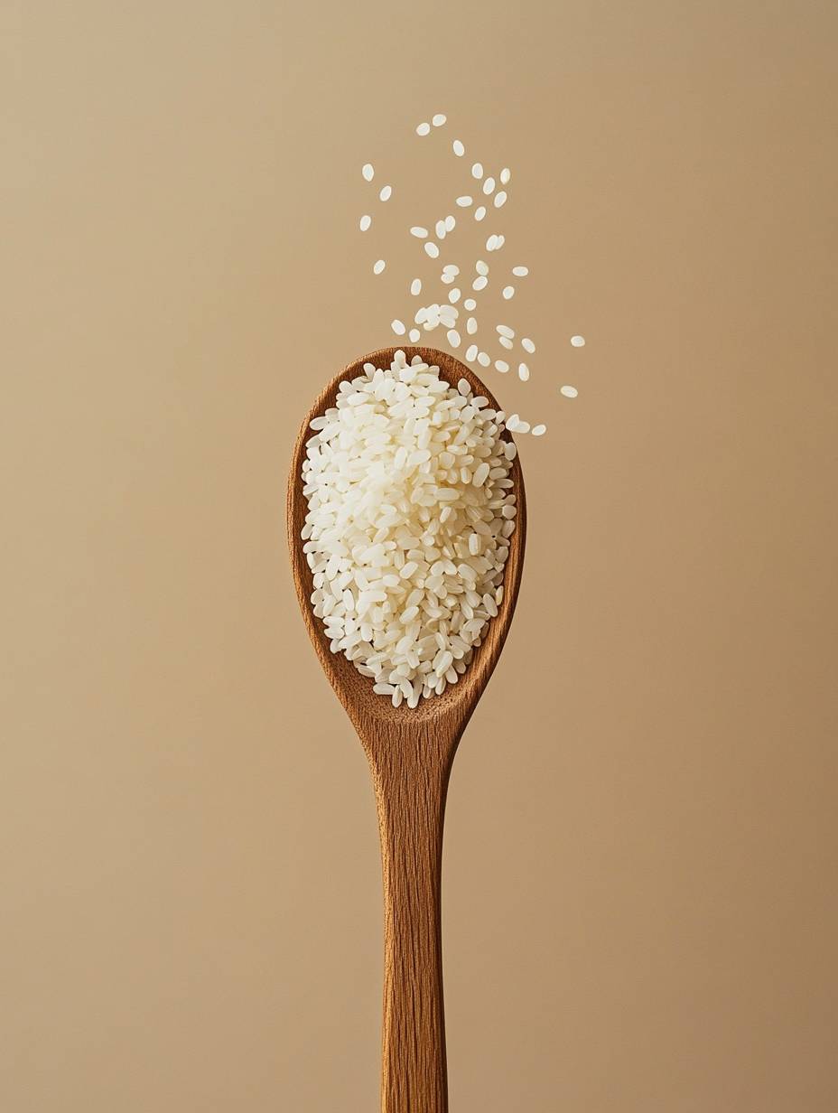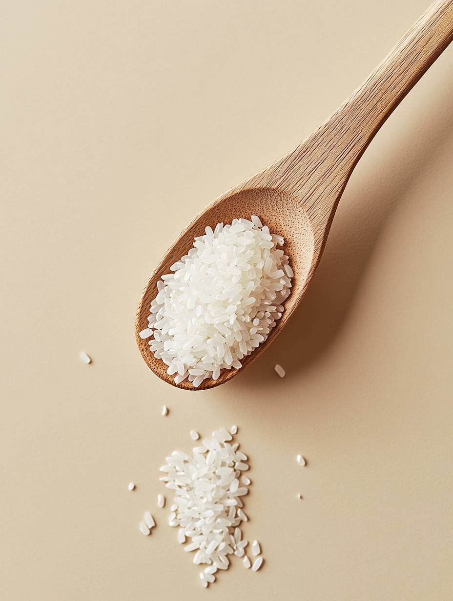 White rice is poured from the wooden spoon, white rice grains on a beige background, minimalistic, food photography in the style of a studio light, pastel colors, high resolution, high quality, professional photograph, highly detailed and sharp, natural lighting, professional color grading with white tones, clean sharp focus. --ar 3:4 --v 6.1