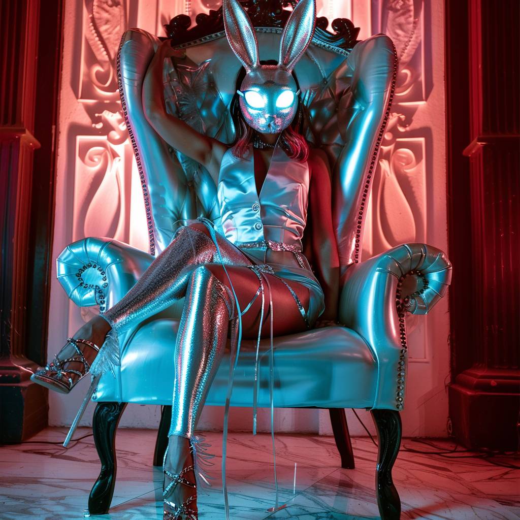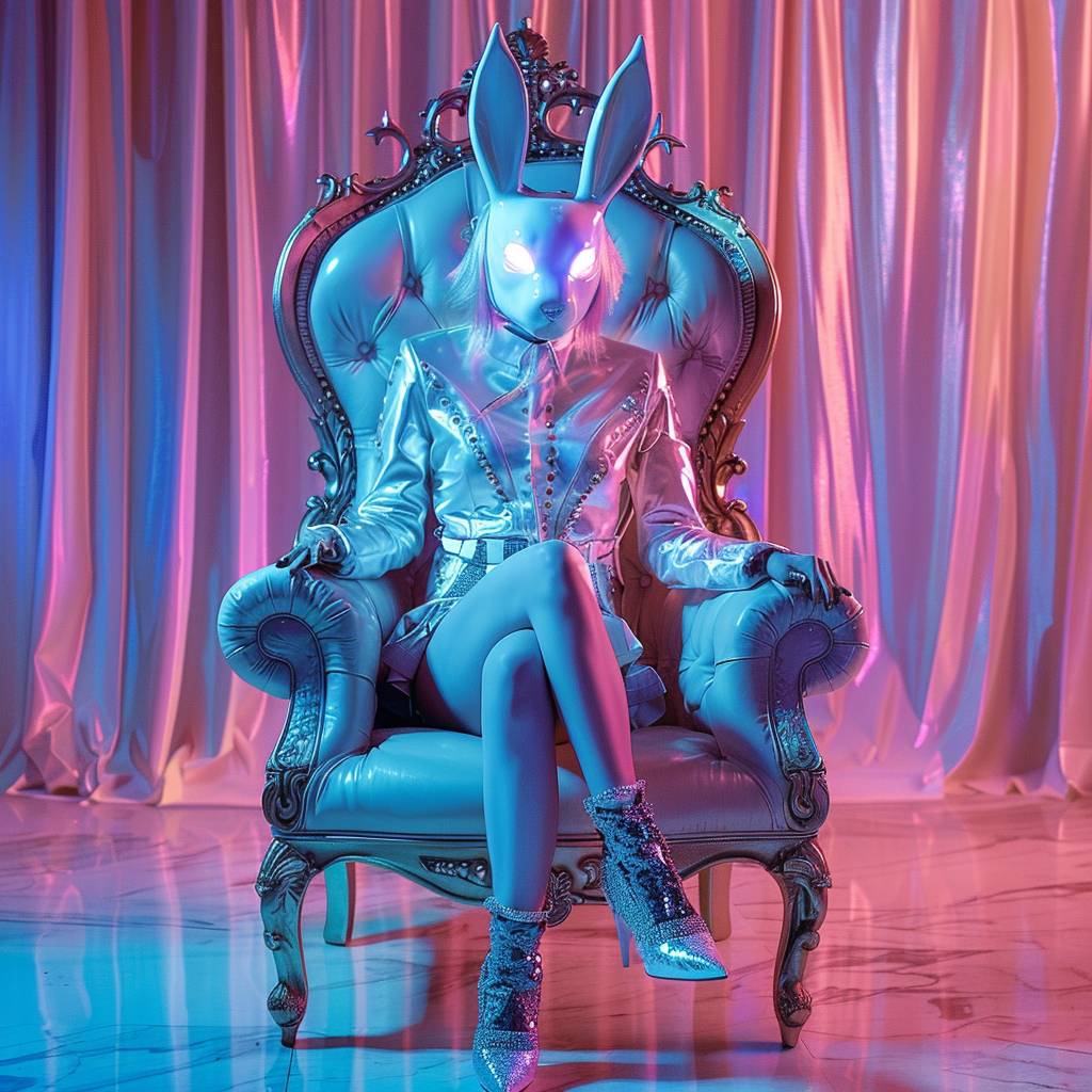 Gradient kontrastierender Farb-Hintergrund, Ganzkörperporträt, Weitwinkelaufnahme, Frau, neonleuchtende Augen, trägt [hellblau, weiß, Chrom], [glänzendes Lackleder], [Halsband mit langen glänzenden Chromspikes], [Hasenmaske], spitze High Heels, sitzt auf einem prachtvollen, verzierten bösen königlichen Thron im verdrehten gotischen Stil, in einem leeren Raum.
