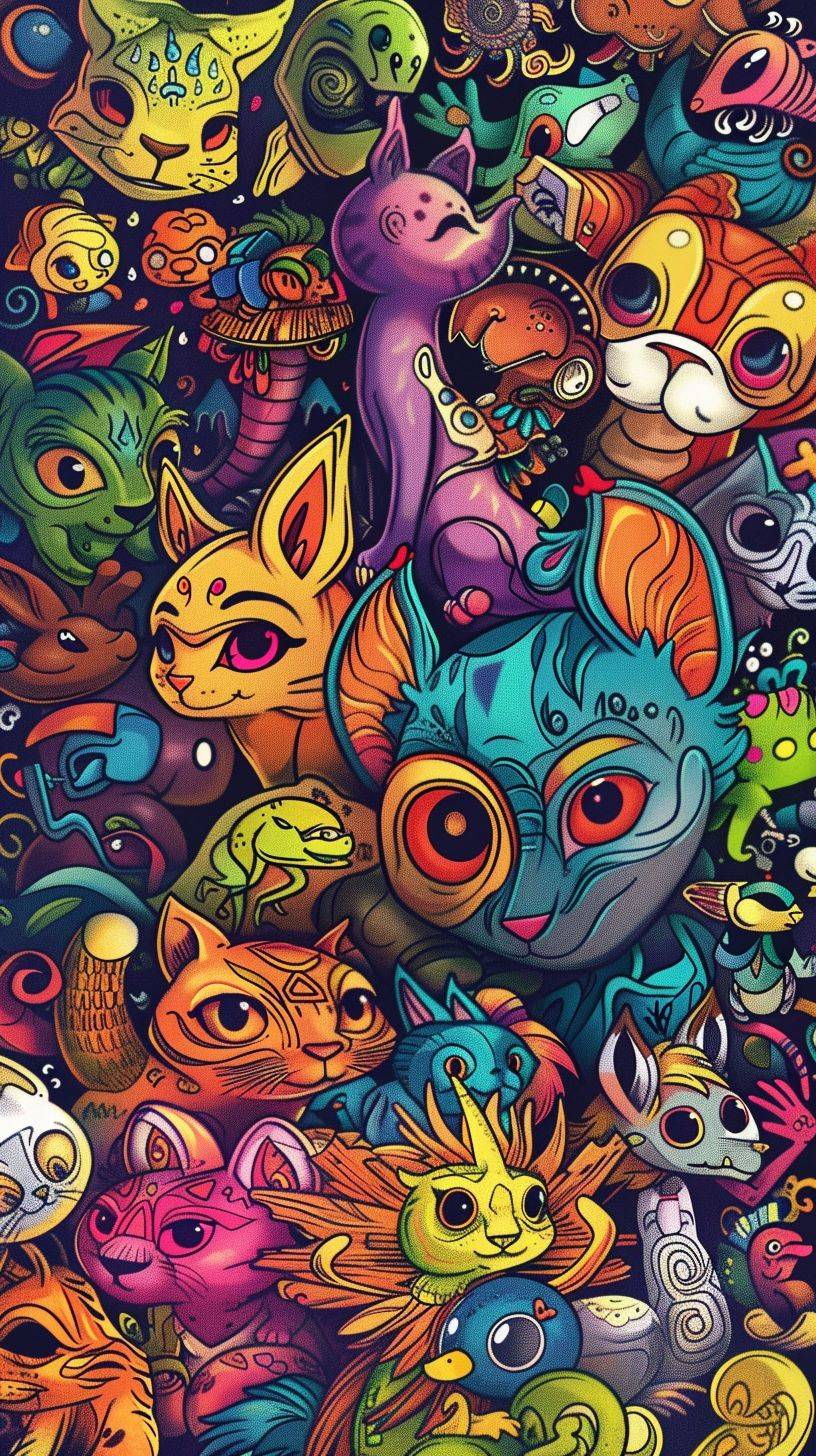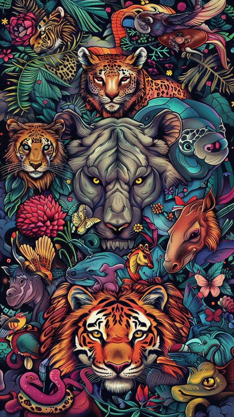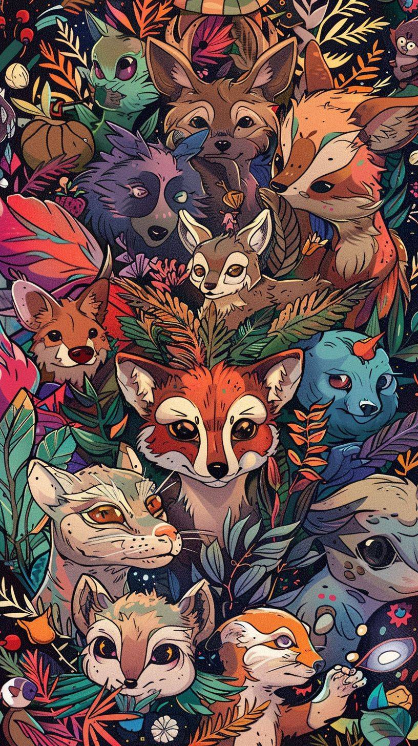 many animals, mandala style animals, world of mandala style animals, chibi style, full color,cartoon style, lots of details, full color background, full color style, clean lines, full color. --ar 9:16