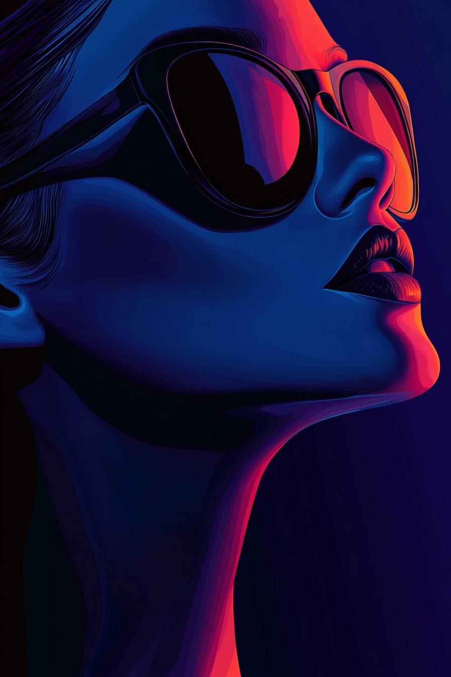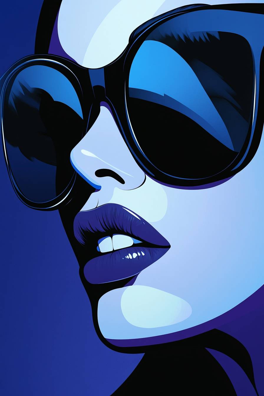 illustration portrait of a woman wearing black sunglasses, side ptofile, anime style, dark blue and sleek silver, optical illusion background, pop art --ar 2:3 --v 6.1