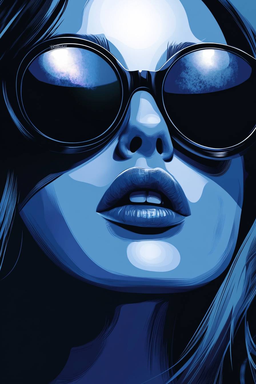 Eine Illustrationsporträt einer Frau mit schwarzen Sonnenbrillen, Seitenansicht, Anime-Stil, Dunkelblau und elegantes Silber, optischer Täuschung Hintergrund, Pop-Art.