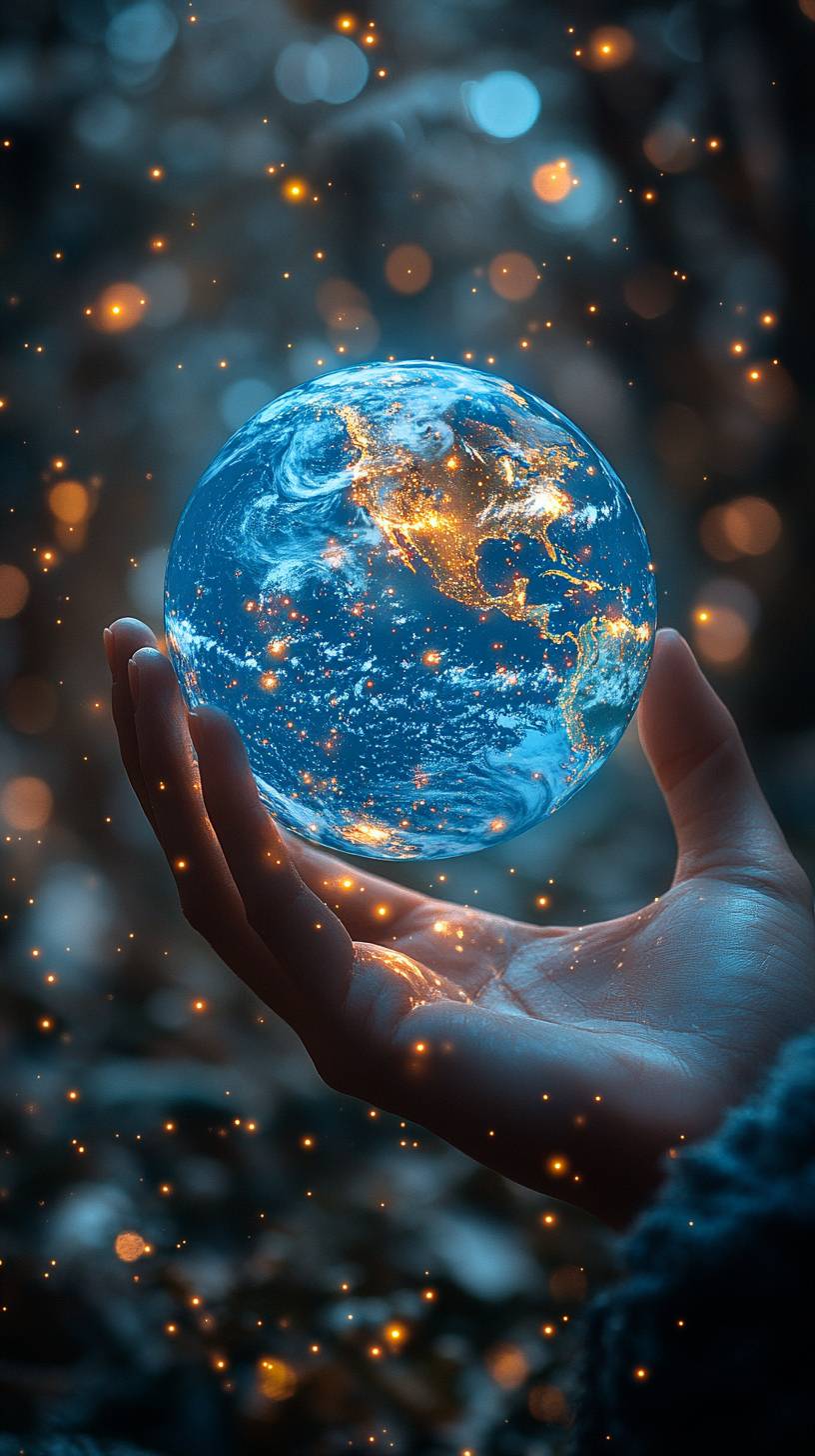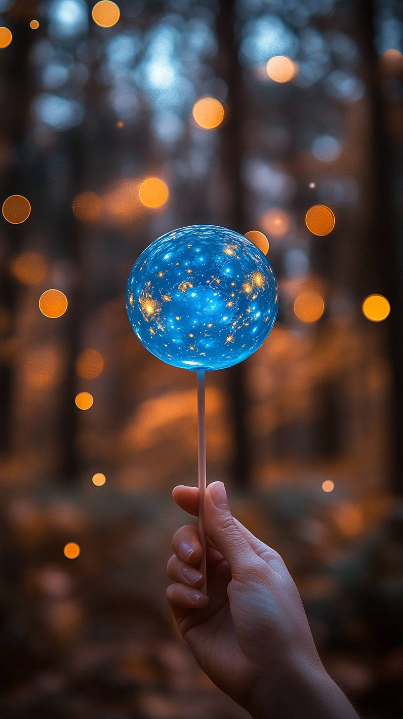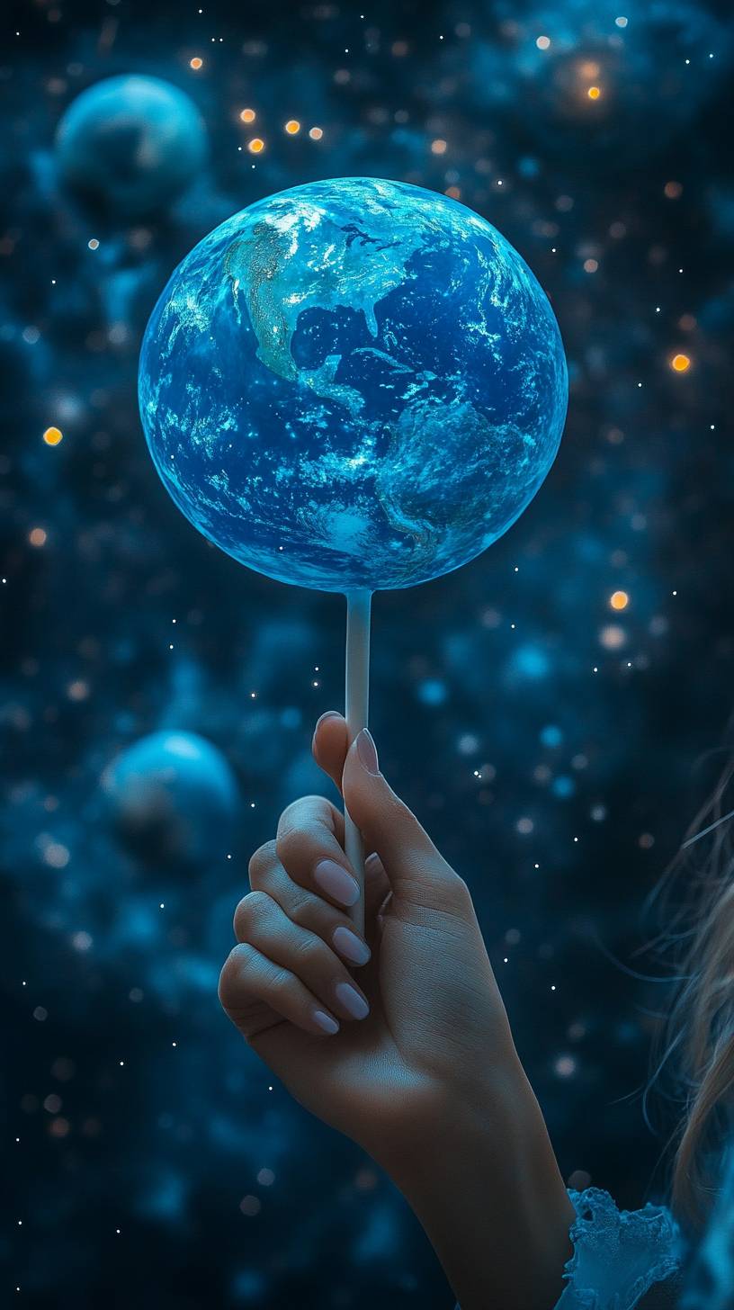 Holding a blue Earth lollipop in space, stars and planets, aesthetic atmosphere, surrealist photography, mobile phone wallpaper, in the style of an artist, this photo depicts a hand holding a blue Earth ball lollipop, between stars and planets, with an aesthetic atmosphere, like a surreal photography mobile phone wallpaper --ar 9:16 --stylize 1000 --v 6.1