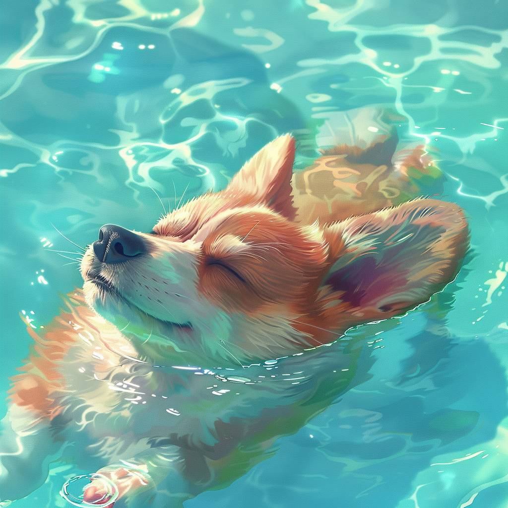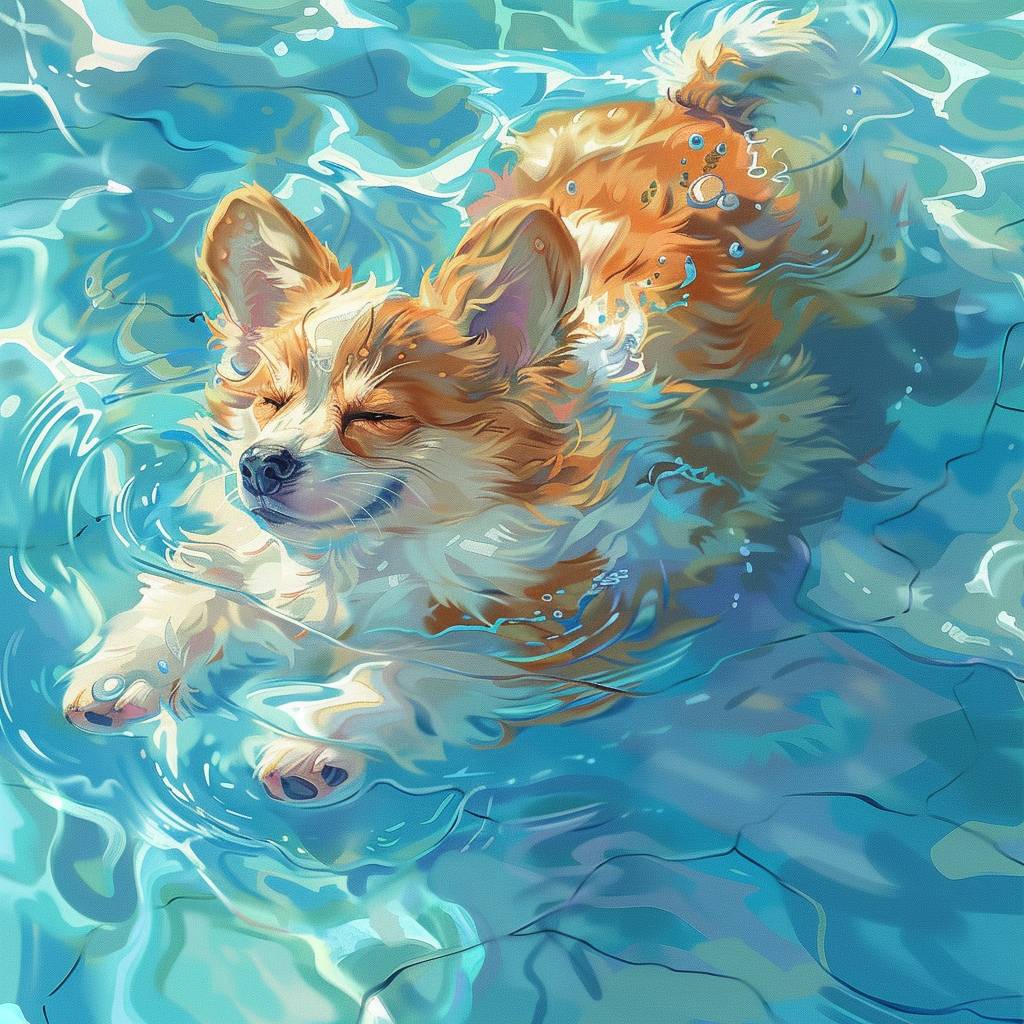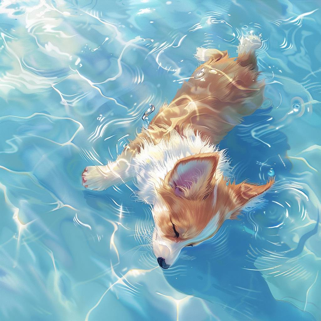 Colorful japanese anime style, panoramic landscape with water occupying most of the image, light blue transparent water with clear ripple texture showing refraction, small corgi puppy with closed eyes swimming backstroke in the pool, intricate details of water and corgi not blurred, artwork intended for phone wallpaper, ultra high definition 32k render --v 6.0