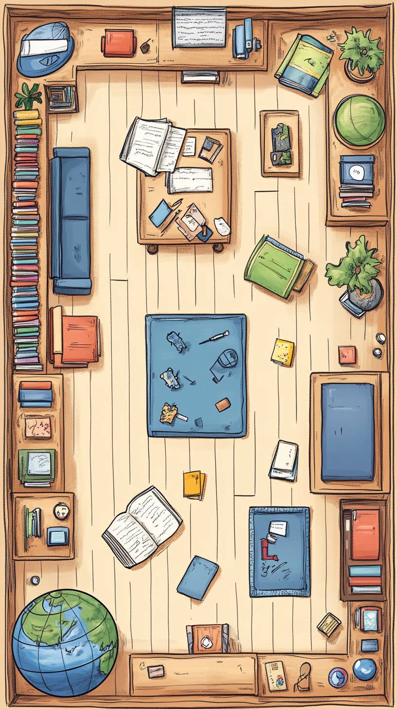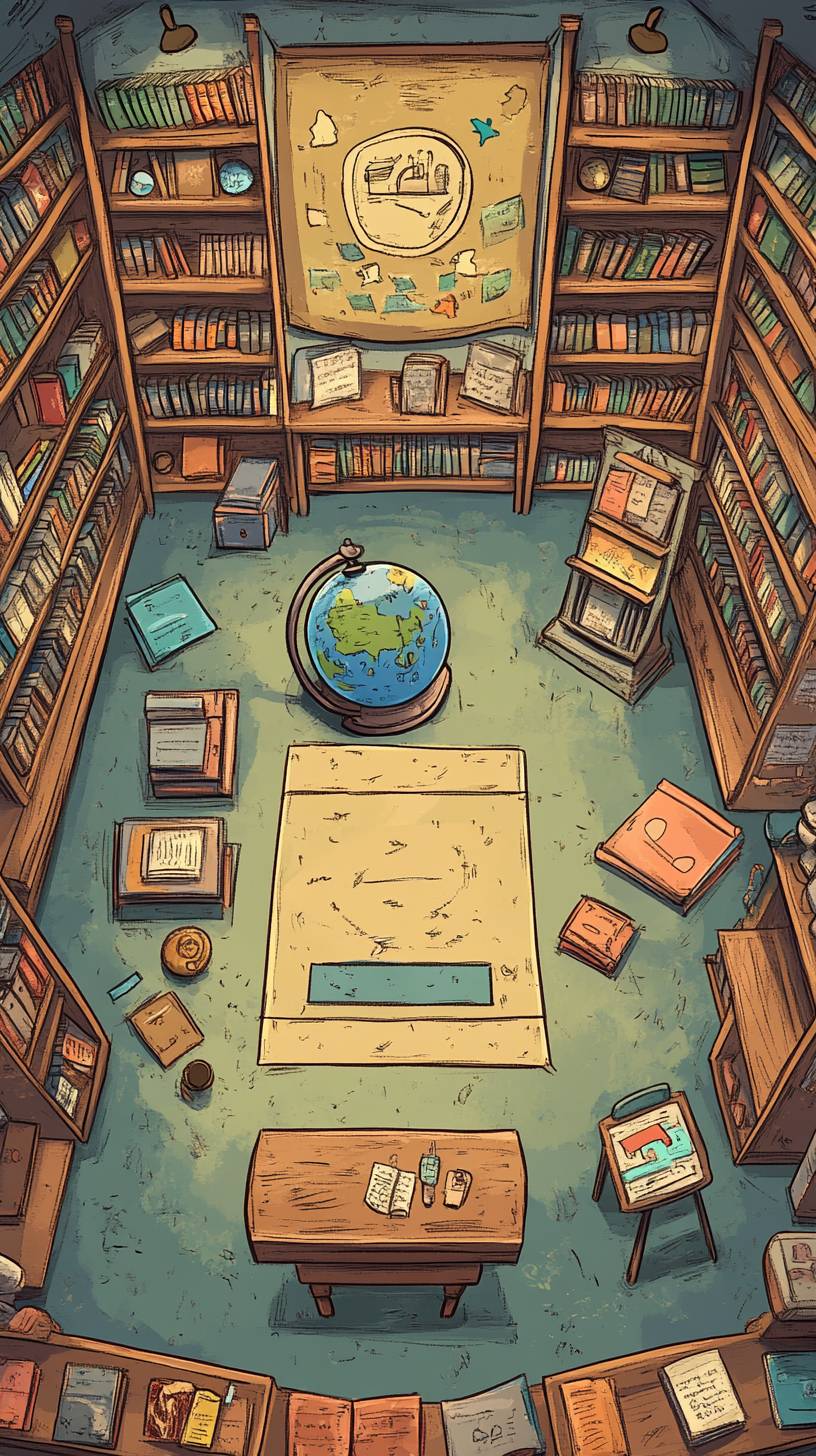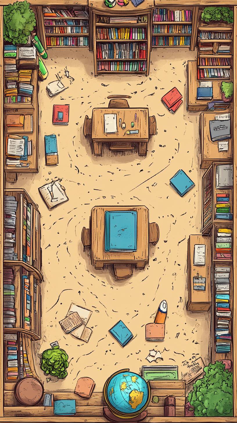 Die Layoutkarte der handgezeichneten Buchhandlung umfasst Bücherregale, Staffeleien, Raketen, 3 Tablets, Schreibwaren, ein Klavier, einen Globus, einen Empfangstresen und einen Kinderbereich, im Cartoon-Stil.