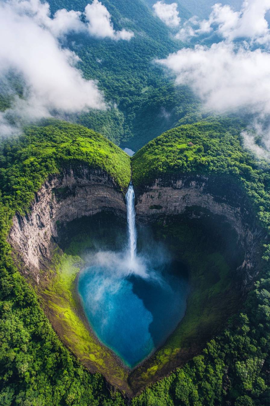 Der Wasserfall bildet einen herzförmigen Berg und einen blauen See.