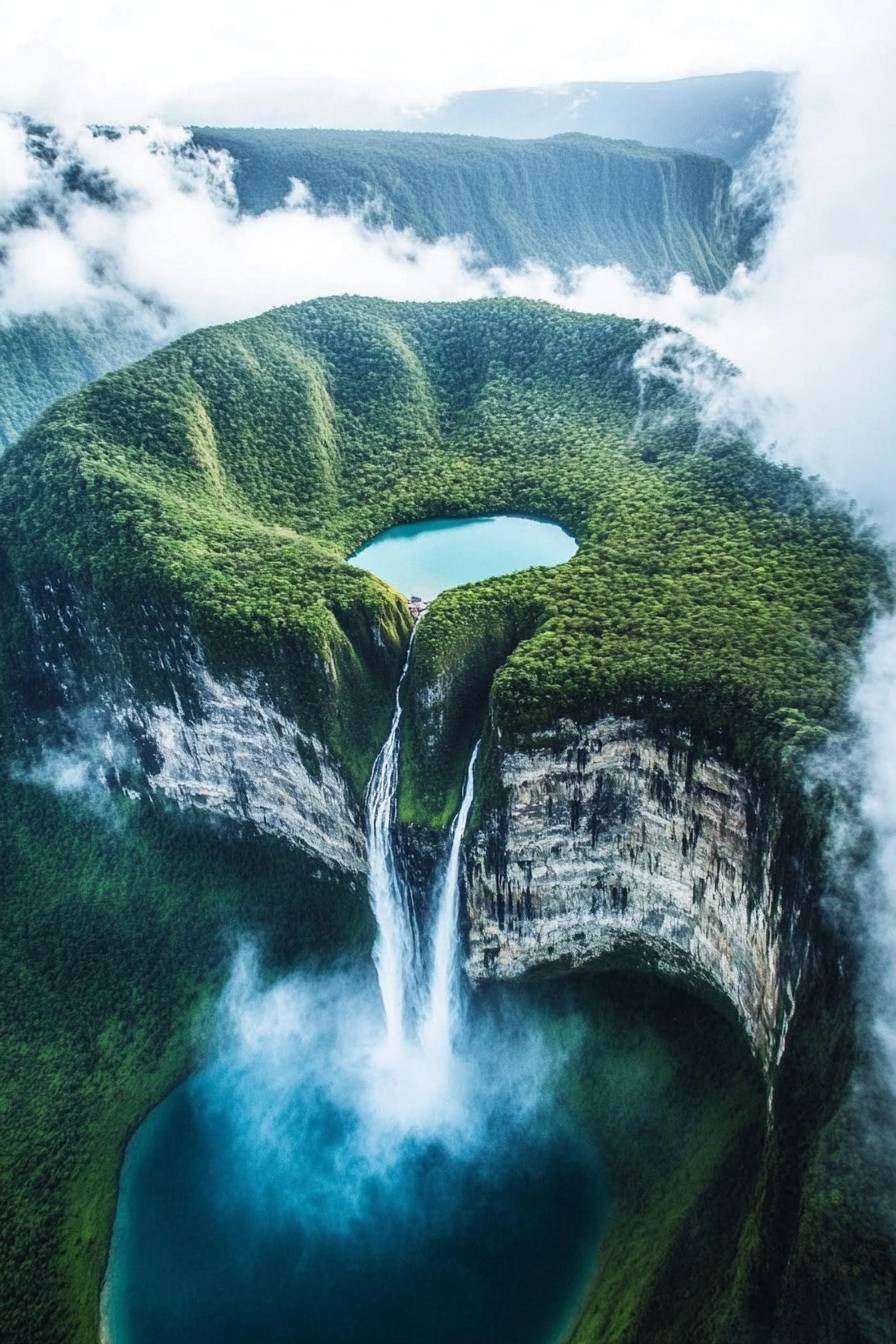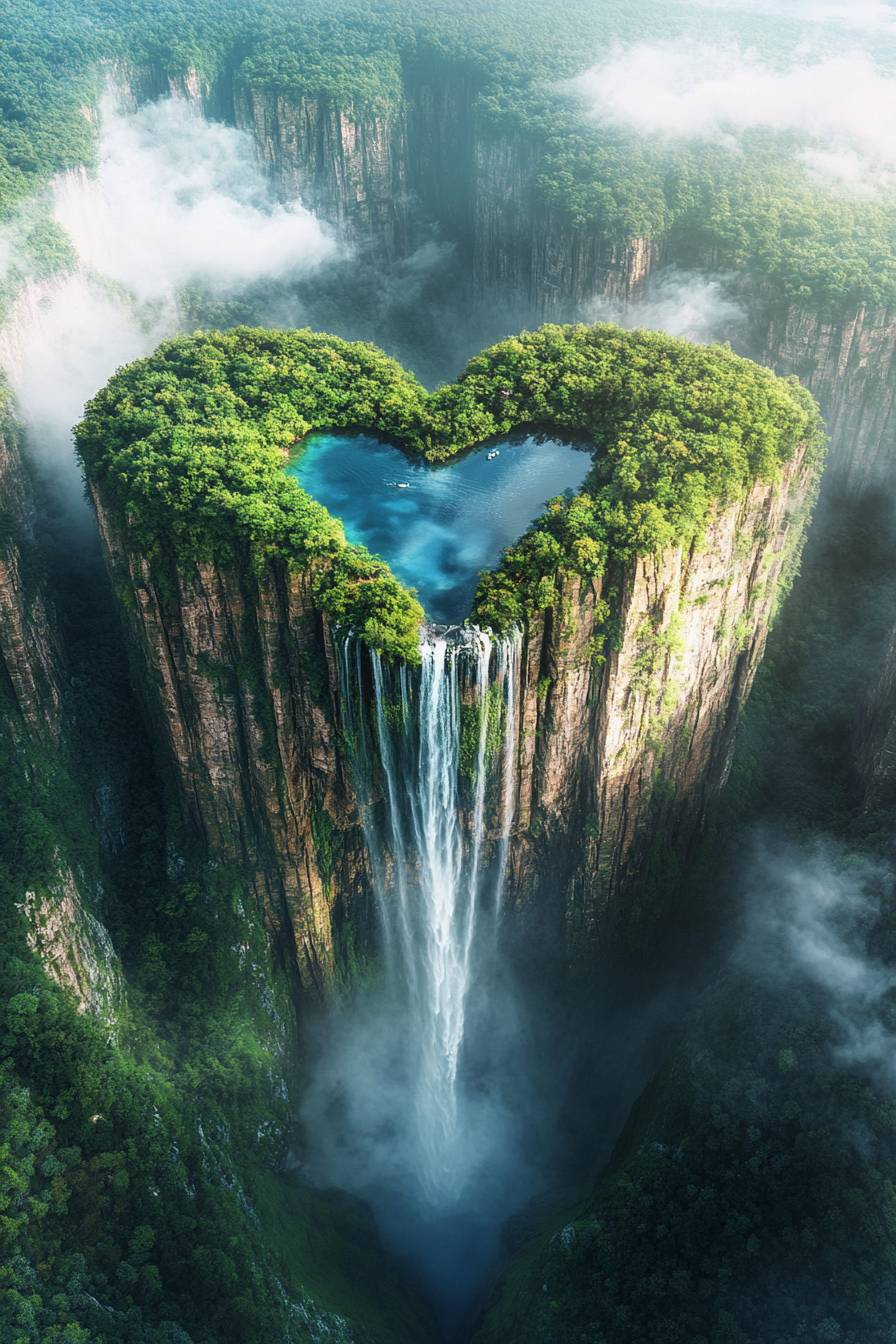 the waterfall falls from the sky, forming an oversized heart-shaped mountain with green vegetation on top and a blue lake at its center. the aerial view captures water splashing down the cliff edge into crystal-clear waters below, creating mesmerizing reflections in light white clouds. this stunning natural masterpiece perfectly reflects love's enchanting power over nature, focusing on the face. --ar 2:3 --v 6.1