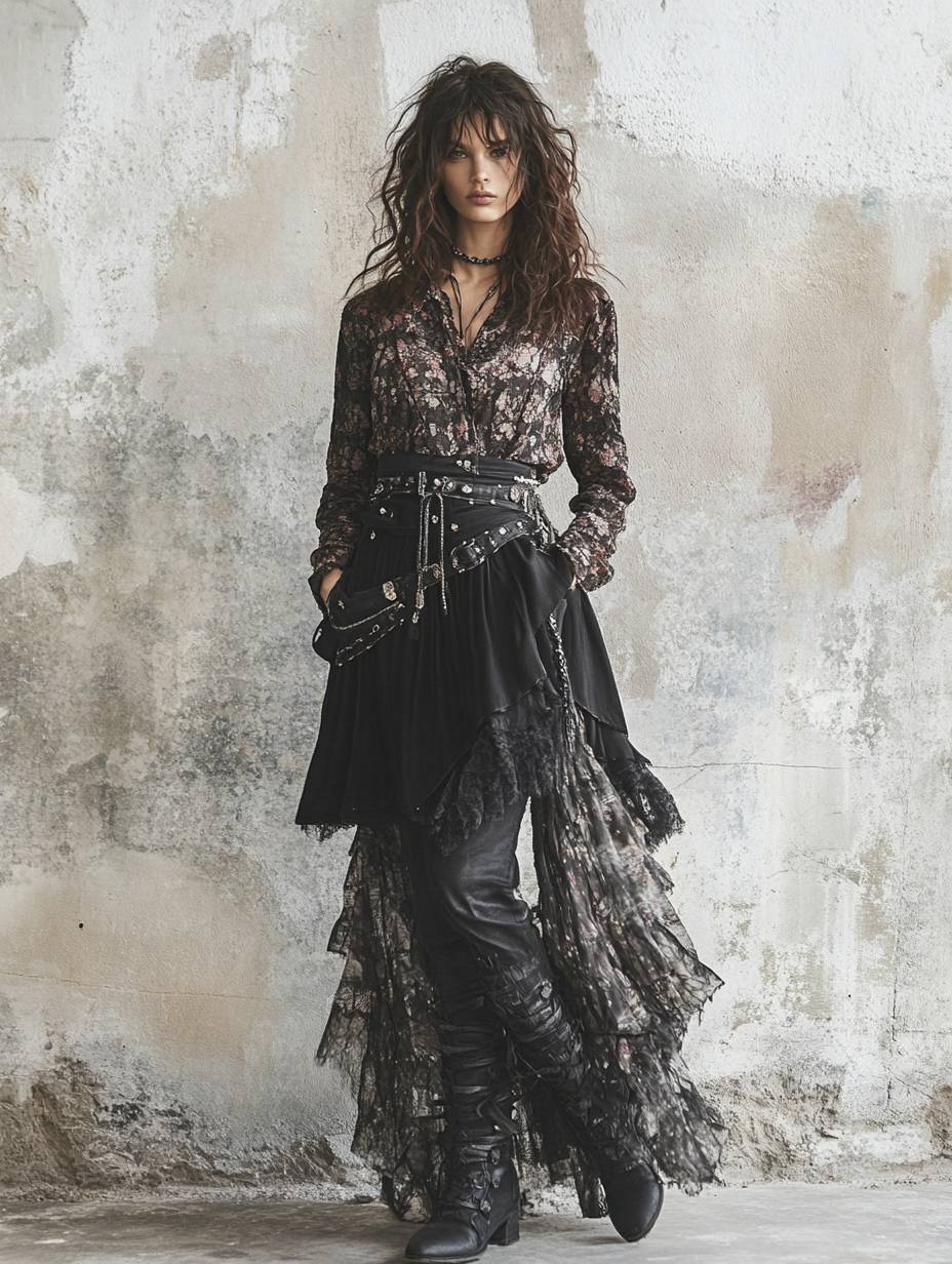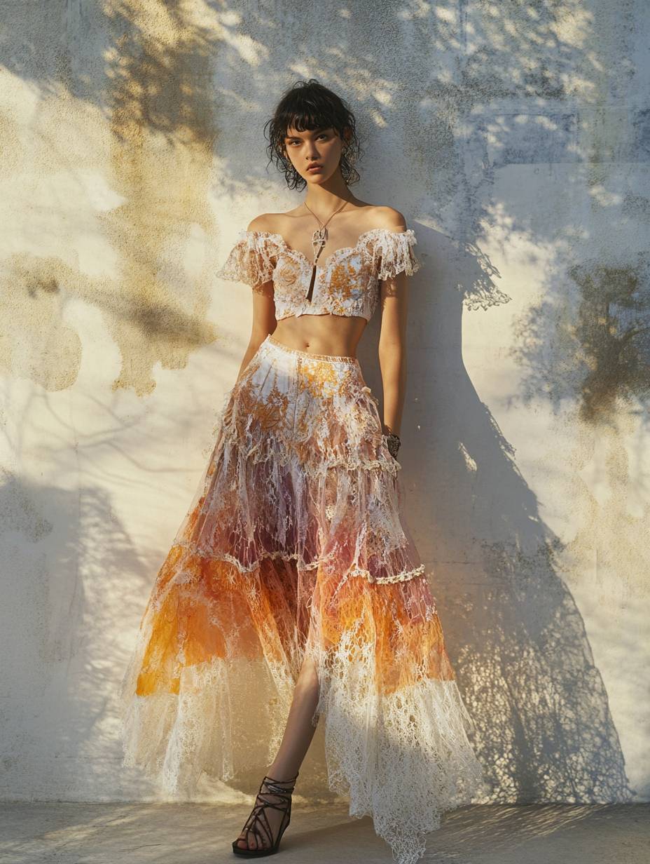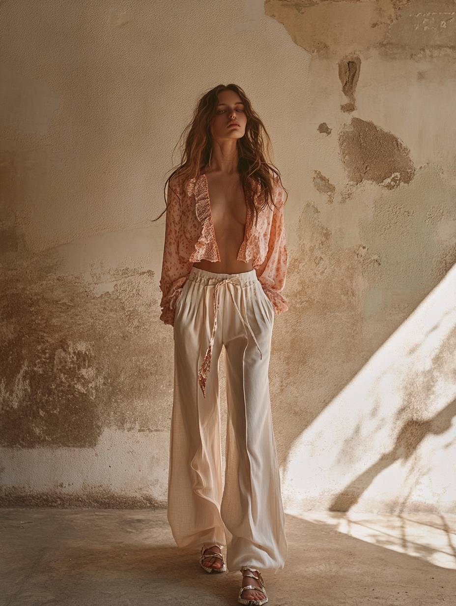 Ganzkörperaufnahme eines Supermodels vor einer hellen, marmorierten Wand.