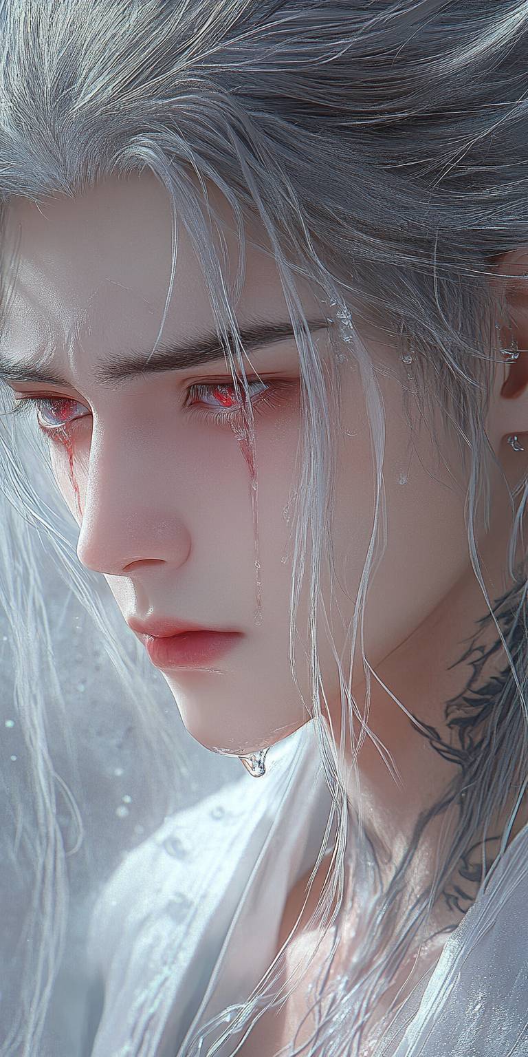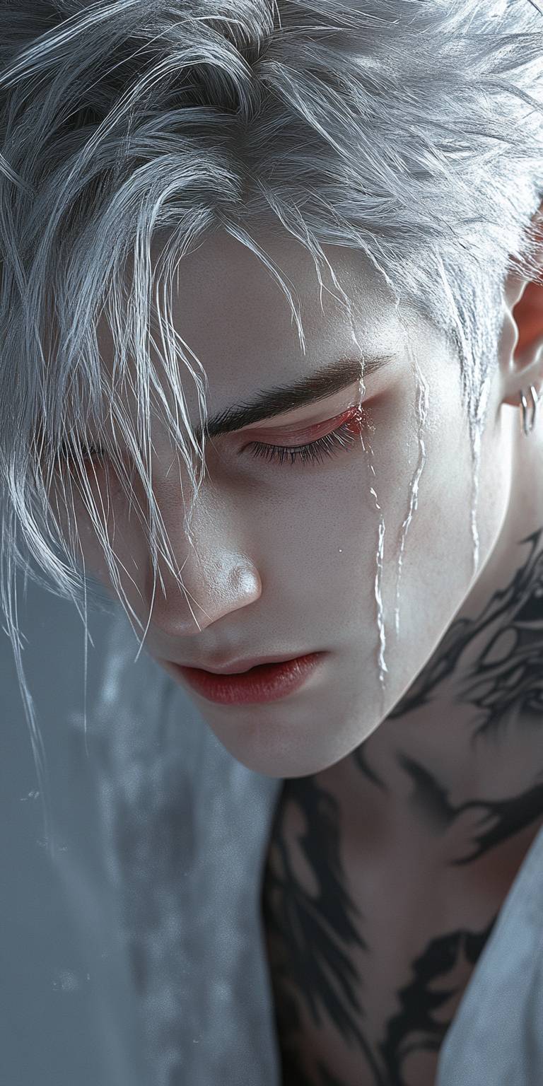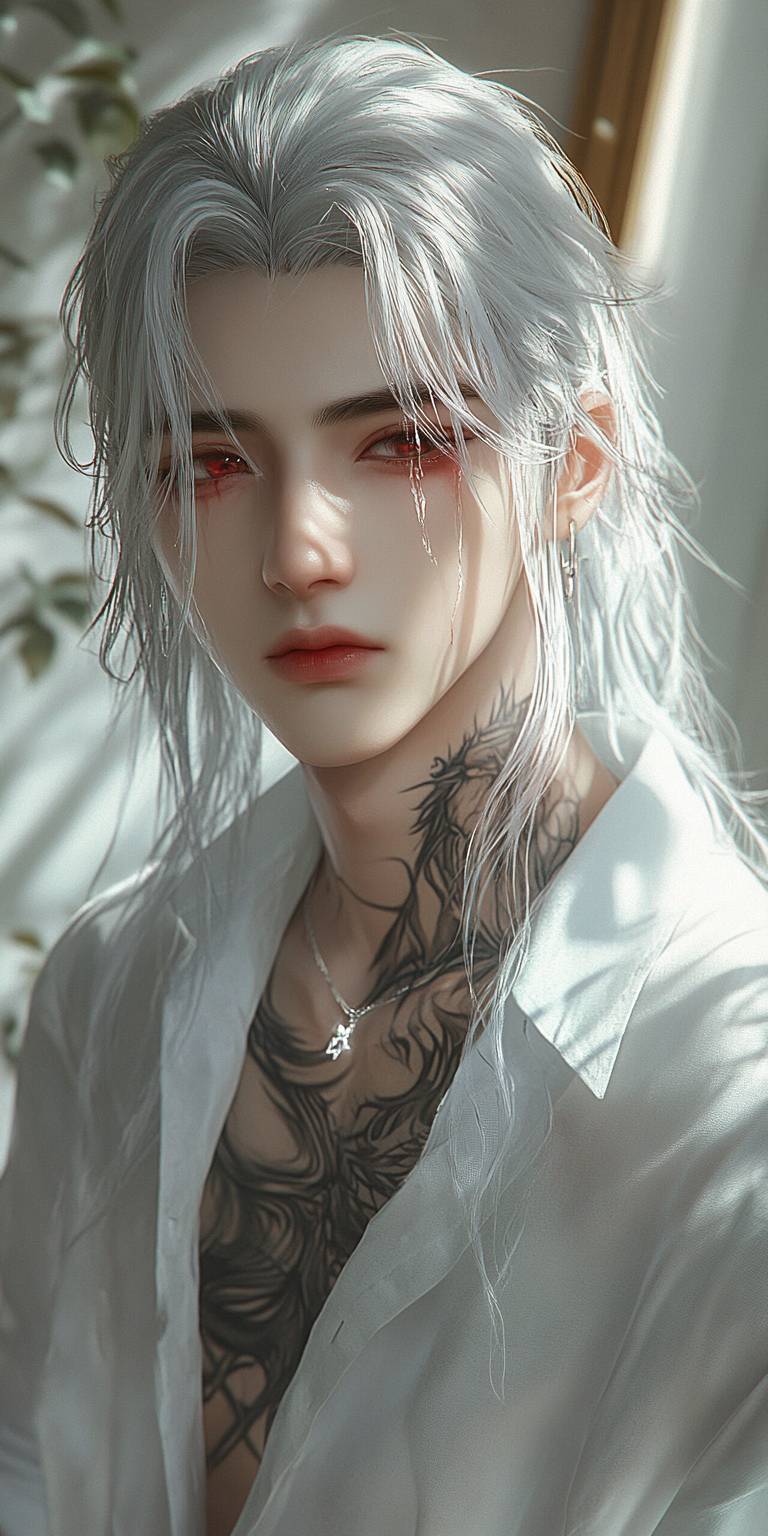 Illustrations, game CG, ultra detailed and extremely meticulous CG, unified 8K wallpaper, daytime background, high-end design style in the bedroom, a silver white long hair with a domineering tattoo from the neck to the chest, handsome and three-dimensional face like sculpture, sharp and cold eyes like eagles and falcons containing heavy sadness, a young man wearing a white shirt crying red in his eyes. Game CG, painting, best picture quality, 8k, realistic eye contact, realistic pupils, realistic tears, clear and three-dimensional facial features, detailed lines, radiance, Unreal Engine rendering, sunlight, full body, close-up, view from above, skin tone, enhanced shadows, depth of field, stunning visual effects --ar 1:2 --v 6.1