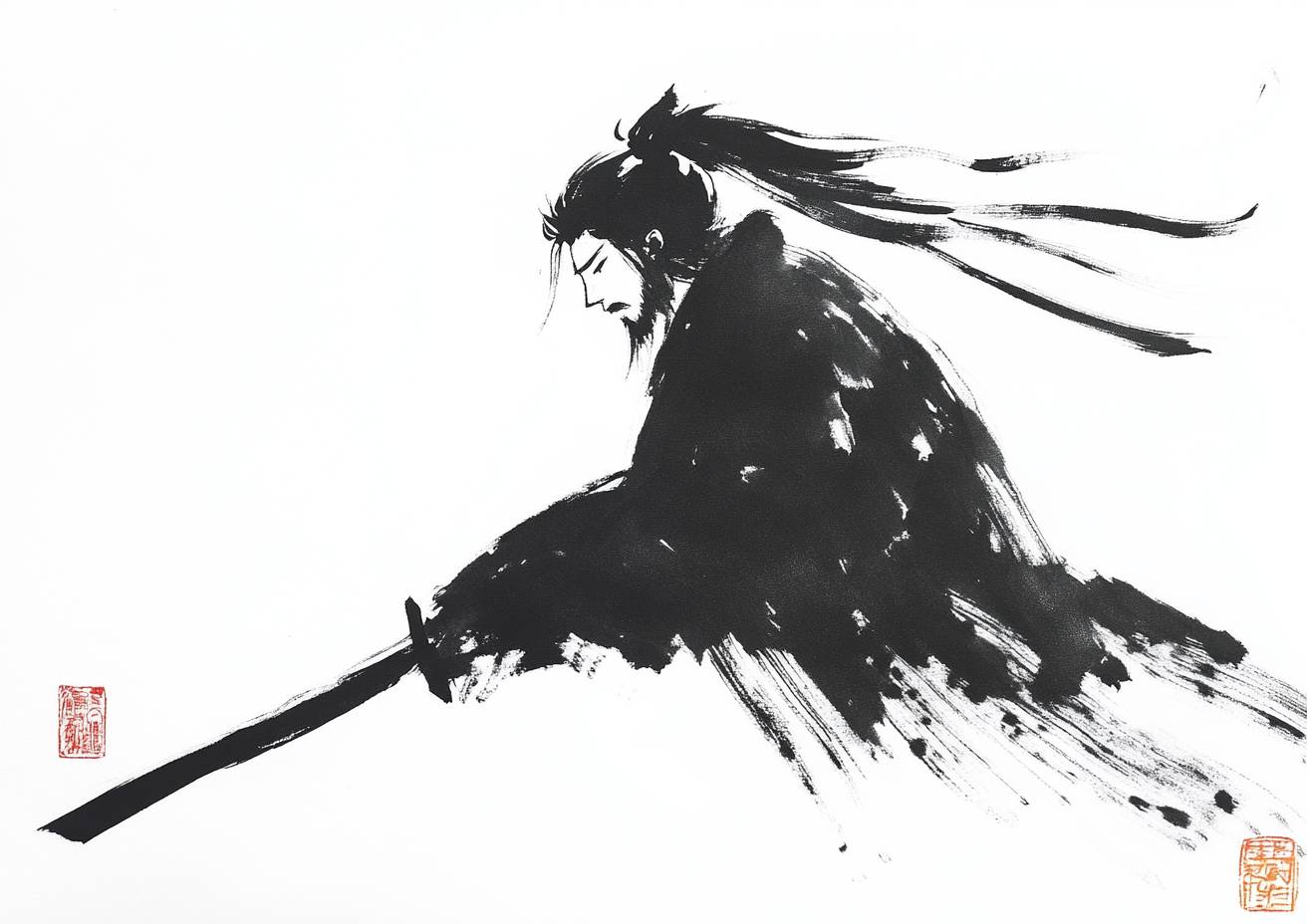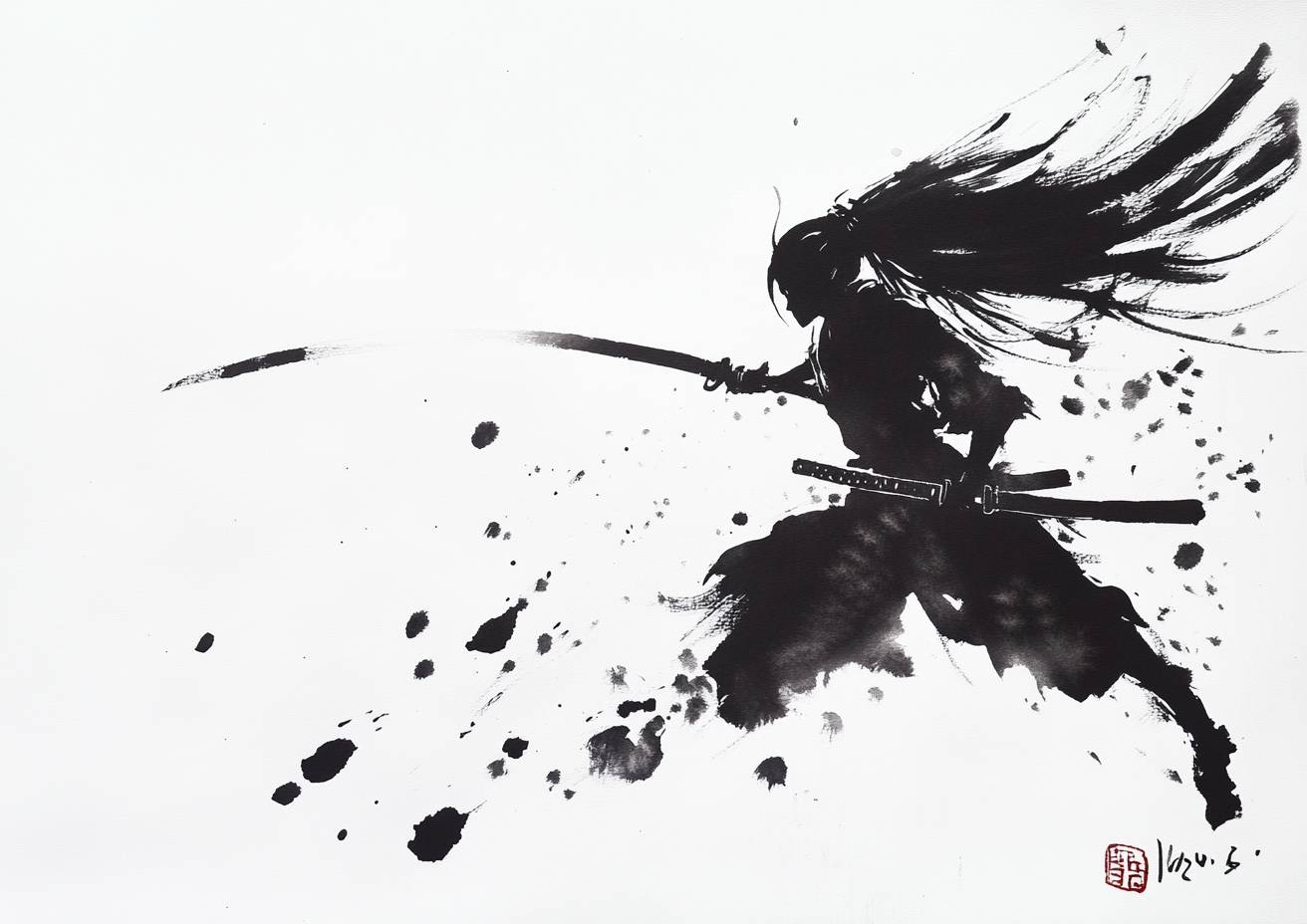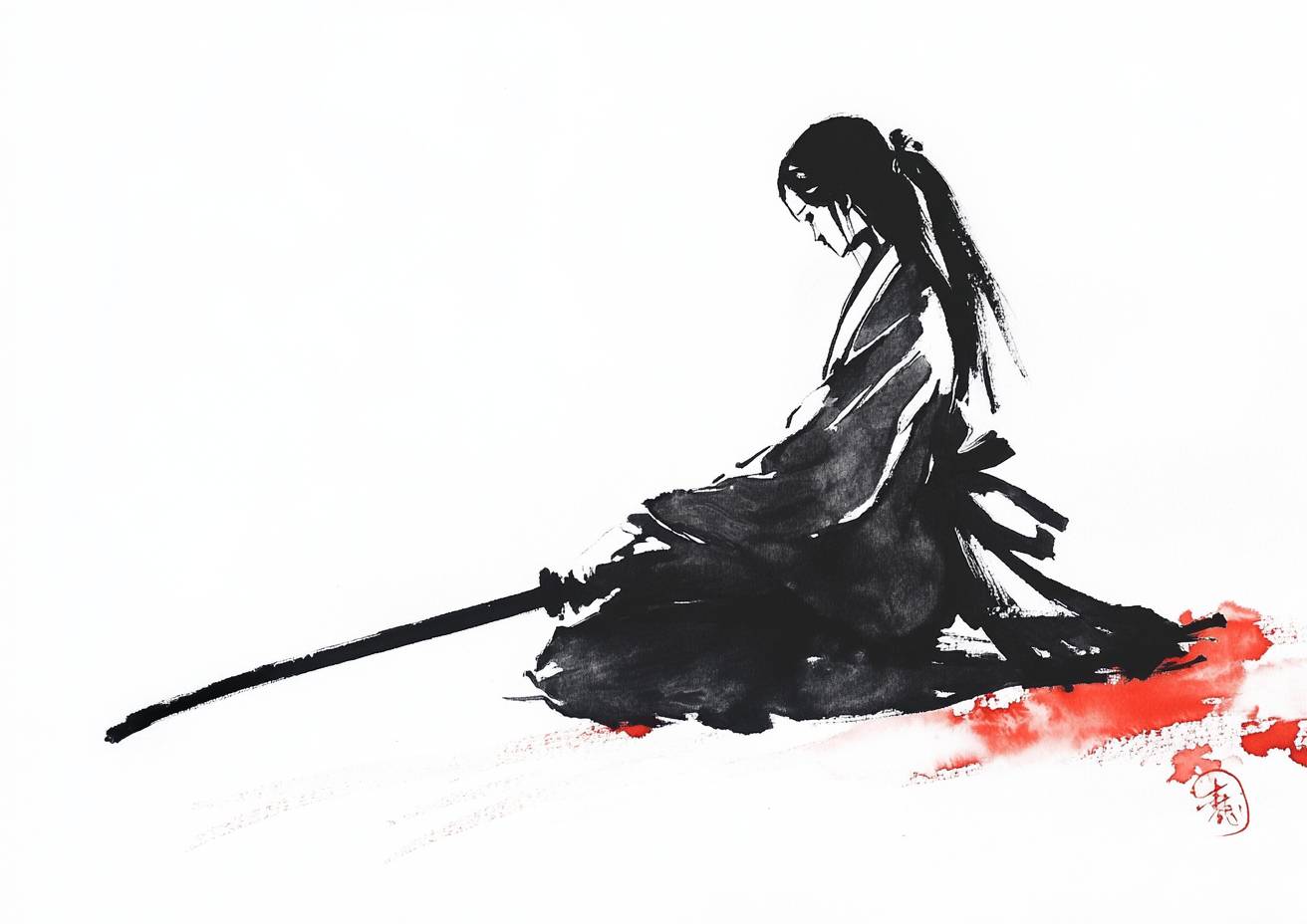 sumi-e ink painting using minimalist brushwork, simple outlines, a Kunoichi ninja with odango hair, in repose after a battle, subtle ink wash on a clean white background, bold calligraphy, striking beauty, negative space --ar 7:5 --stylize 50 --v 6.1
