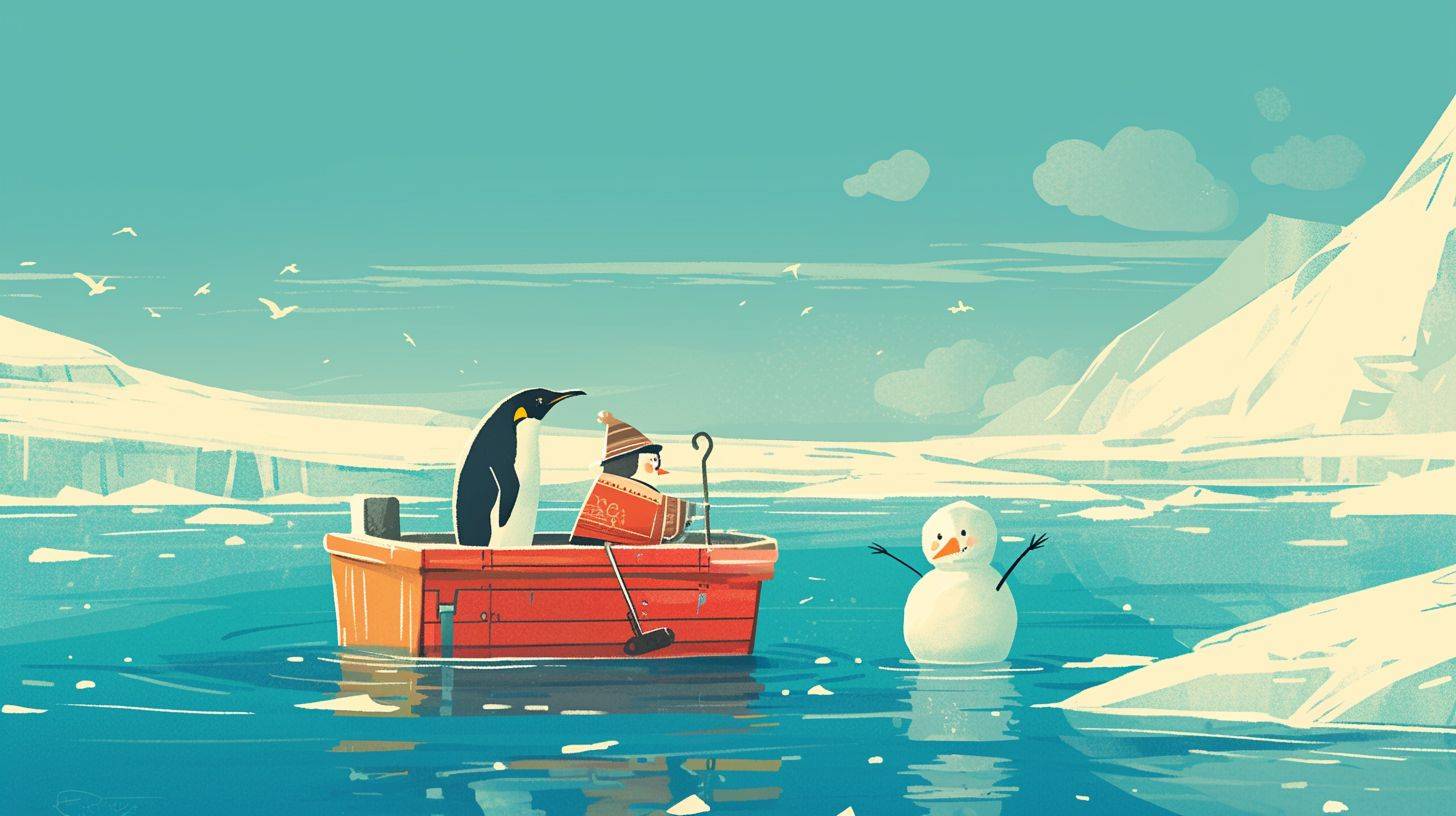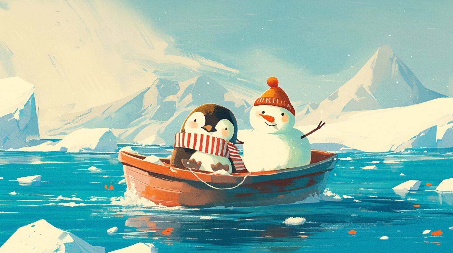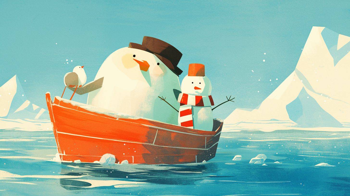 a cute penguin and a snowman dressed in a red and white striped shirt and a brown hat on a small wooden boat in the middle of Antarctic ocean, in the style of Jon Klassen, children's book illustration with flat and bright pastel colors --ar 16:9 --niji 6