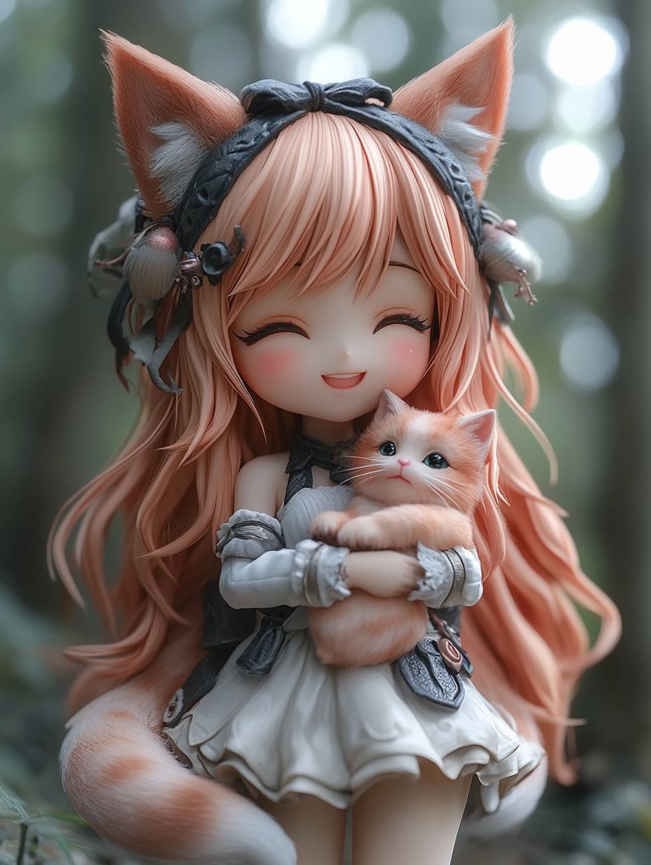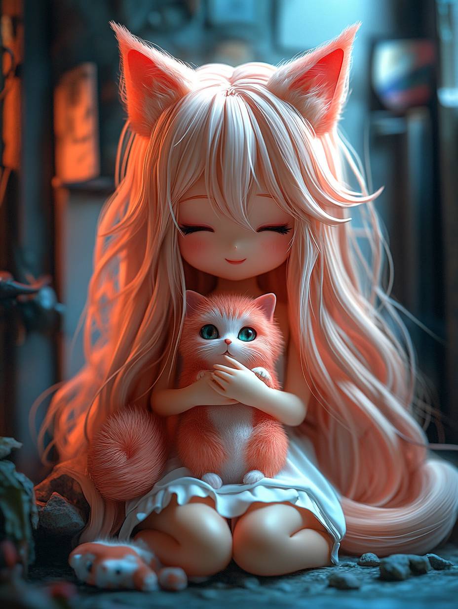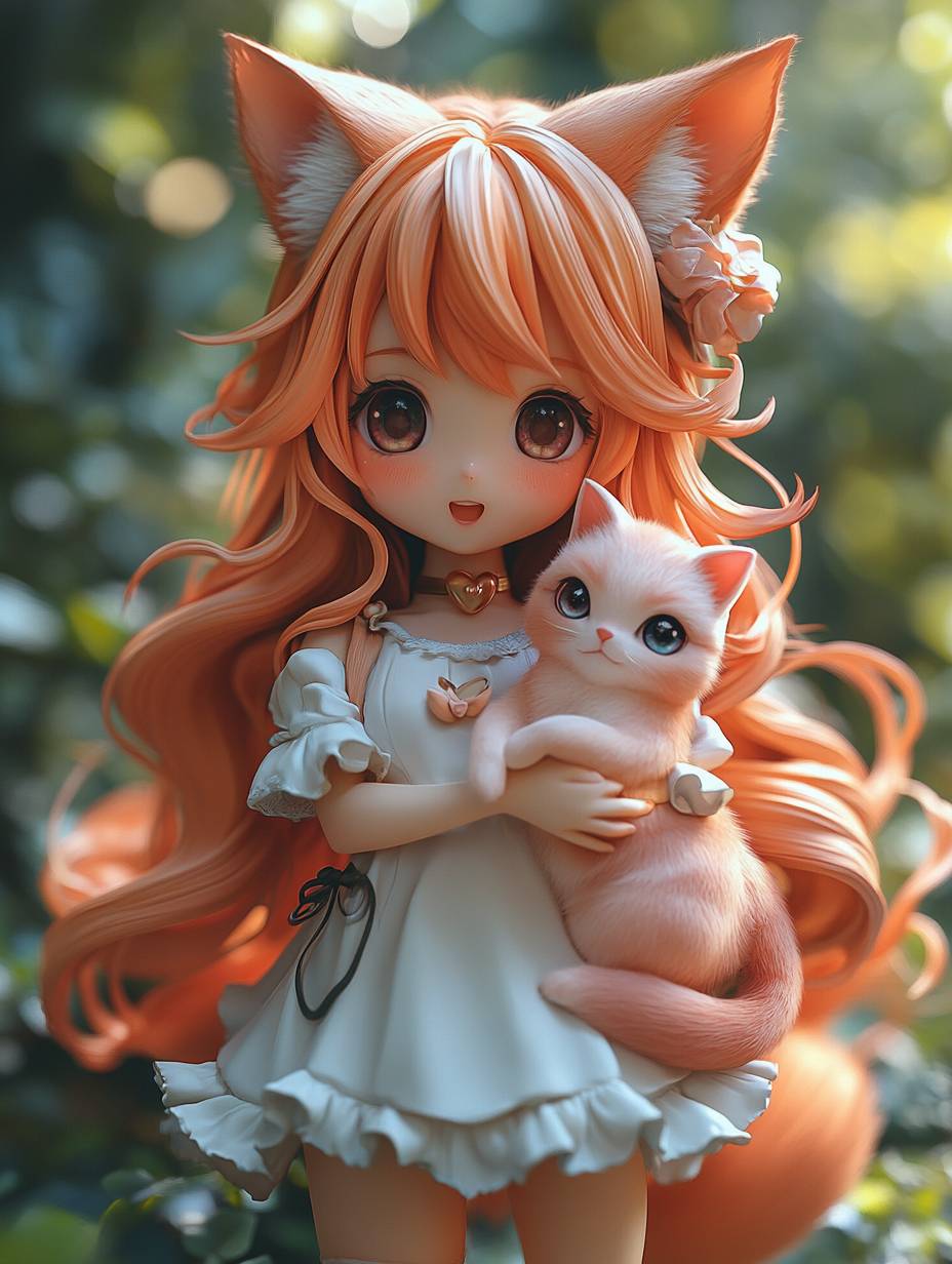 Eine süße 3D-Anime-Figur mit langen Haaren und Fuchsohren, die eine rosa Katze hält.