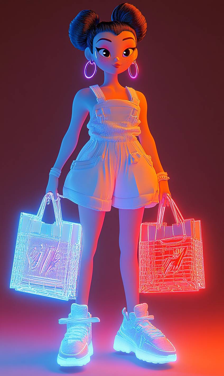 Farbiger Farbverlauf-Lichtton, eine süße Cartoon-Chinesin ist beim Einkaufen, mit einem Farbverlauf-Farbschema und fluoreszierenden Farben, modischen Sneakers, übertriebenen Bewegungen, Disney-Stil, Pixar-Animation, in Cinema 4D gerendert, weiches Licht, einfarbiger Hintergrund, Ganzkörperporträt, hohe Auflösung, 3D-Kunst, lebendige Farben, hohe Detailgenauigkeit, hohe Qualität.
