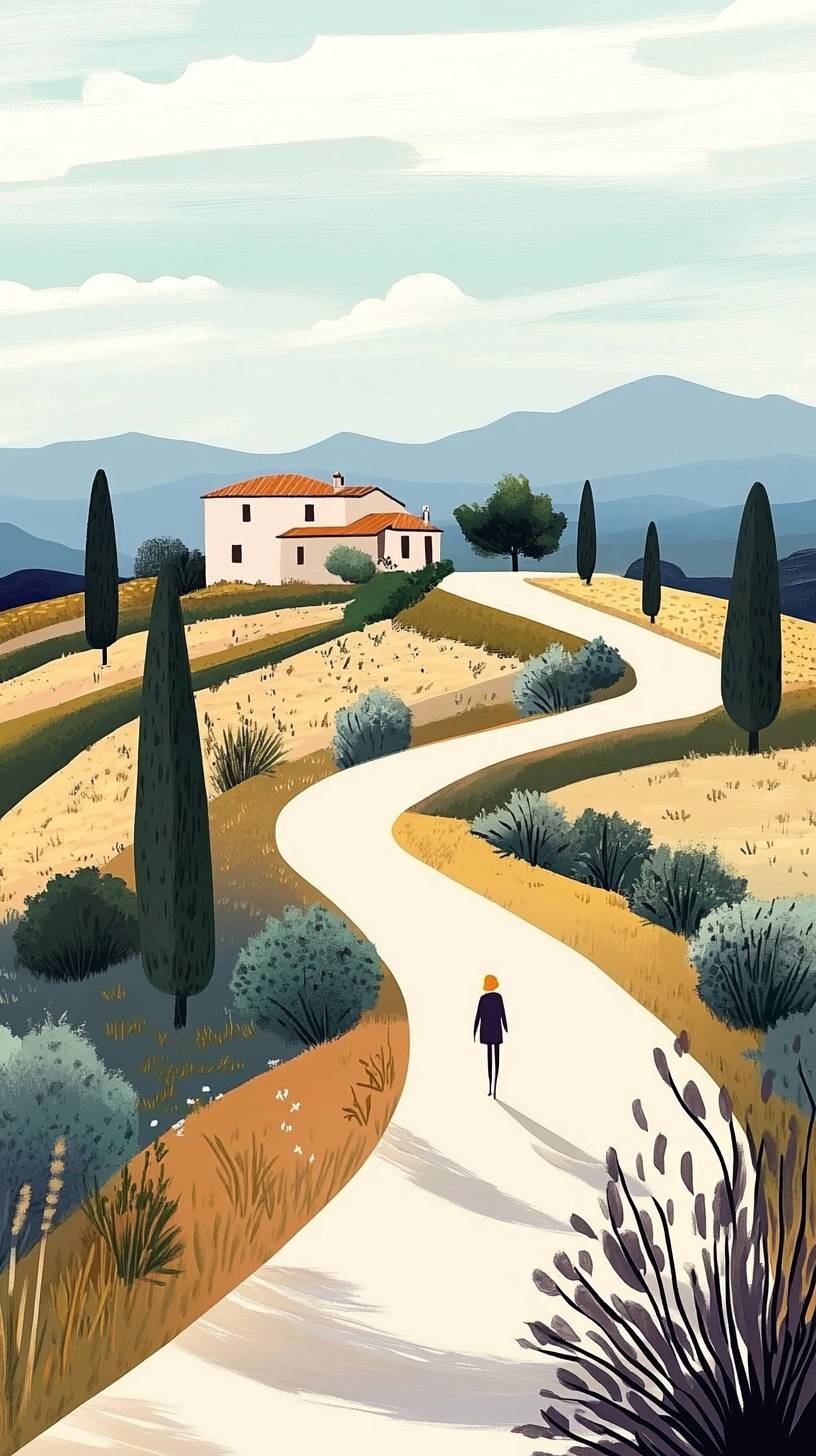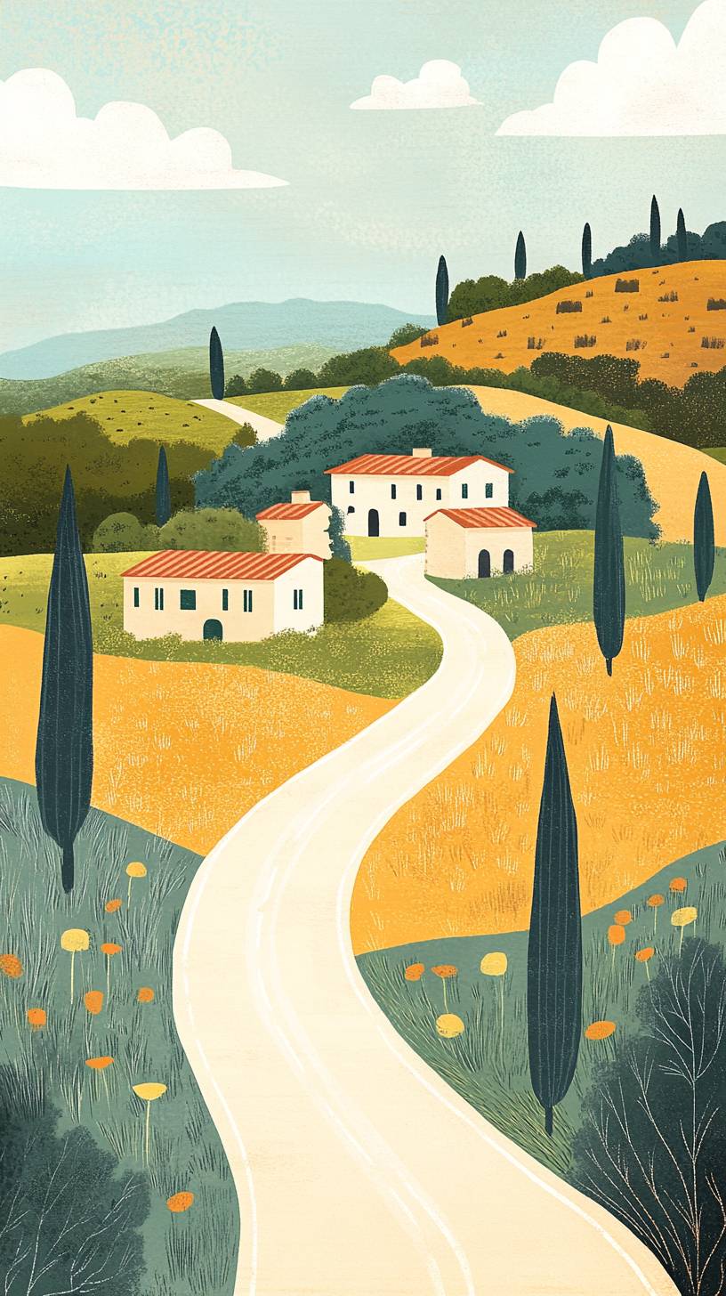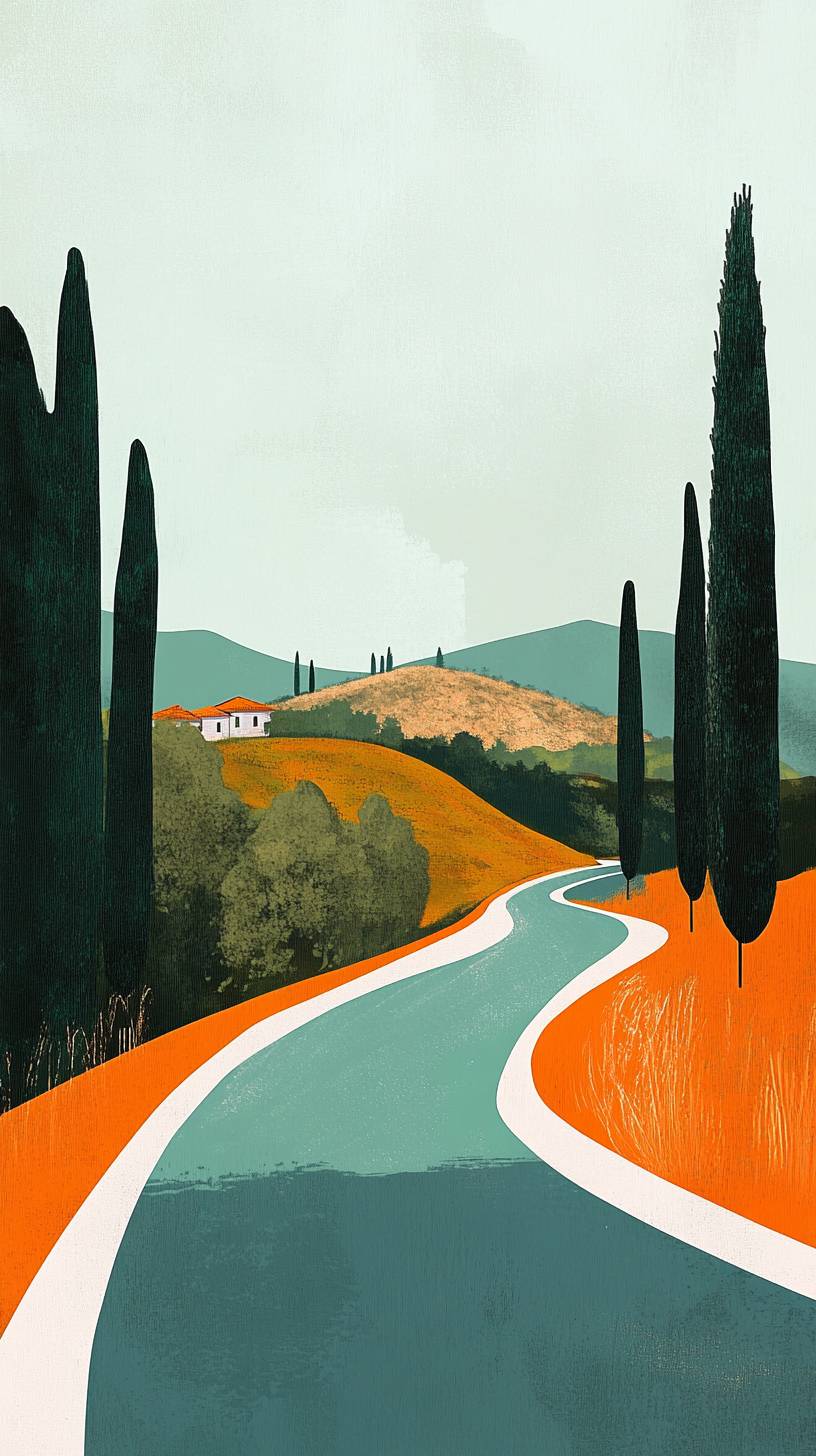 Illustrator Sammi Sylvaniotis created road, for children, against a Tuscan scene in the background. The illustration has a unique style, with a minimalistic aesthetic, reminiscent of artists like Alex Katz and Rinko Kawauchi. It is a narrative piece with a focus on close-ups and rich textures, similar to the work of Ben Wooten. --ar 51:91 --v 6.1