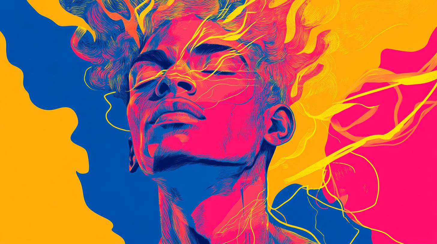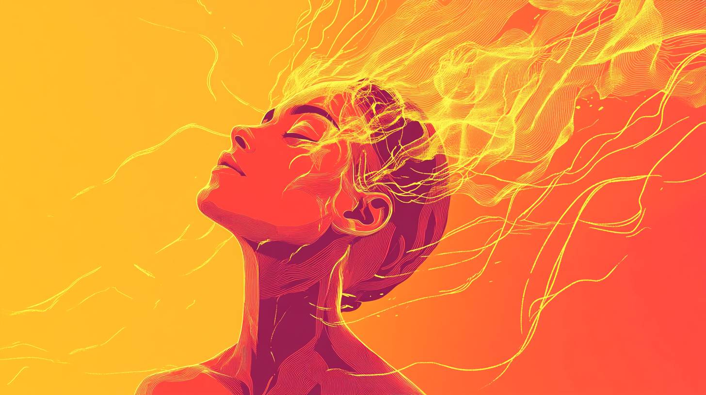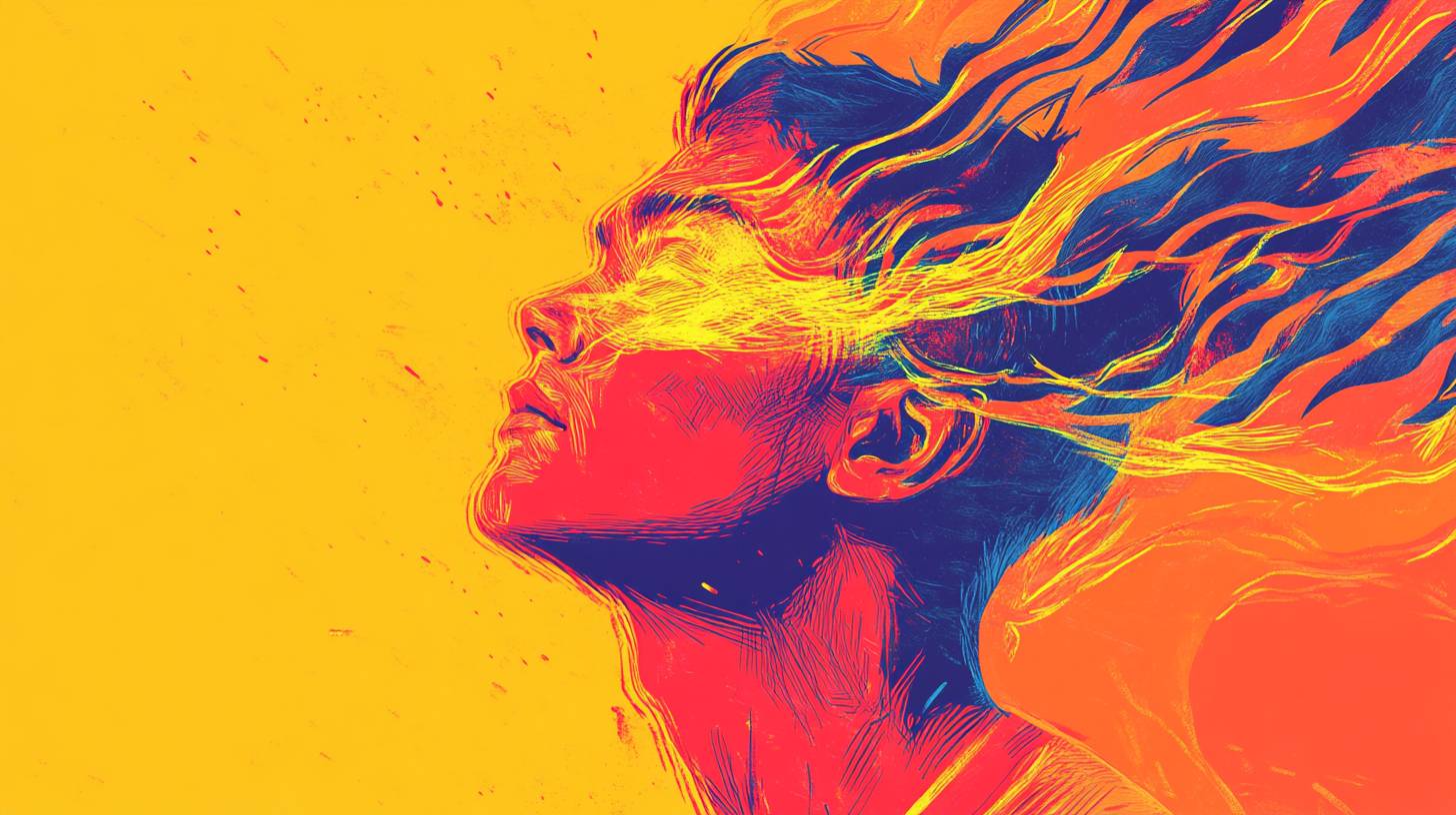 summer head portrait posing de the flash with fire engine trails, flat2d, minimal character, chalk effect risograph, vector line art, vibrant colors --ar 16:9 --style raw