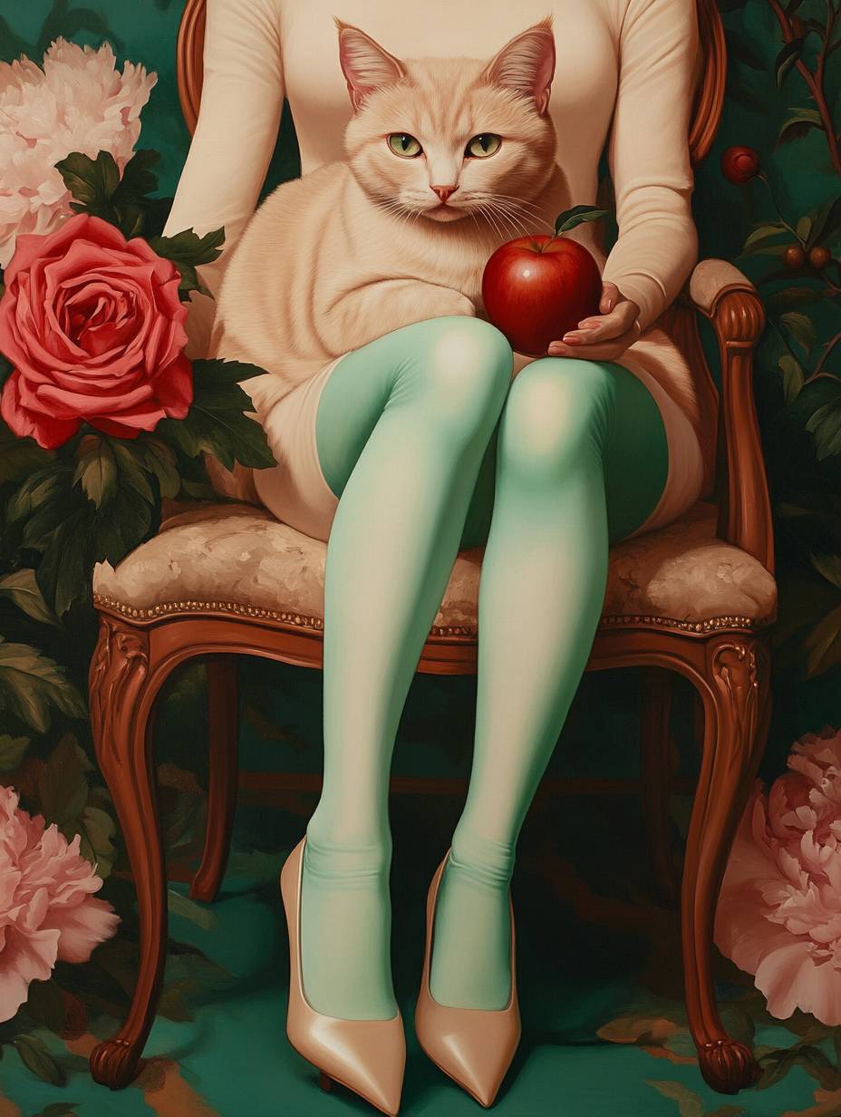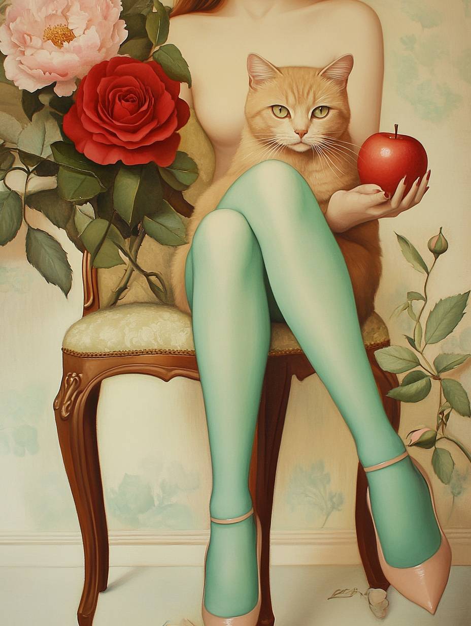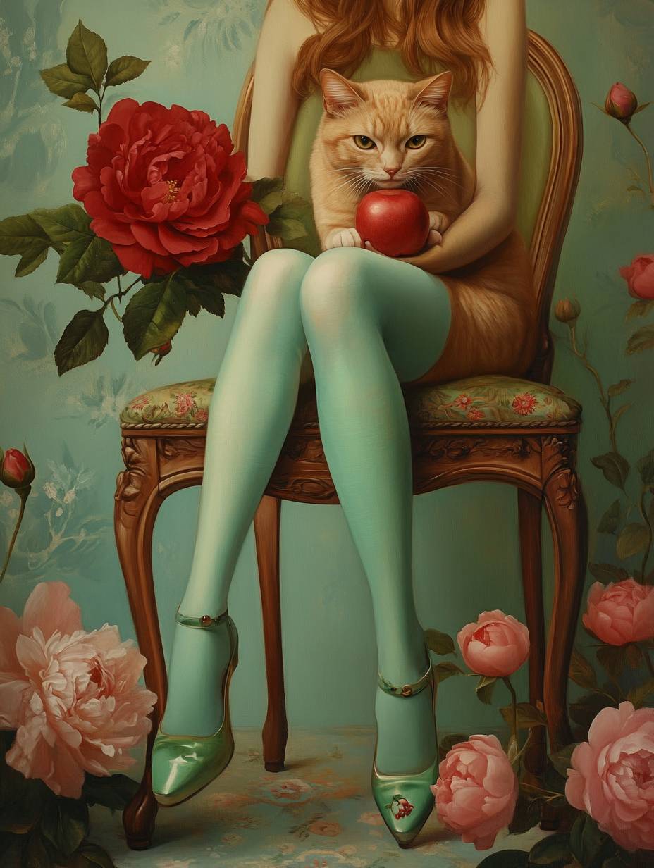 Ein Ölgemälde einer Katze, die auf einem Stuhl sitzt, mit einer roten Rose, rosa Pfingstrosen und grünen Blättern im Hintergrund. Die Beine einer Frau, die mintfarbene Strumpfhosen und hohe Schuhe trägt, halten einen Apfel. Die Komposition ist symmetrisch, im Stil von Ray Caesar.