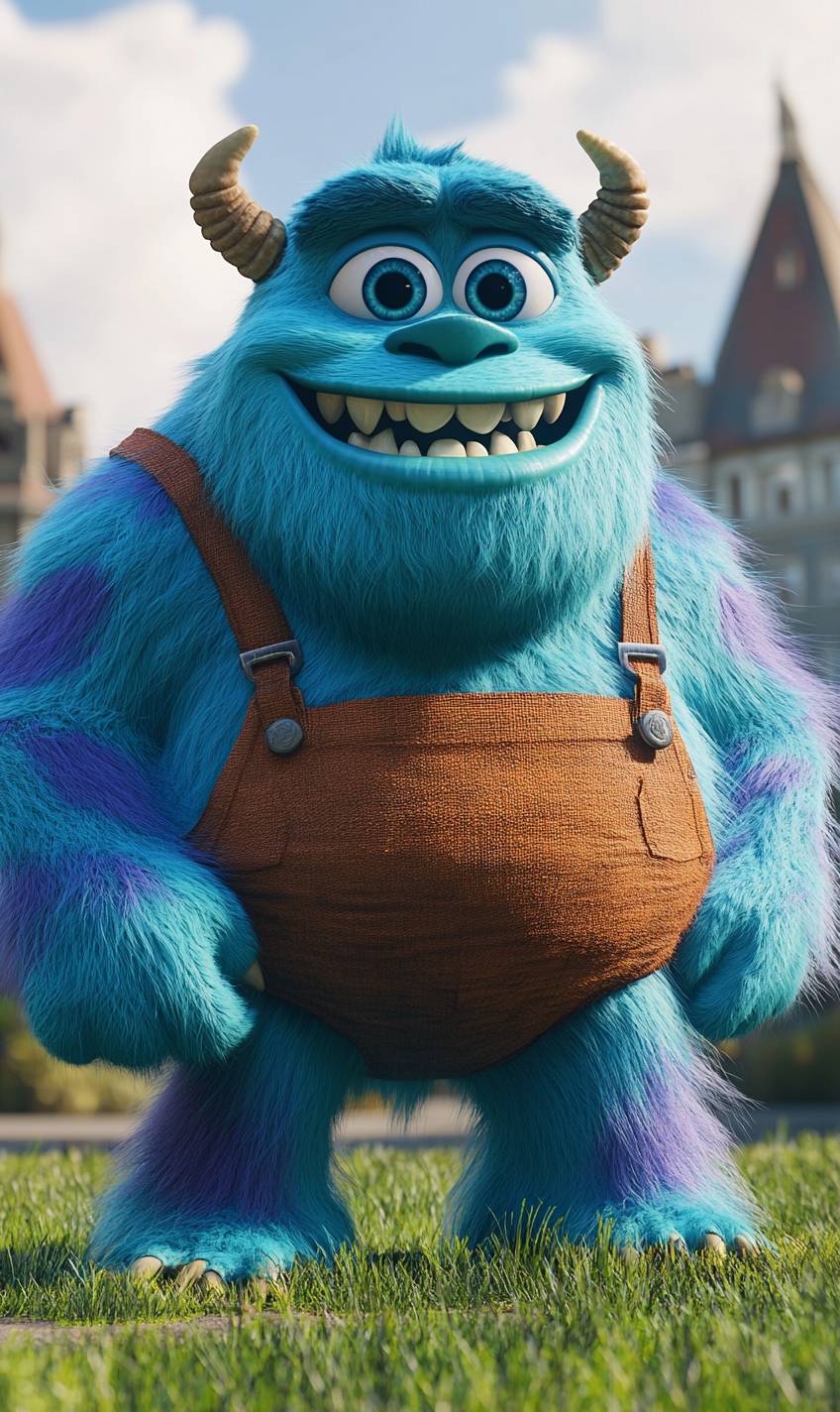 A 3D render of Sulley from Monsters, Inc. Sulley is a large, blue, furry monster with a wide grin and large eyes. He is wearing a orange jumpsuit. Sulley is standing on a grassy field. The background contains a large building with windows --v 6.1 --ar 3:5