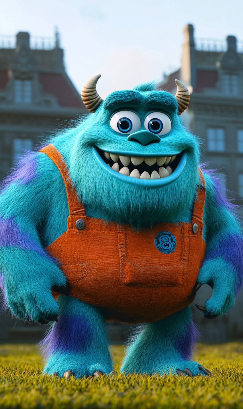 Eine 3D-Darstellung von Sulley aus Die Monster AG. Sulley ist ein großer, blauer, pelziger Monster mit einem breiten Grinsen und großen Augen. Er trägt einen orangefarbenen Overall. Sulley steht auf einem grasbewachsenen Feld. Im Hintergrund befindet sich ein großes Gebäude mit Fenstern.