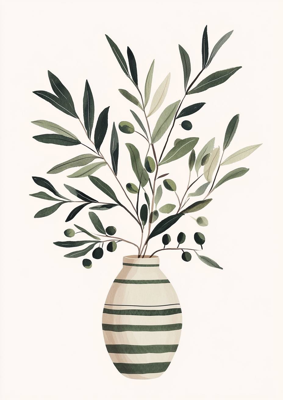 A hand-painted illustration of a vase with olive branches, in a minimalist and natural style, inspired by Mediterranean decor and naive folk art. The vase has vertical green and white stripes, placed on a matching striped cloth. The olive branches have elongated, soft green leaves and small green olives, arranged symmetrically. The colors are muted and earthy, with a pale beige background. The style mimics a hand-drawn, watercolor effect with soft edges and textured brushstrokes, reminiscent of Henri Matisse’s simplified forms and William Morris’s decorative nature-inspired motifs. The overall look is calm, rustic, and Mediterranean-inspired --ar 5:7 --v 6.1