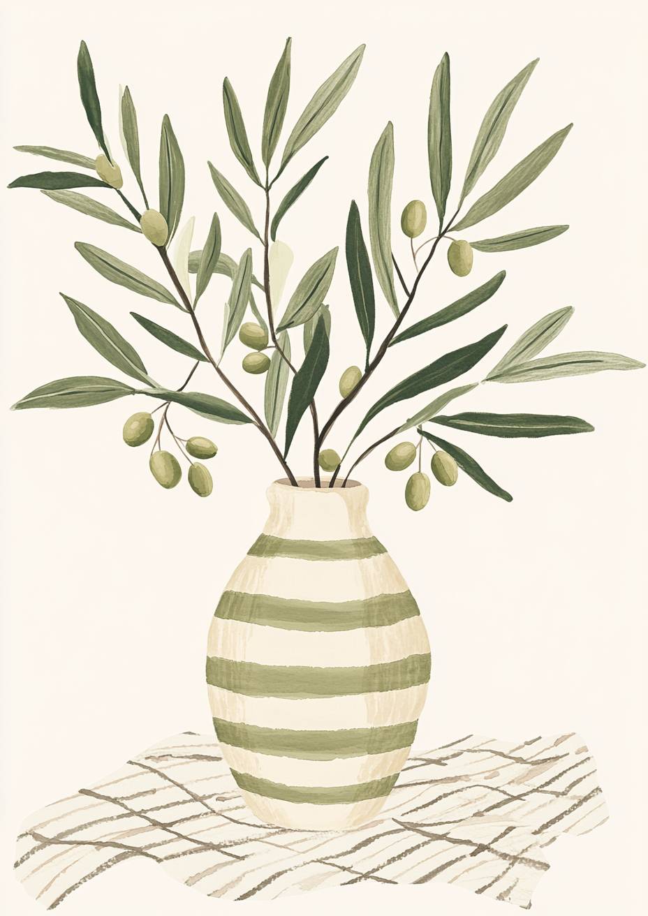 Eine handgemalte Illustration einer Vase mit Olivenzweigen in einem minimalistischen und natürlichen Stil, inspiriert von mediterraner Dekoration und naiver Volkskunst. Die Vase hat vertikale grüne und weiße Streifen und steht auf einem passenden gestreiften Tuch. Die Olivenzweige haben verlängerte, weiche grüne Blätter und kleine grüne Oliven, die symmetrisch angeordnet sind. Die Farben sind gedämpft und erdig, mit einem hellbeigen Hintergrund. Der Stil ahmt einen handgezeichneten, aquarellartigen Effekt mit sanften Rändern und texturierten Pinselstrichen nach, der an die vereinfachten Formen von Henri Matisse und die dekorativen, naturinspirierten Motive von William Morris erinnert. Der Gesamteindruck ist ruhig, rustikal und vom Mittelmeer inspiriert.