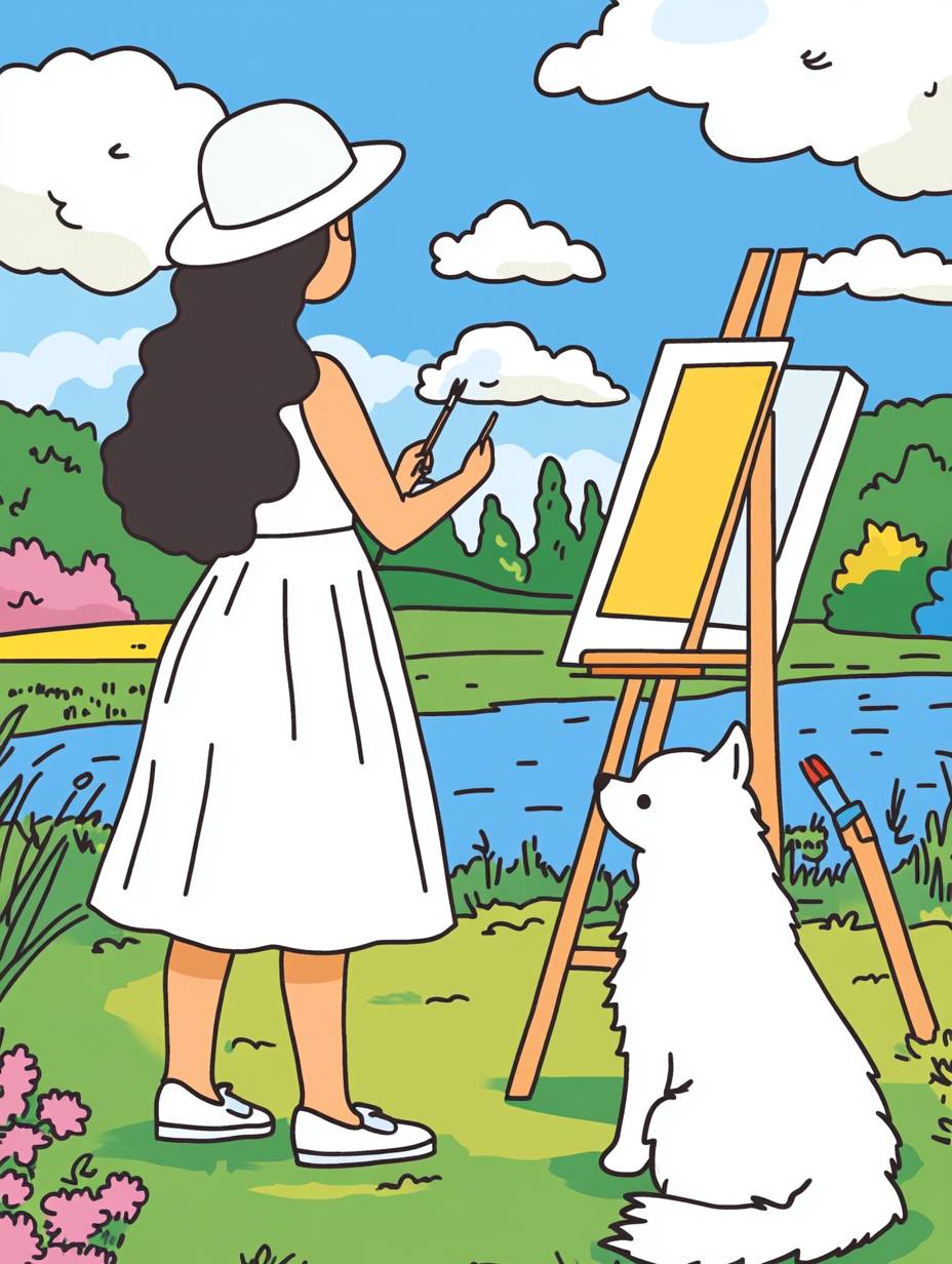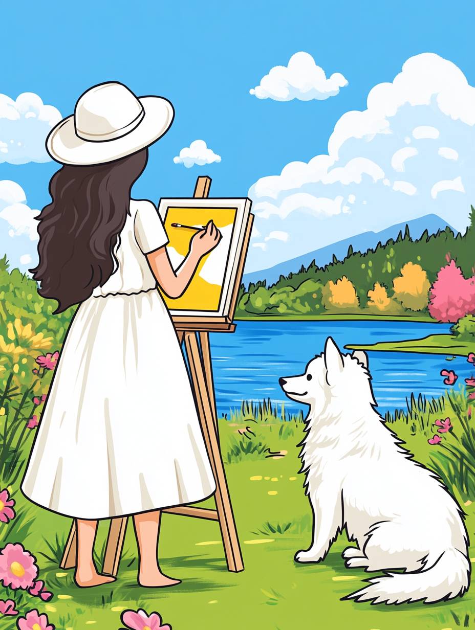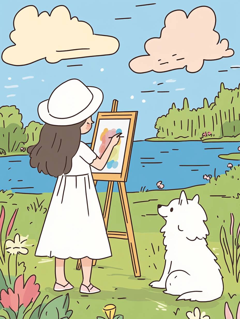 A girl in a white dress and sun hat stands painting on an easel in the grass, her Samoyed dog sitting nearby. bold lines and solid colors,doodle in the style of Keith Haring,minimalism,The background features a blue sky, green meadow, lake, Pink flowers, colorful, and clouds, comic color and bold lines. A simple illustration in the style of a children's book. --ar 3:4 --iw 2 --v 6.1