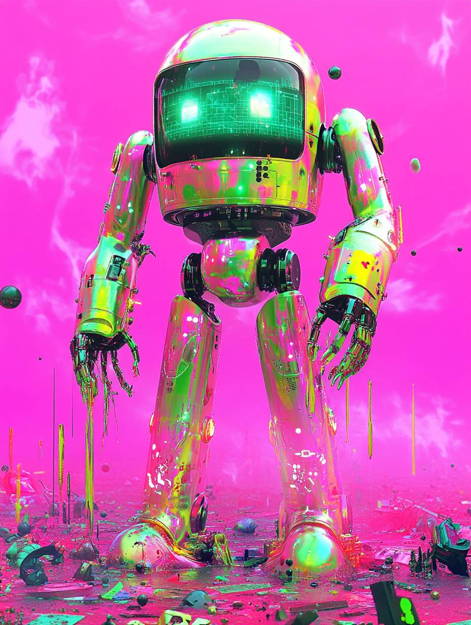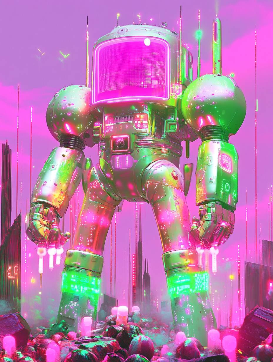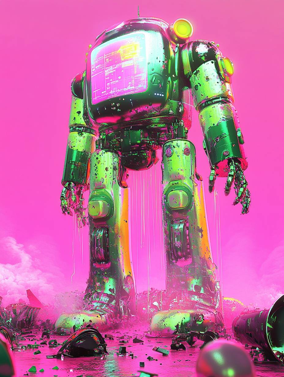 cyberpunk noir style, machine uprising, colossal android warrior looms over a graveyard of human remains, its metallic body gleaming with internal energy and advanced weaponry, holographic interface, pulsing energy cores, scattered tech debris, imposing figure towering over destruction, post-apocalyptic battlefield strewn with remnants, neon accents with deep shadows, moody atmospheric lighting, dark metallic color palette, --ar 3:4 --style raw --sref 2096263774 --v 6.1