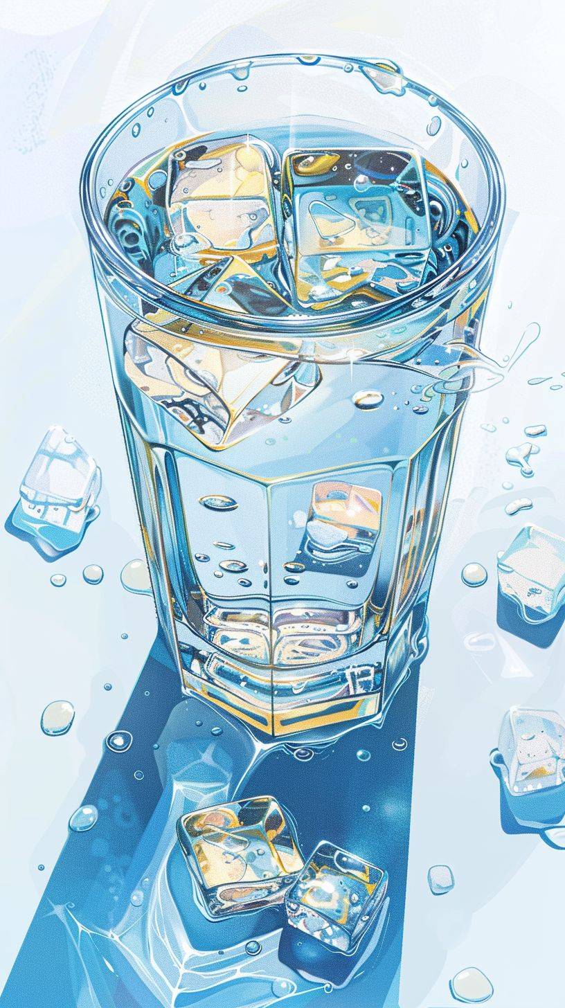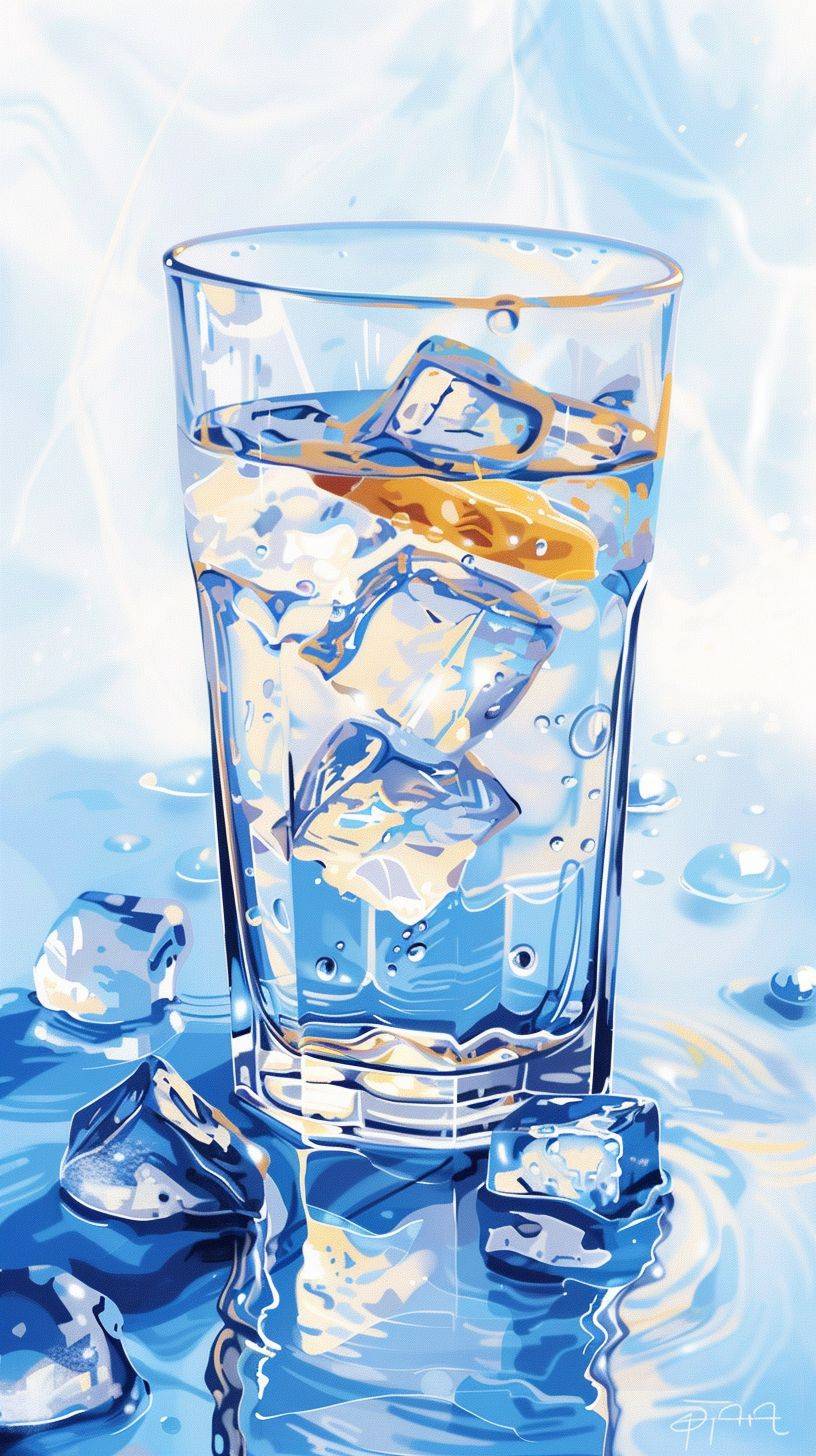 Ein transparenter Glass befindet sich in der Position 2/3 des Bildes, blickt aus einem Winkel von 45° nach unten, wobei nur 1/3 des Mundes des Glases sichtbar ist. Mehrere Eiswürfel schwimmen auf der Wasseroberfläche, von denen einer zu groß ist. Der Boden des Glases sollte nicht auf dem Bildschirm angezeigt werden. Im transparenten Glas befinden sich Eiswürfel und gelbe Pfirsichfruchtfleisch, und das Wasser im Glas ist blassgelb. Der Hintergrund ist himmelblau und kühl, im Stil einer handgezeichneten Illustration.